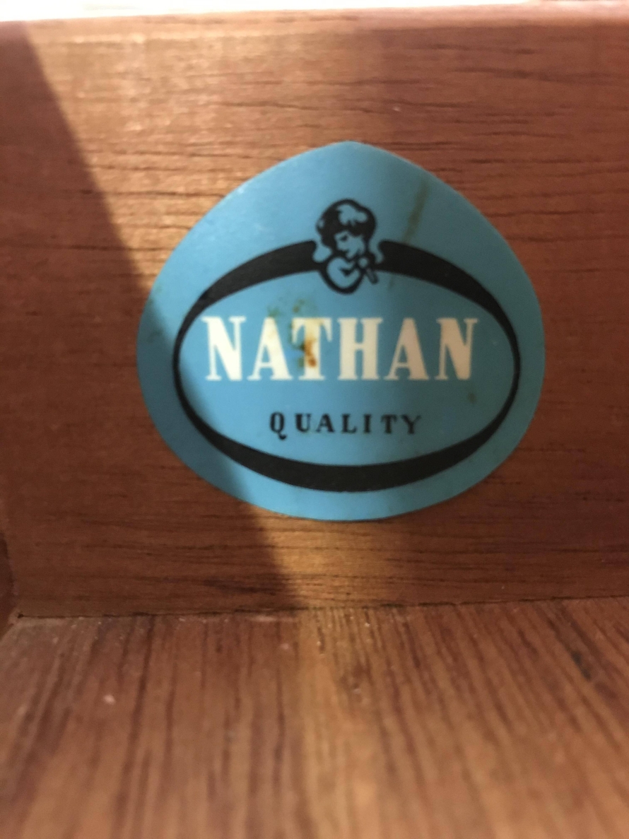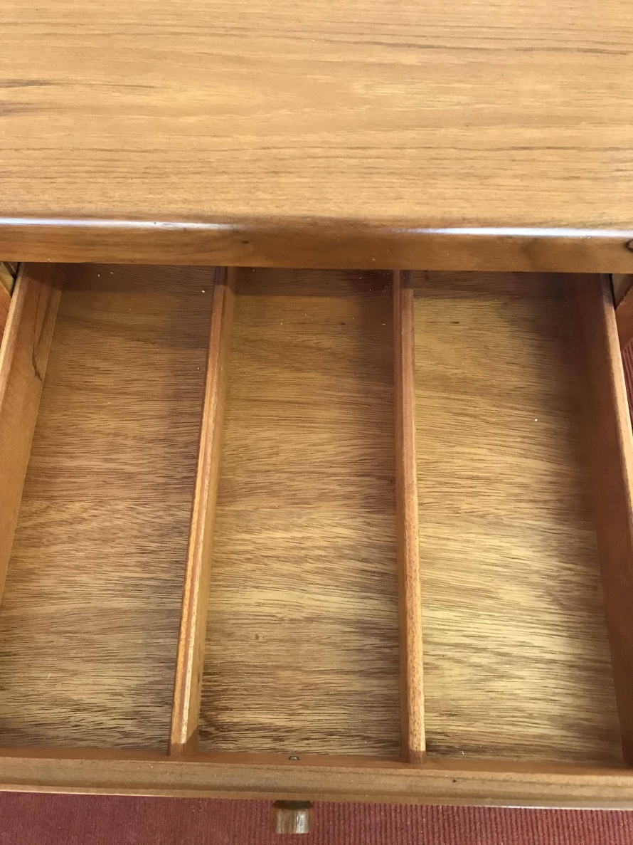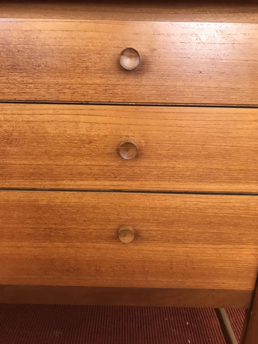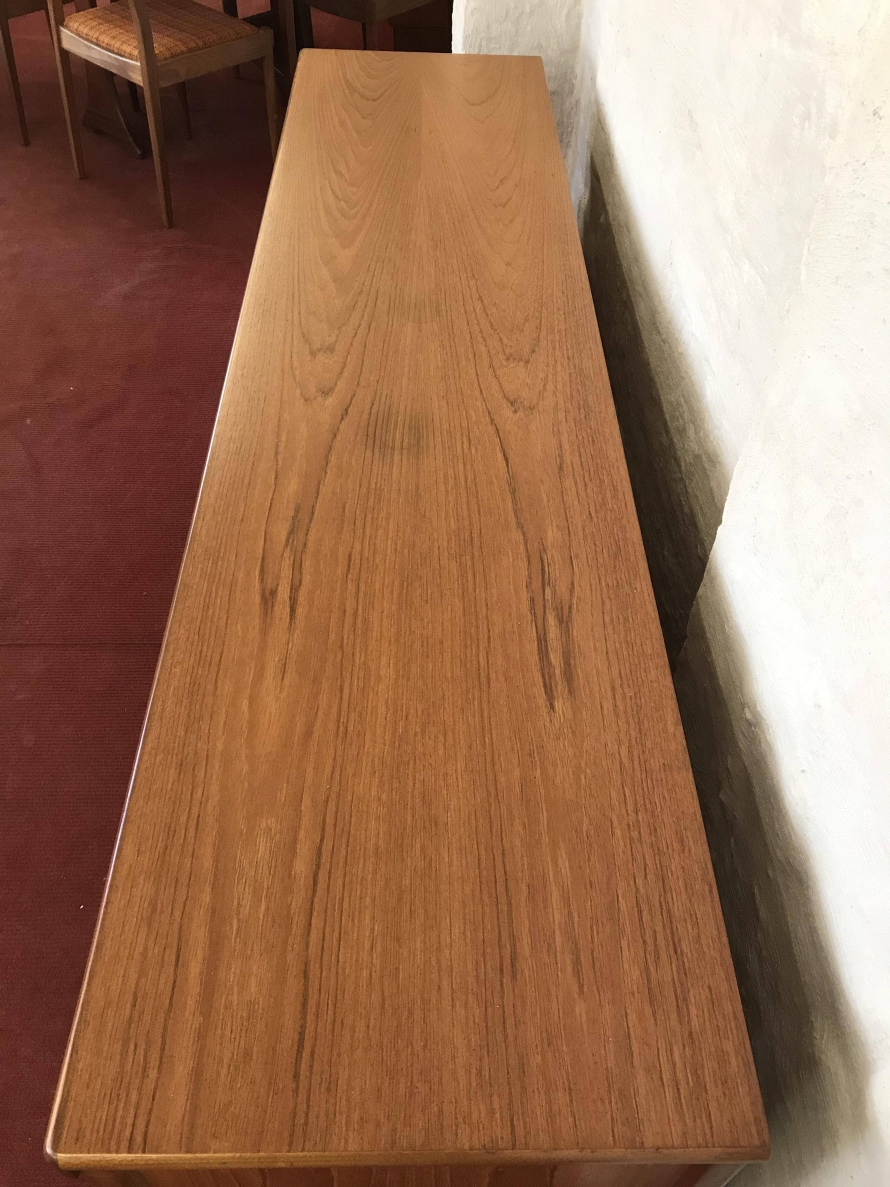 This mid-century teak sideboard/credenza features an inlaid veneer, drop down drinks cabinet, a large main compartment with a shelf, and three drawers graduating in size.