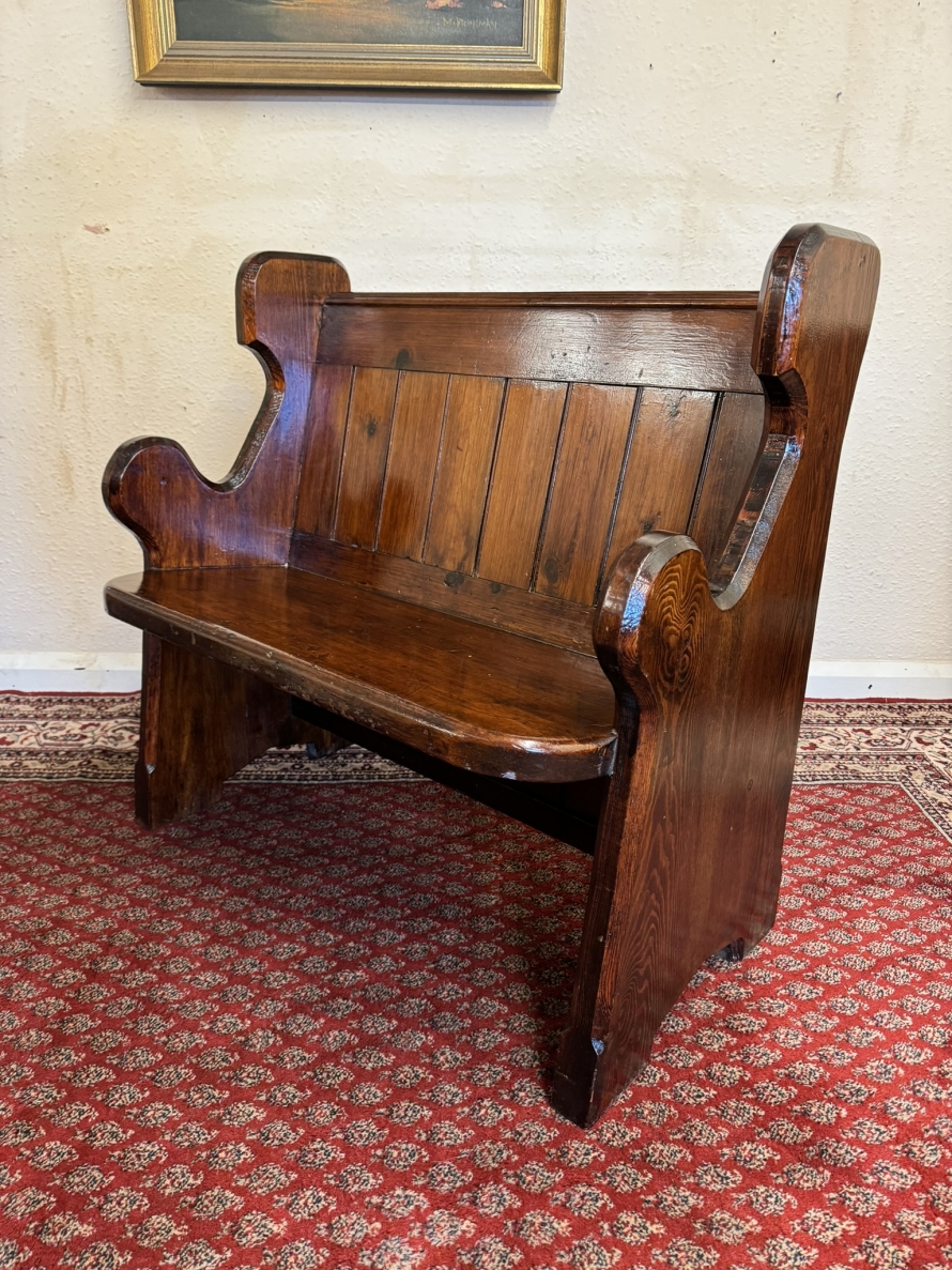 This lovely pew with its small proportions could be used in numerous locations around the house such as the hallway, top of the stairs & kitchen. Having two shaped arms, boarded back rest and a solid seat.