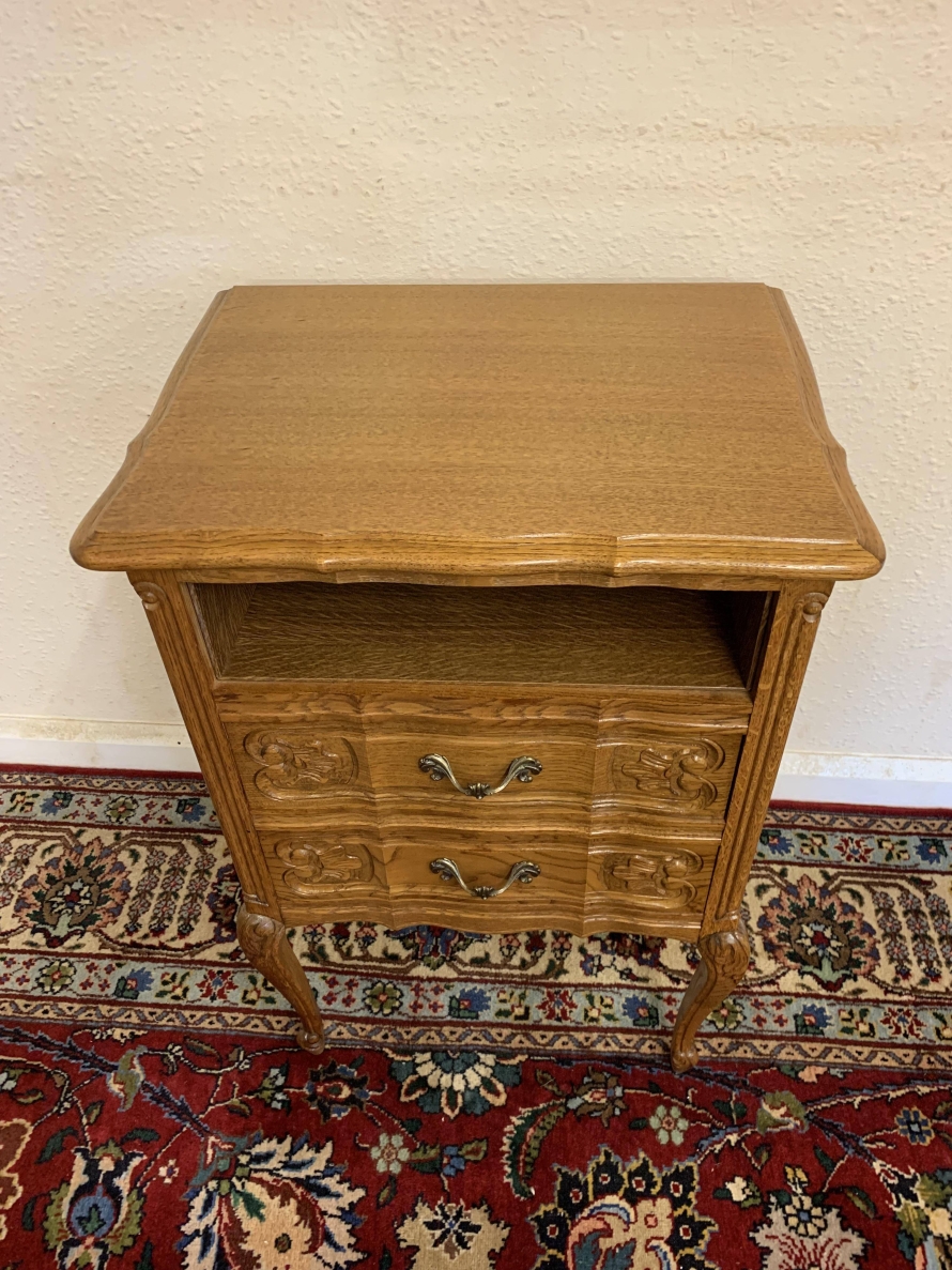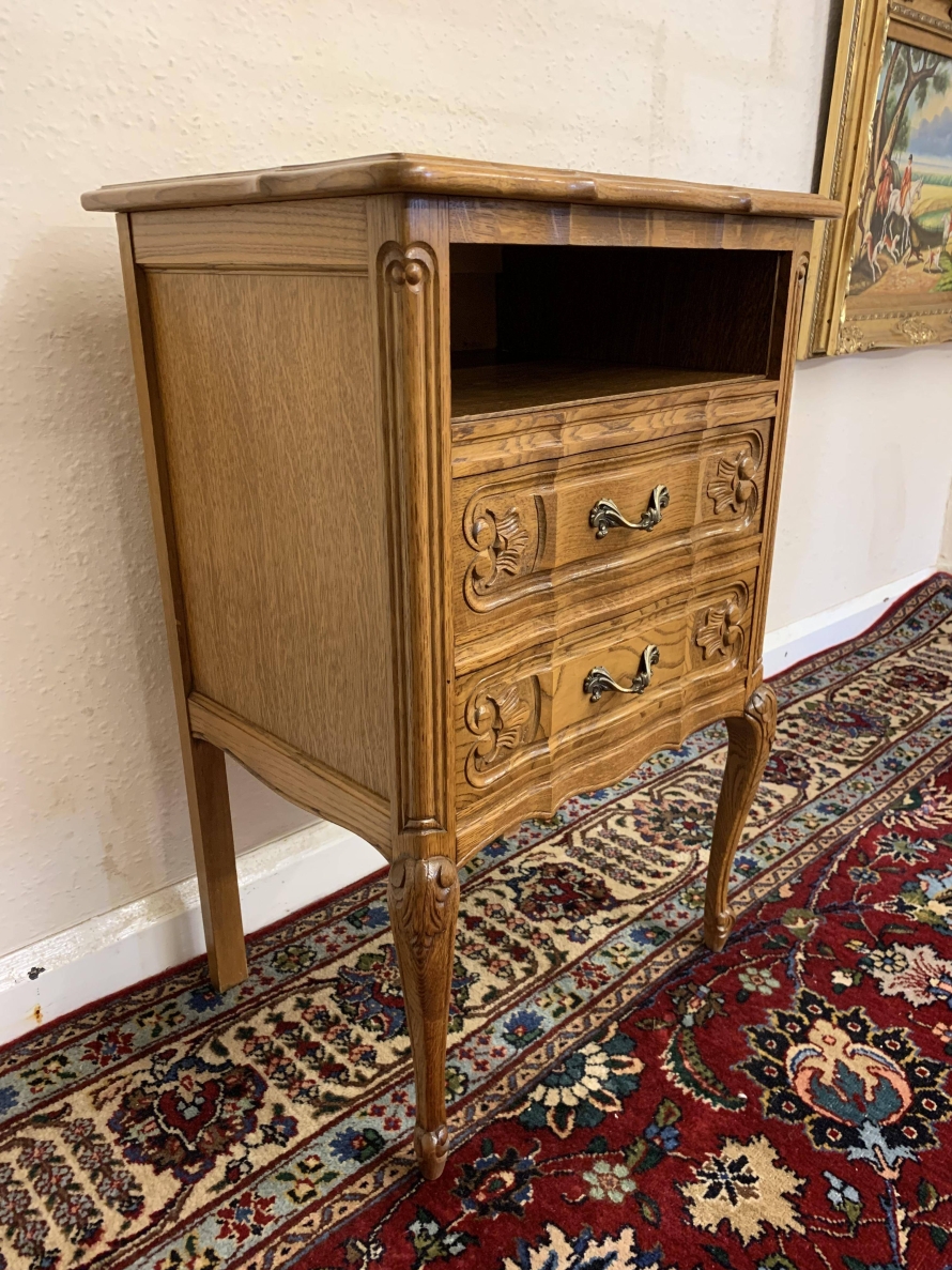 The shaped oversailing top sits above an open shelf which in turn sits above two carved recessed panelled drawers, each drawer having ornate brass handle. Recessed panelled sides, shaped skirt – this beautiful chest of drawers stands on two carved cabriole shaped legs to the front.