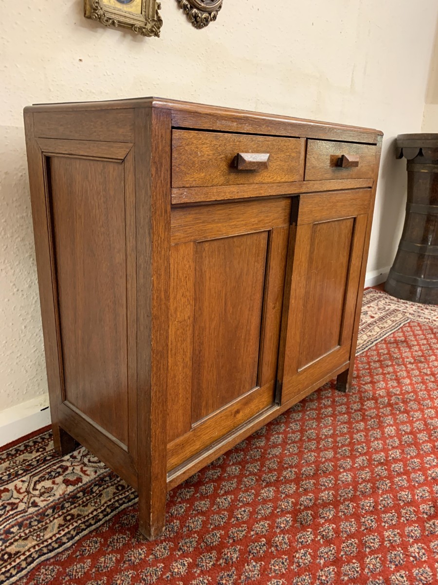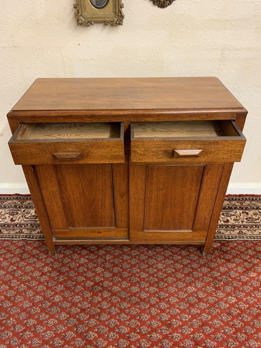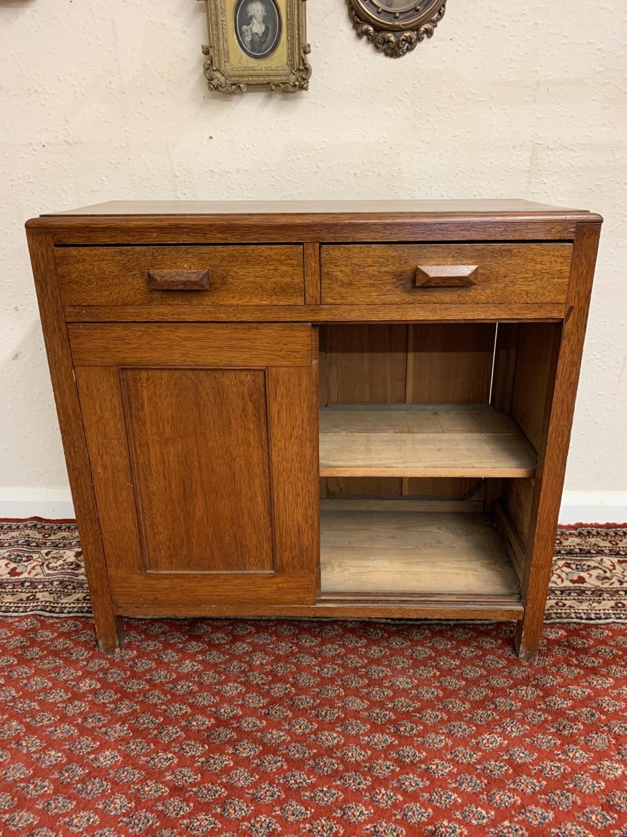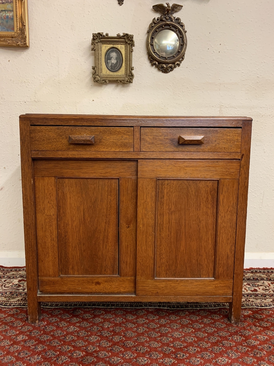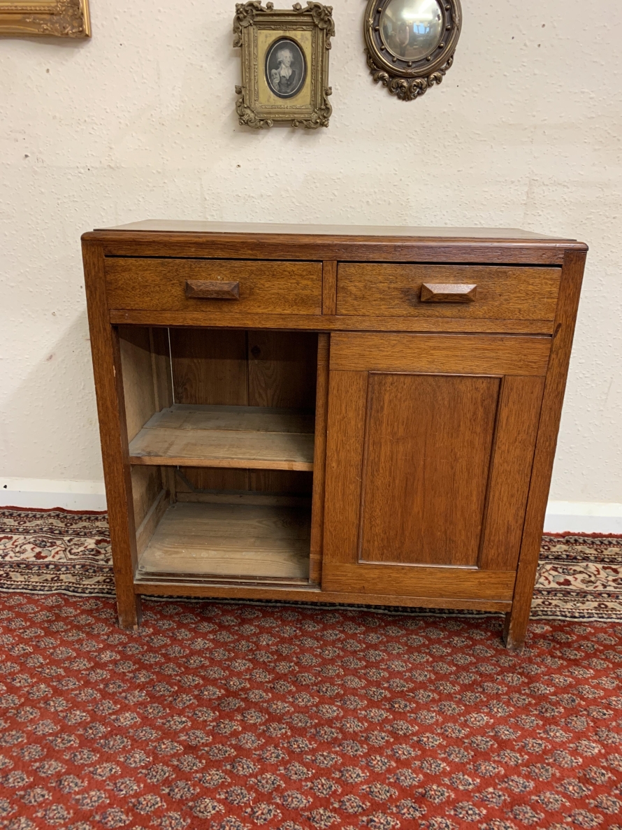 This neat cupboard dates circa 1930. Having two drawers, each with one handle which sit above a pair of sliding cupboard doors, the doors slide open to reveal a removable shelf. Recessed panelled sides and standing on four traditional block feet.