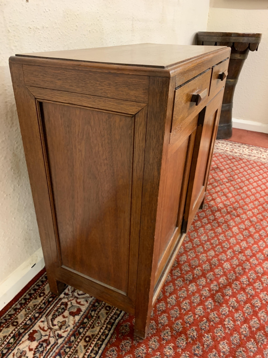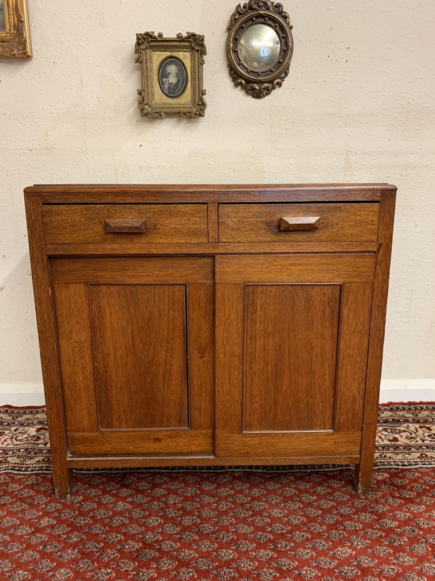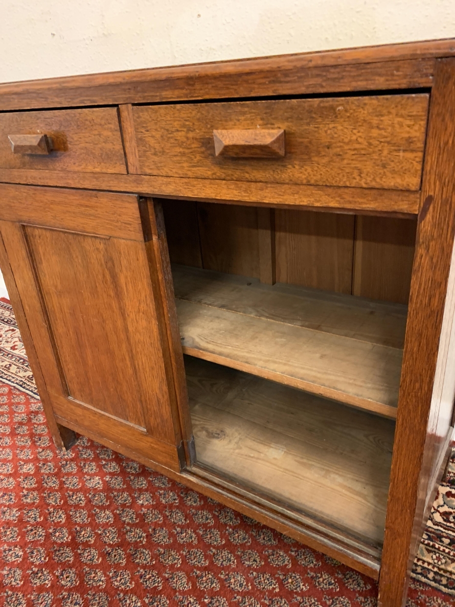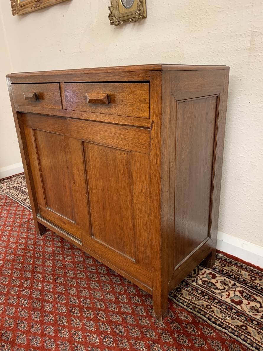 This neat cupboard dates circa 1930. Having two drawers, each with one handle which sit above a pair of sliding cupboard doors, the doors slide open to reveal a removable shelf. Recessed panelled sides and standing on four traditional block feet.