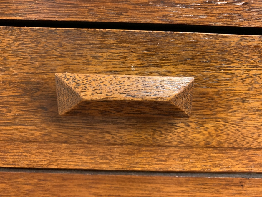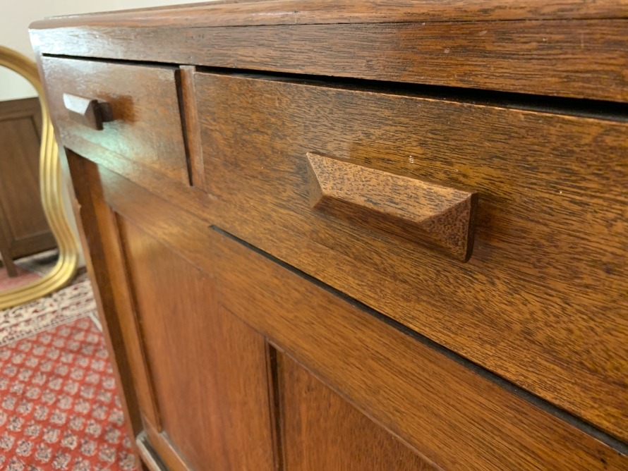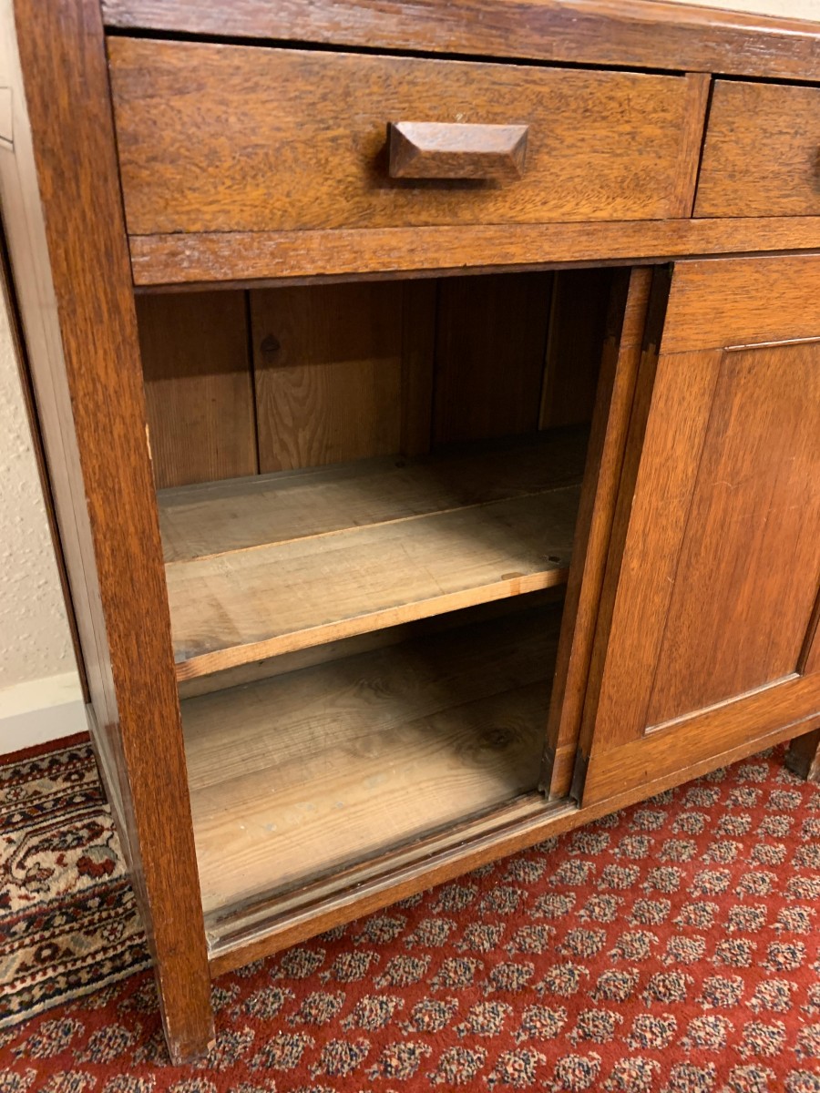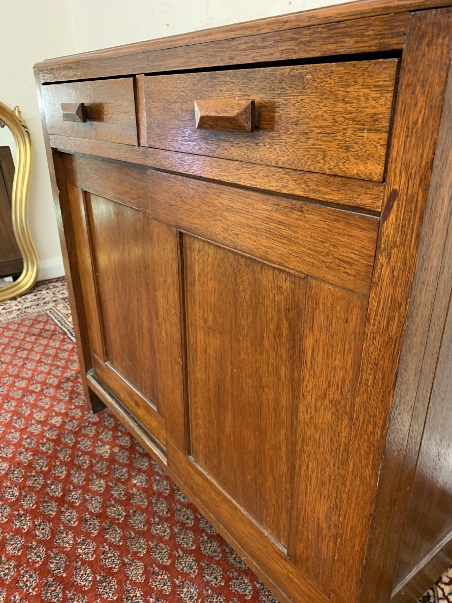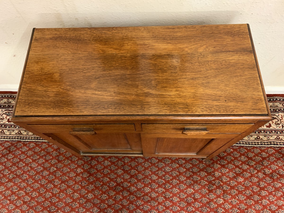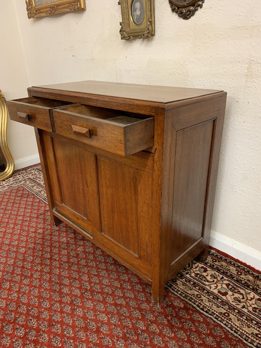 This neat cupboard dates circa 1930. Having two drawers, each with one handle which sit above a pair of sliding cupboard doors, the doors slide open to reveal a removable shelf. Recessed panelled sides and standing on four traditional block feet.