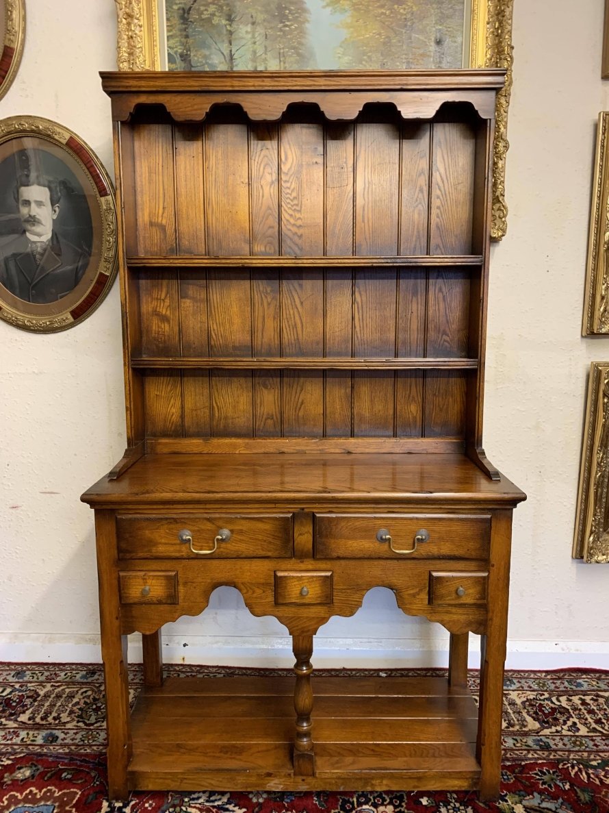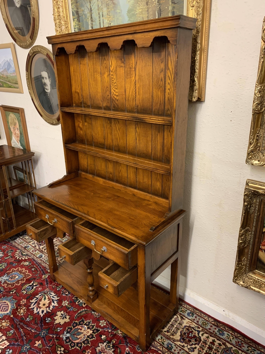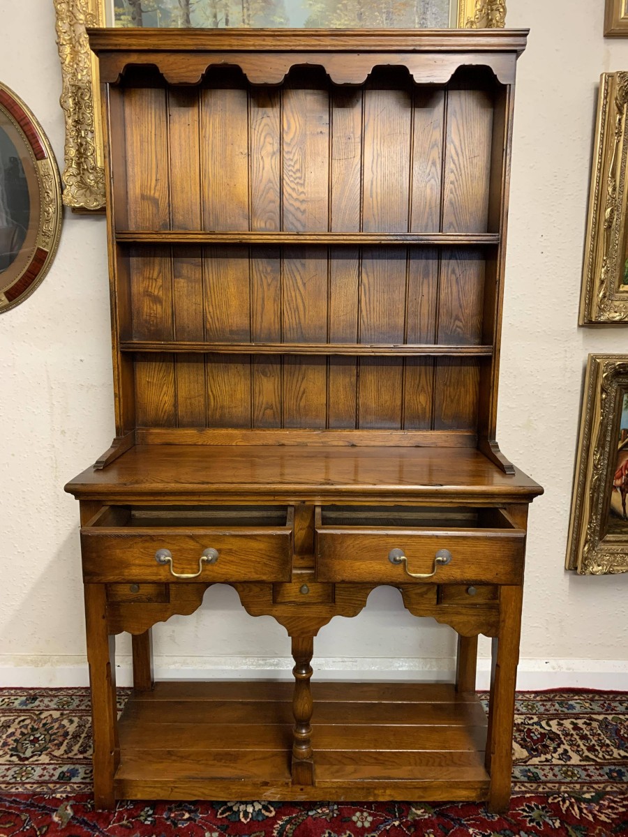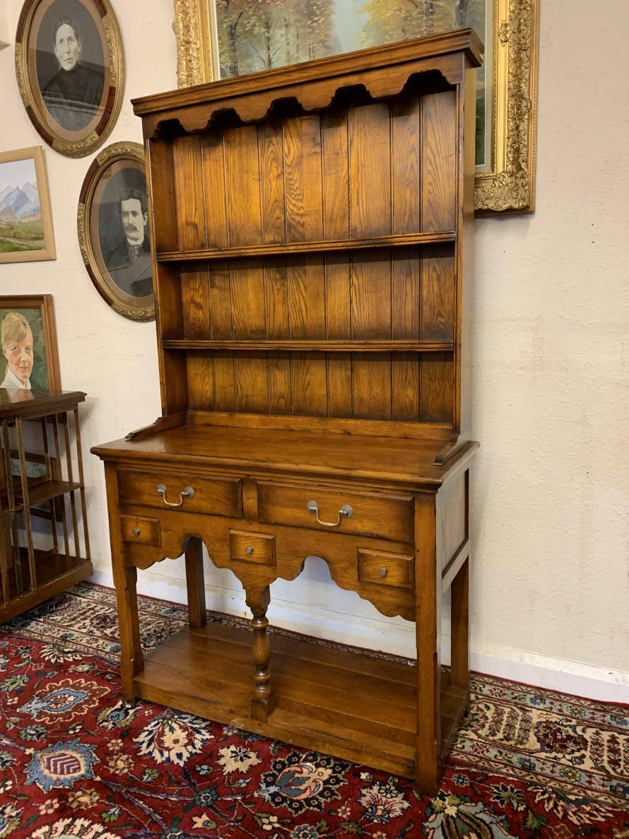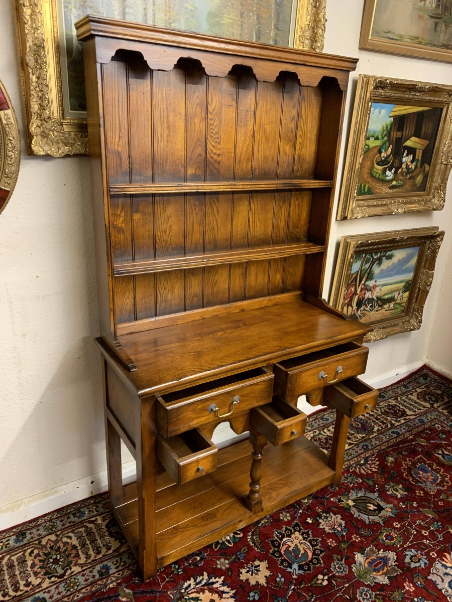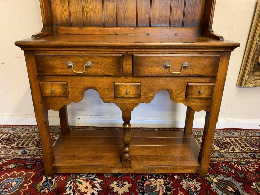 The removable plate rack back has a boarded back, wavy apron and two shelves. The dresser base has two drawers,each drawer having brass drop handle with three small drawers below, each with button brass knob handle. Having a boarded shelf, central turned column support and standing on four traditional block feet. Please note this item is made entirely in solid oak