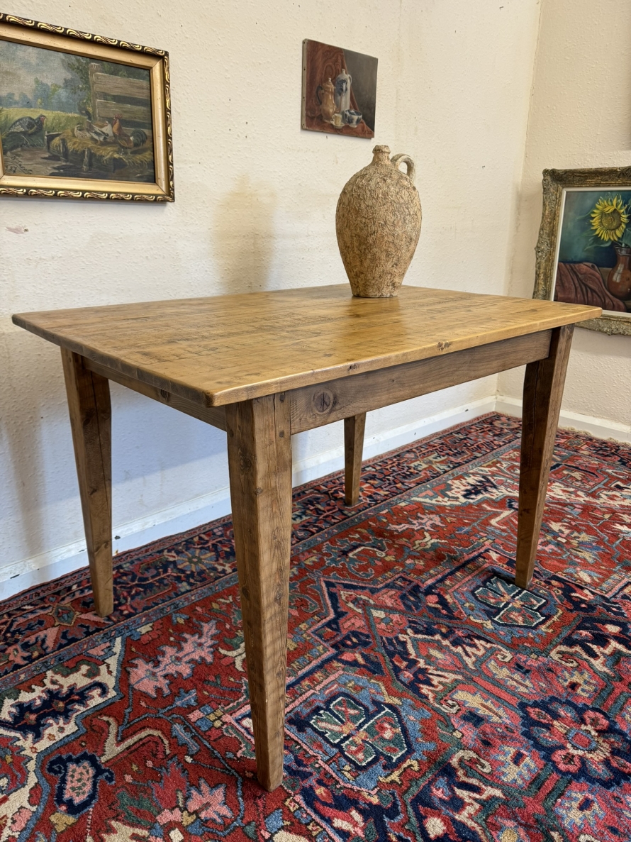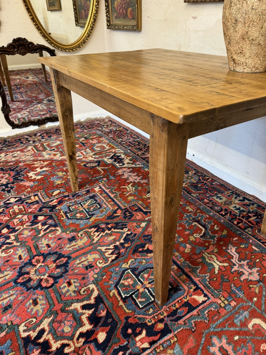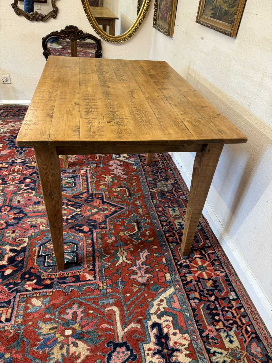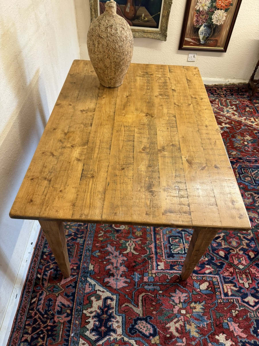This fabulous pine farmhouse table is in excellent condition; the planked top sits on four elegant tapered legs.