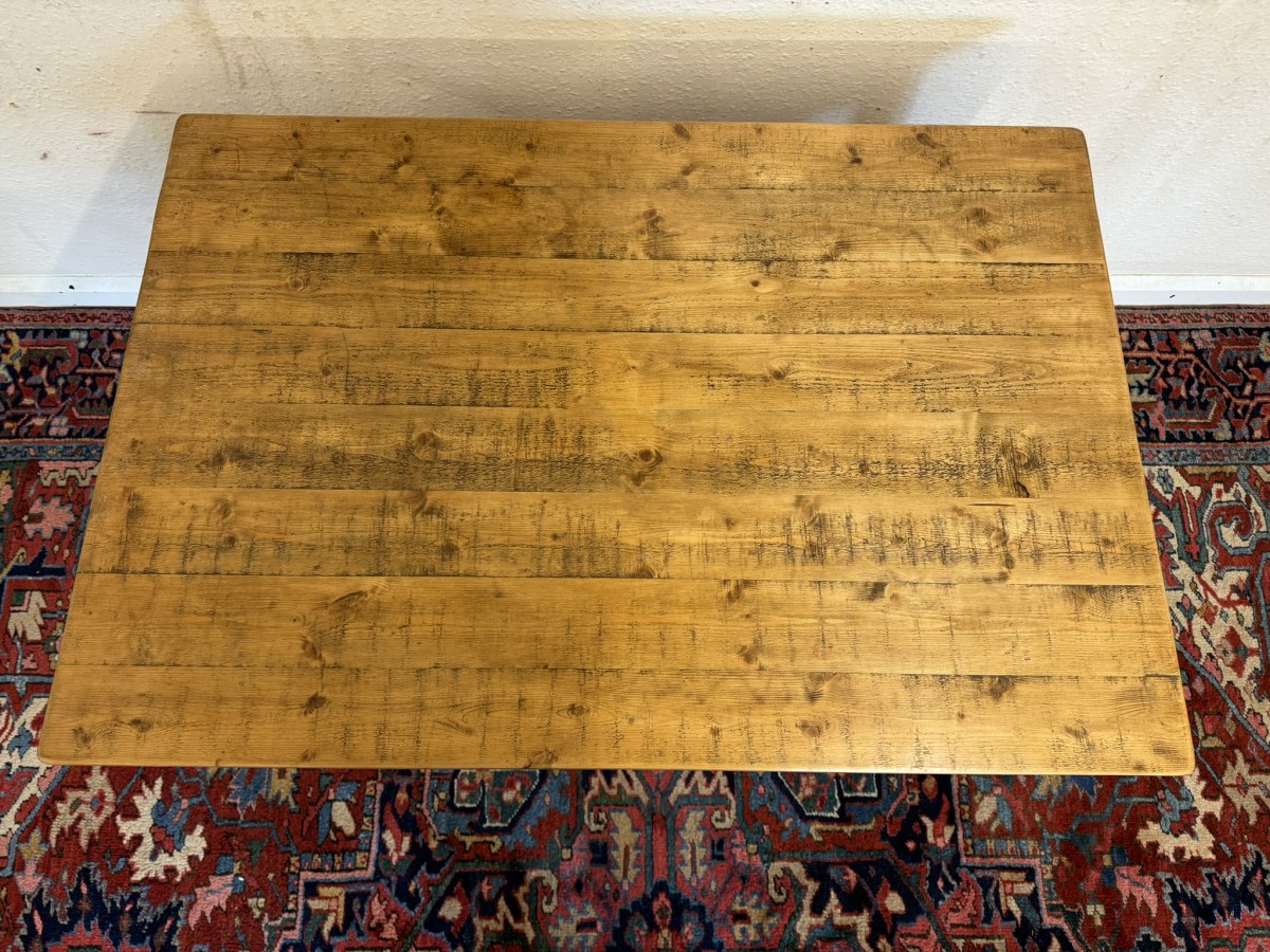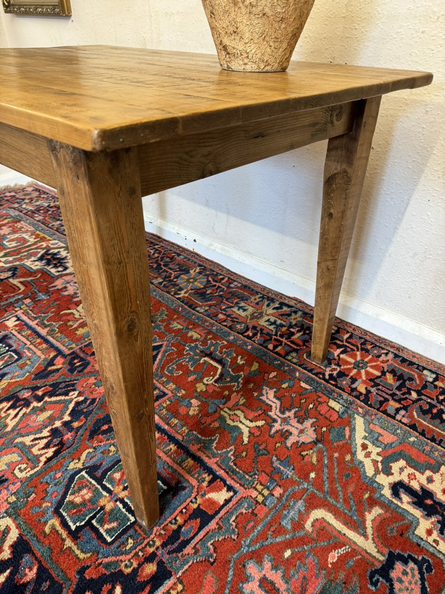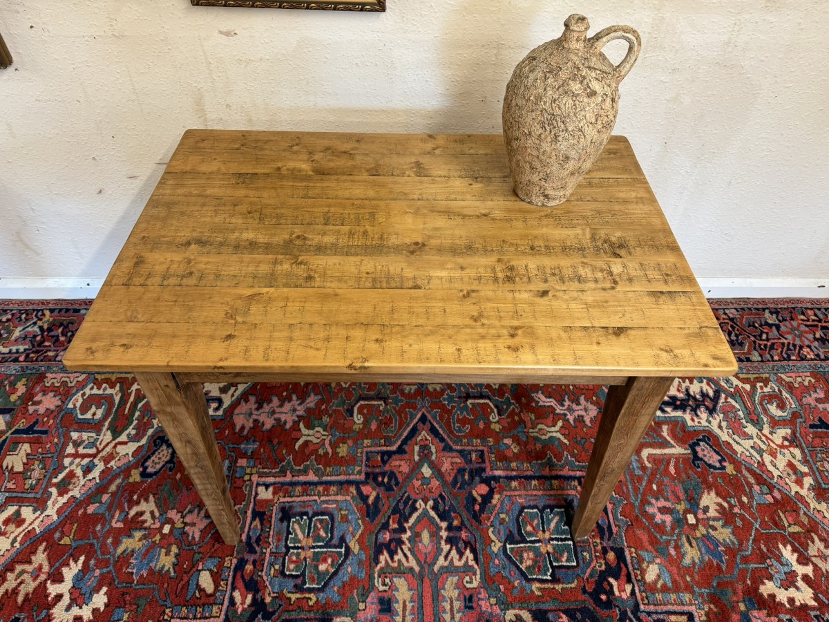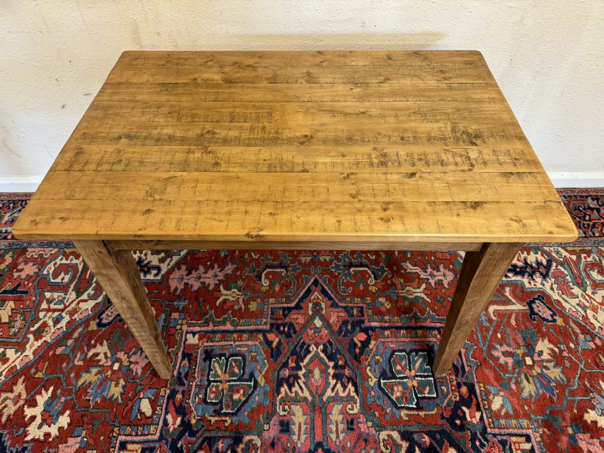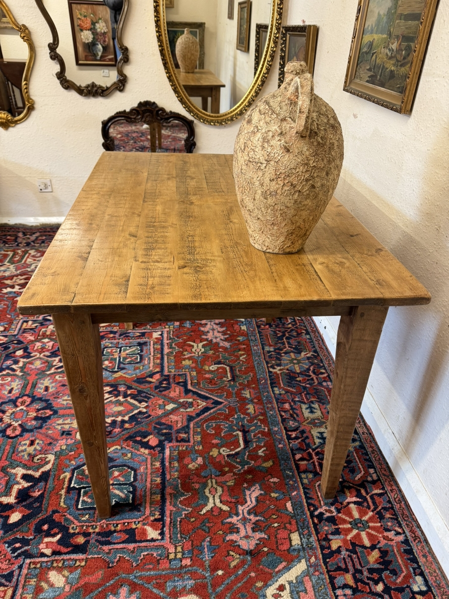 This fabulous pine farmhouse table is in excellent condition; the planked top sits on four elegant tapered legs.