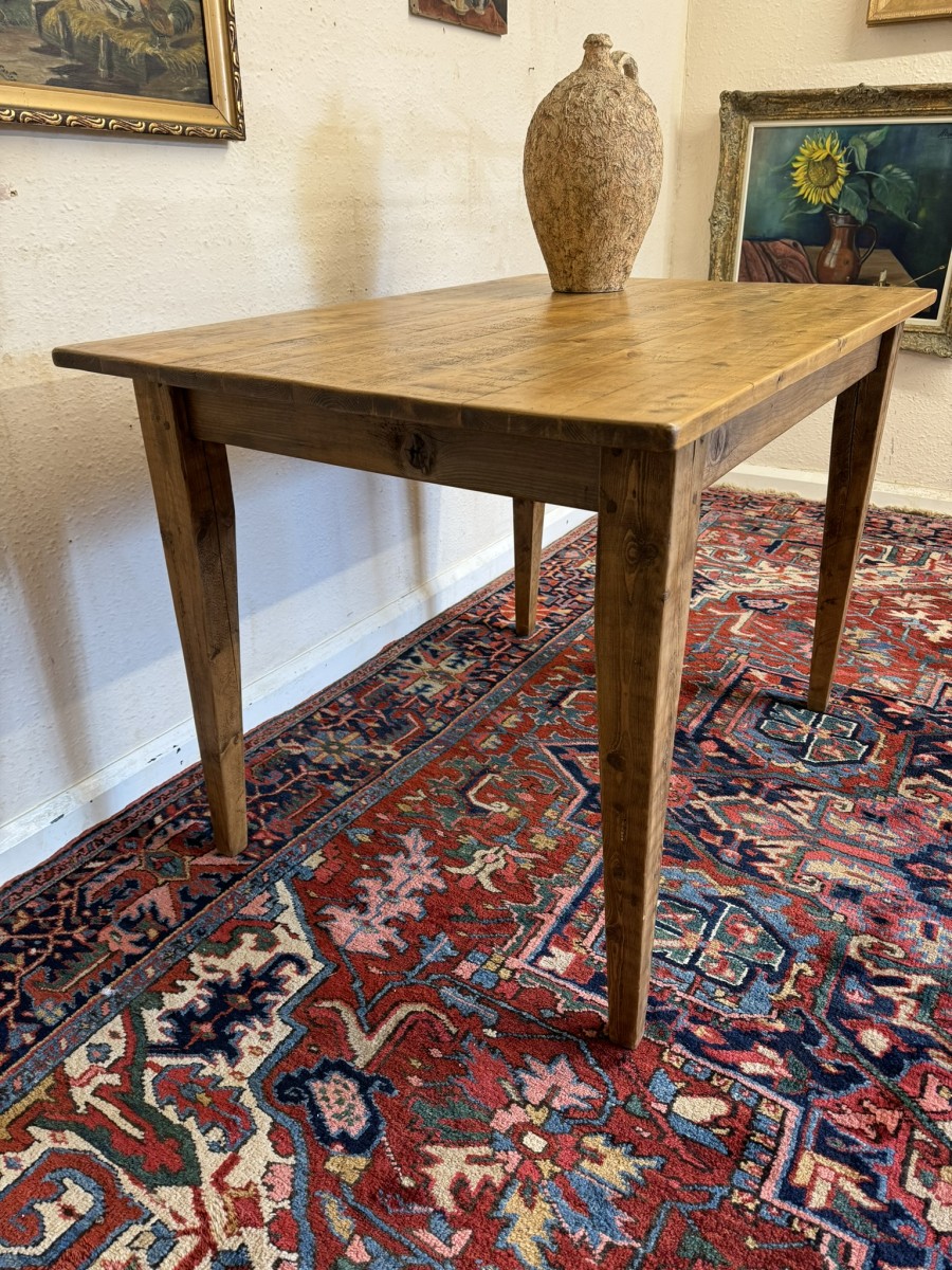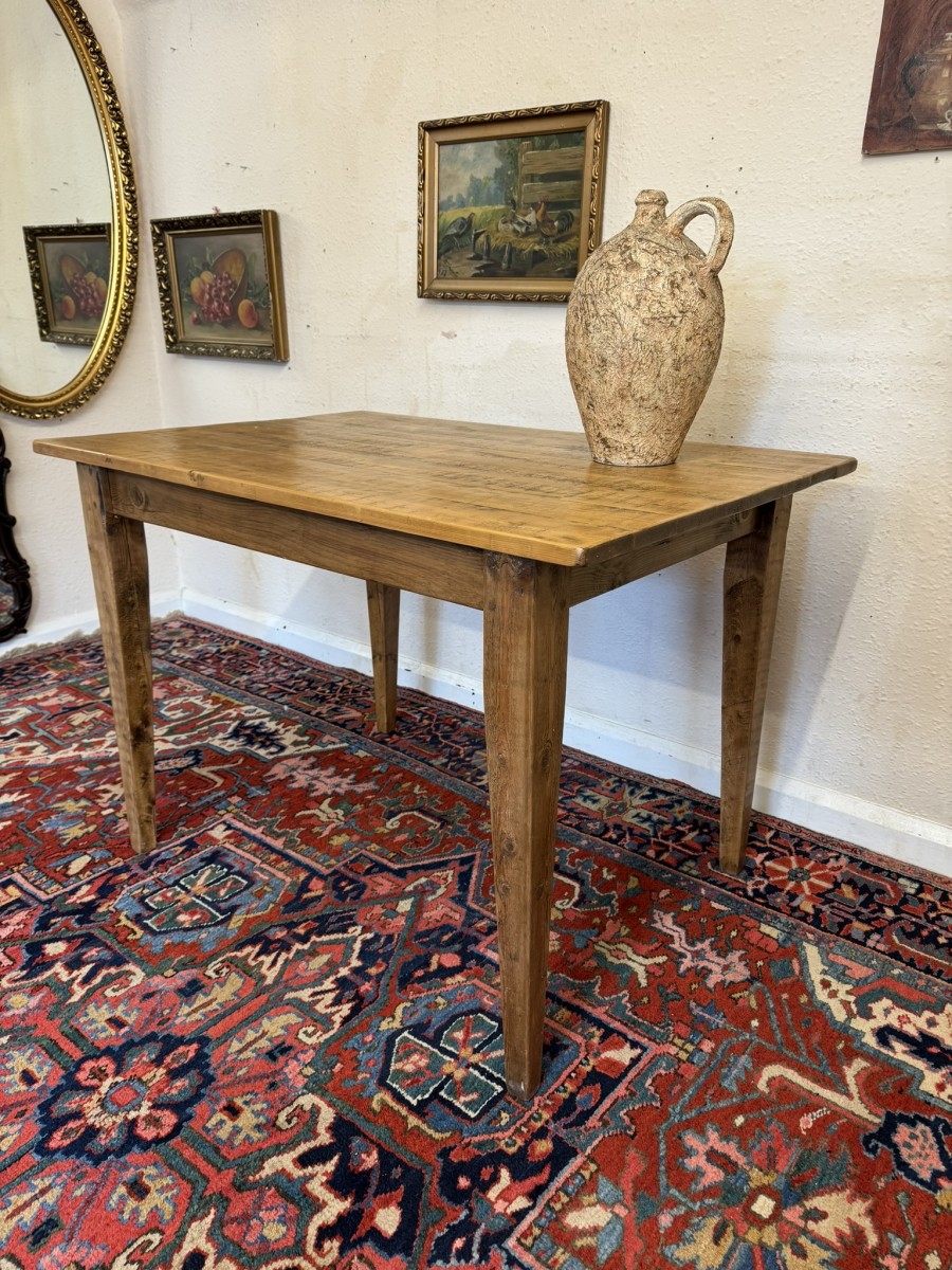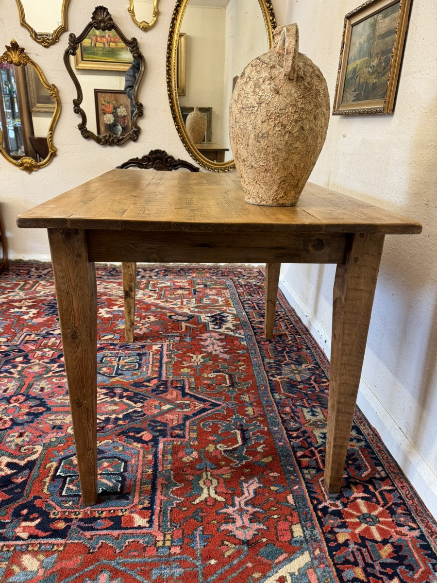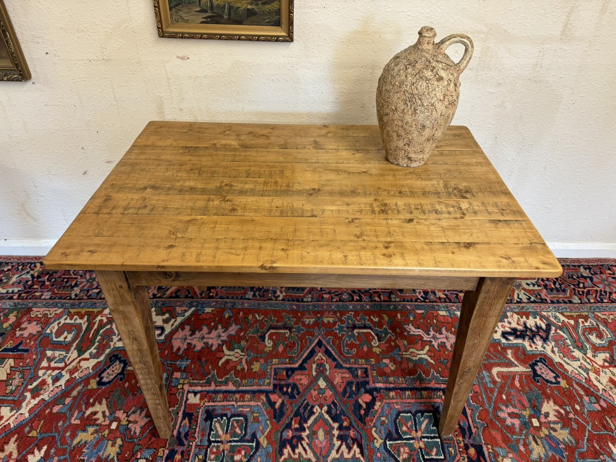 This fabulous pine farmhouse table is in excellent condition; the planked top sits on four elegant tapered legs.