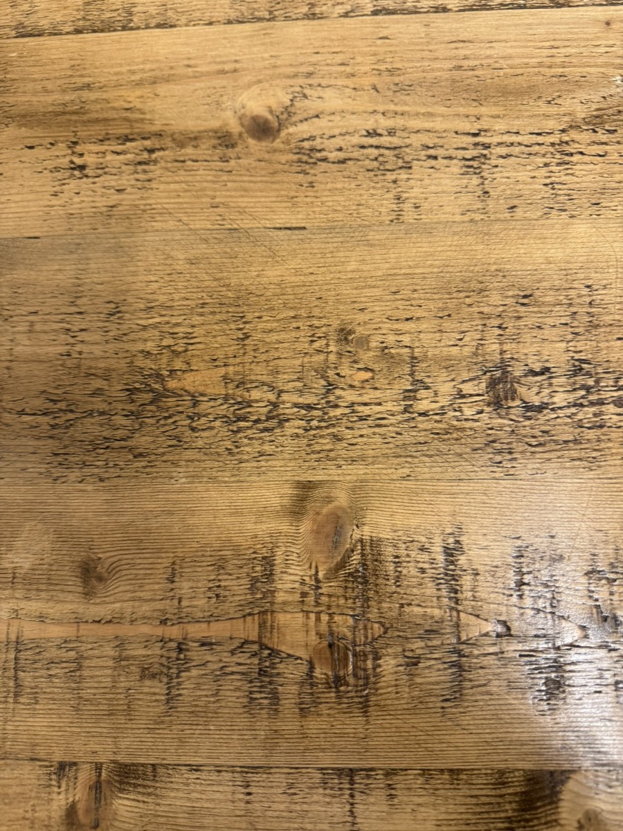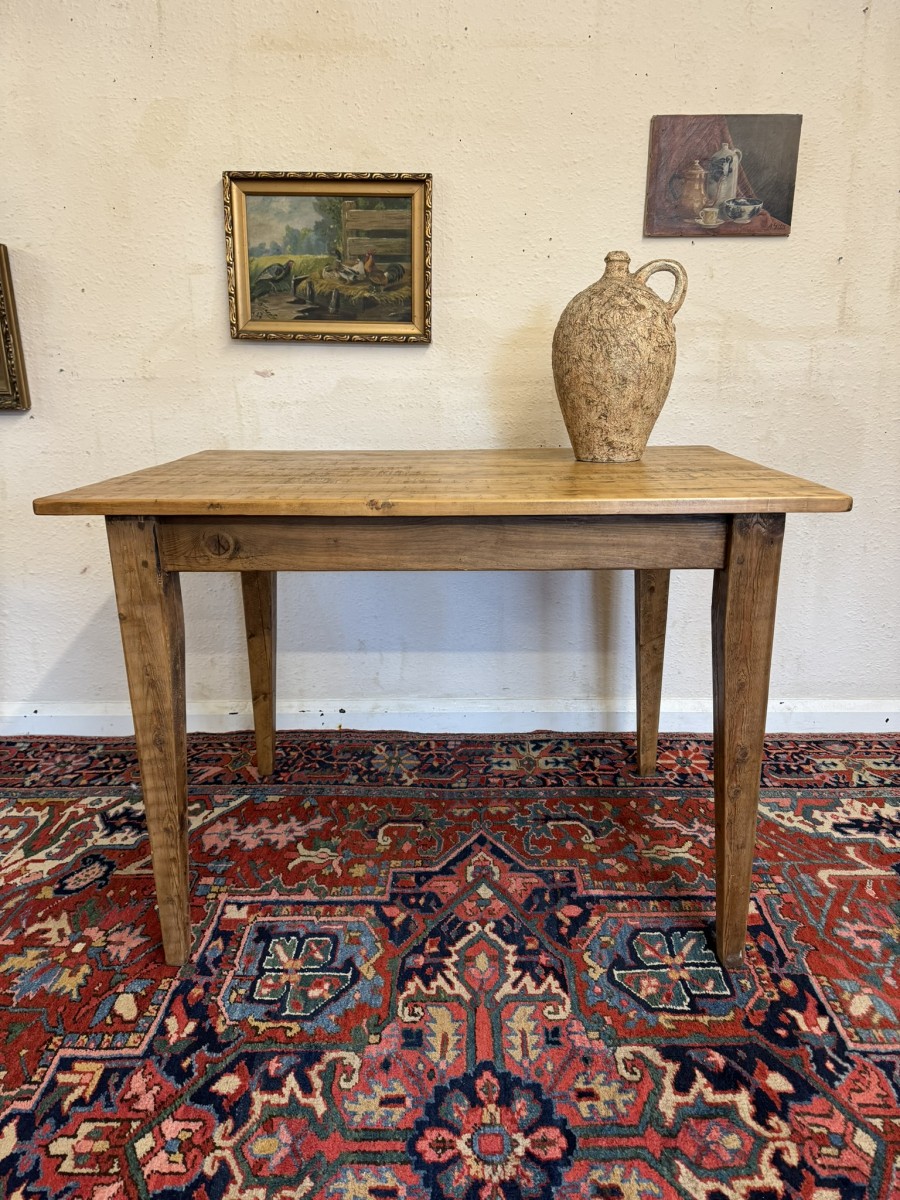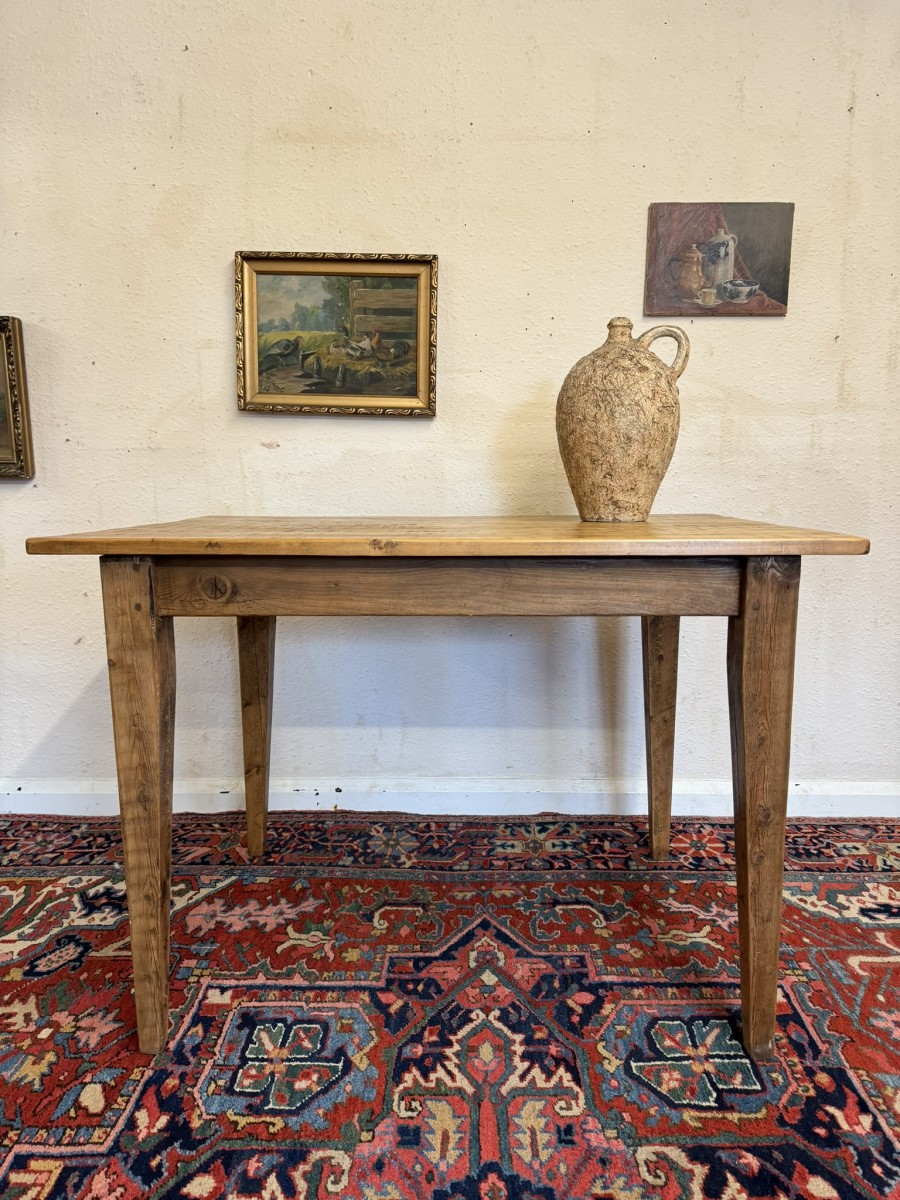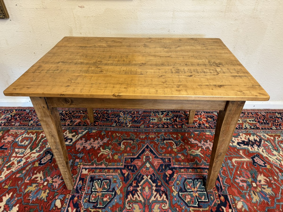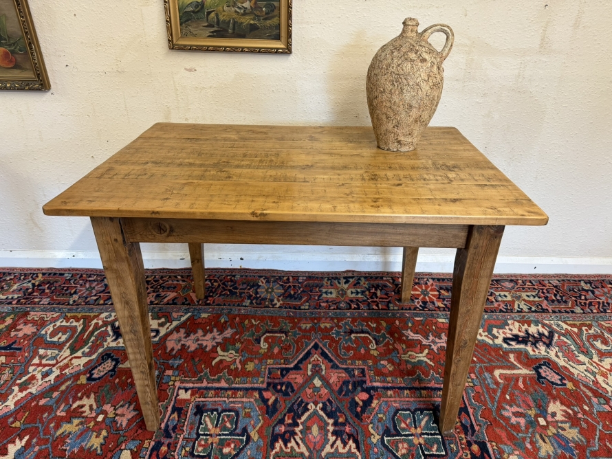 This fabulous pine farmhouse table is in excellent condition; the planked top sits on four elegant tapered legs.