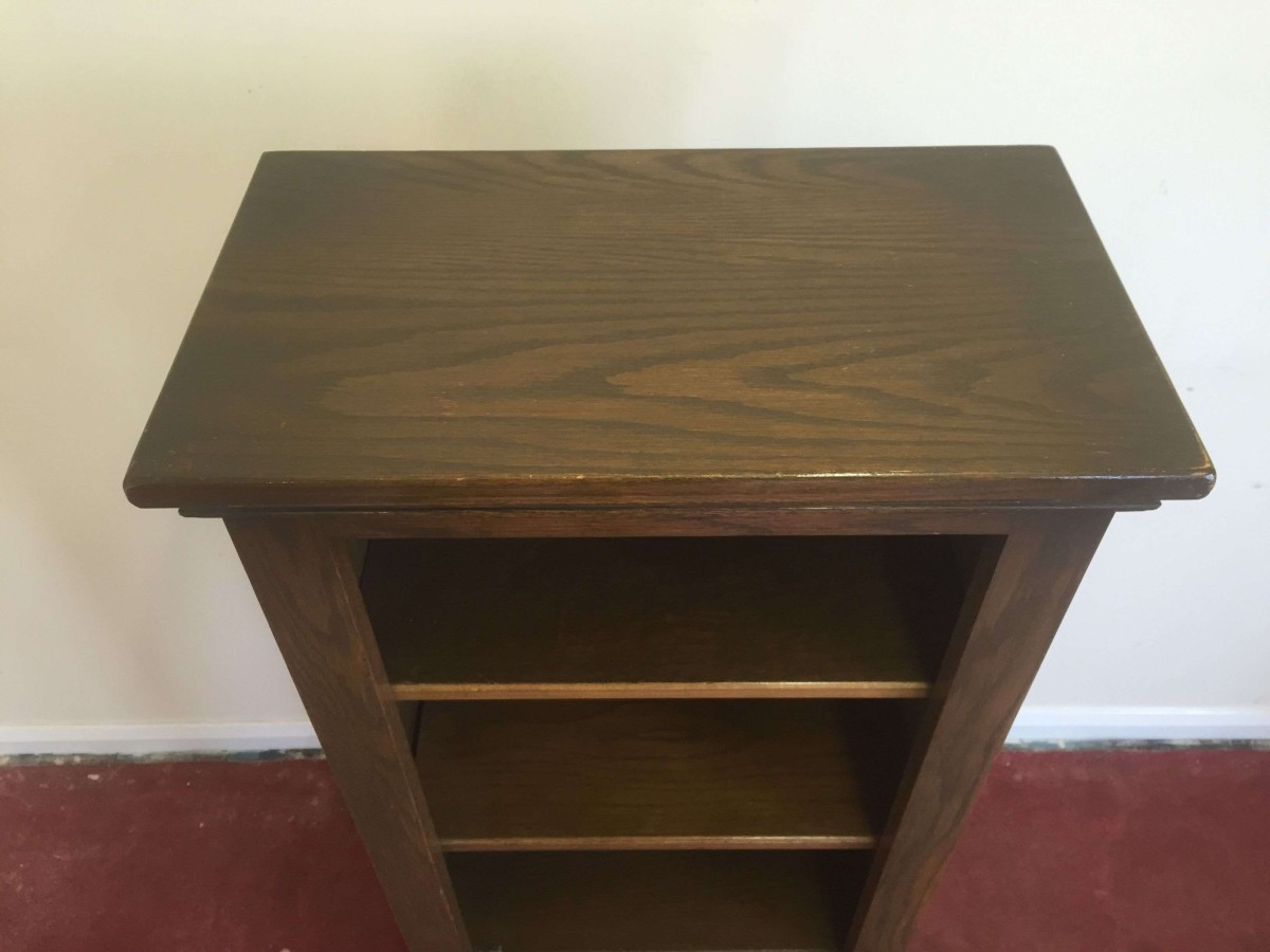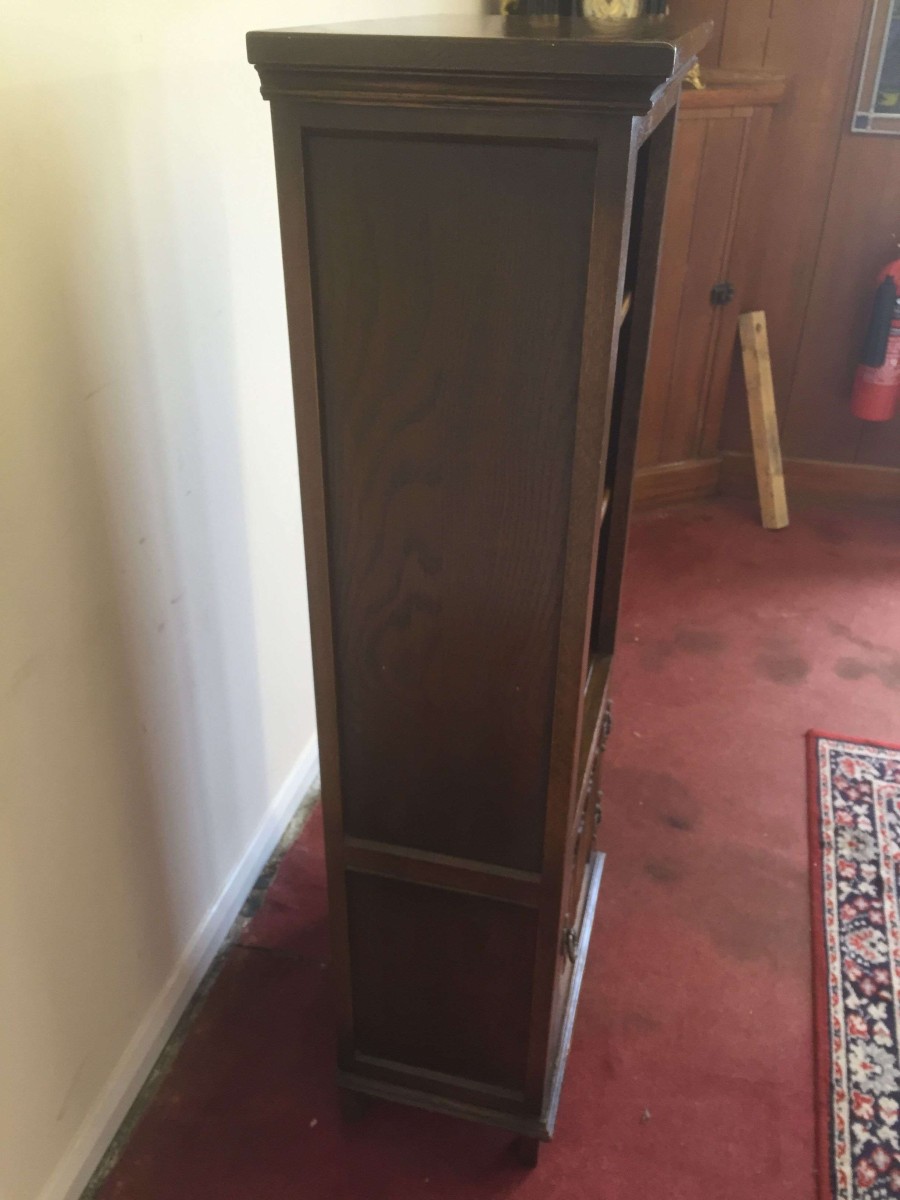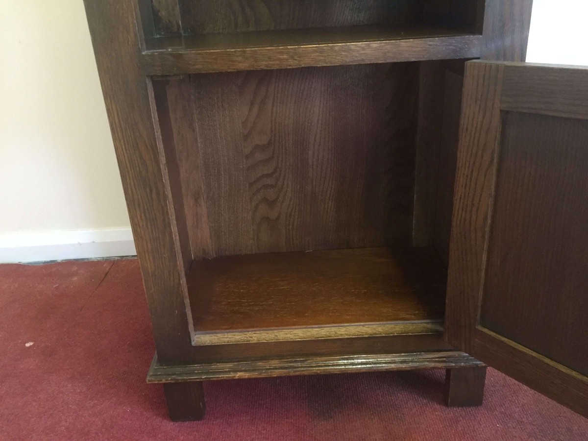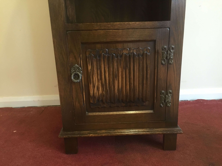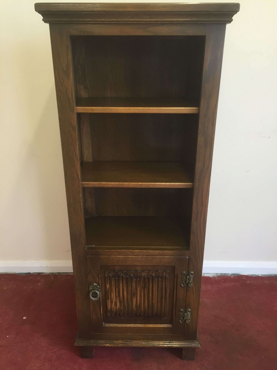 Slim bookcase produced by “Old Charm” furniture makers. Three shelves, linen fold cupboard door with storage behind.