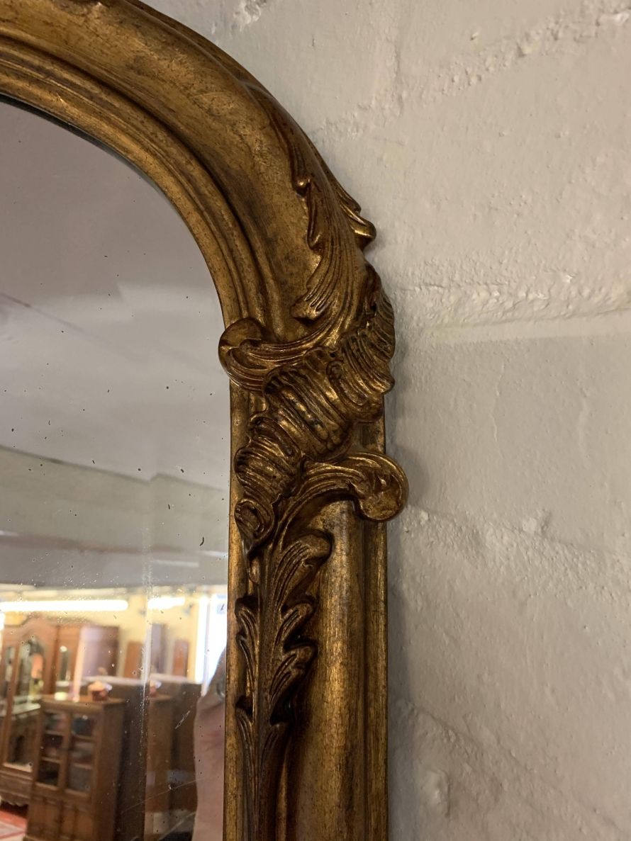 Spectacular statement mirror which can be wall hung or floor standing. This is extremely large impressive mirror is in excellent condition. The shaped top is adorned with elaborate carving. There are also carvings to the top corners, sides and bottom corners. The mirror has a wide bevel edging. A grand mirror.
