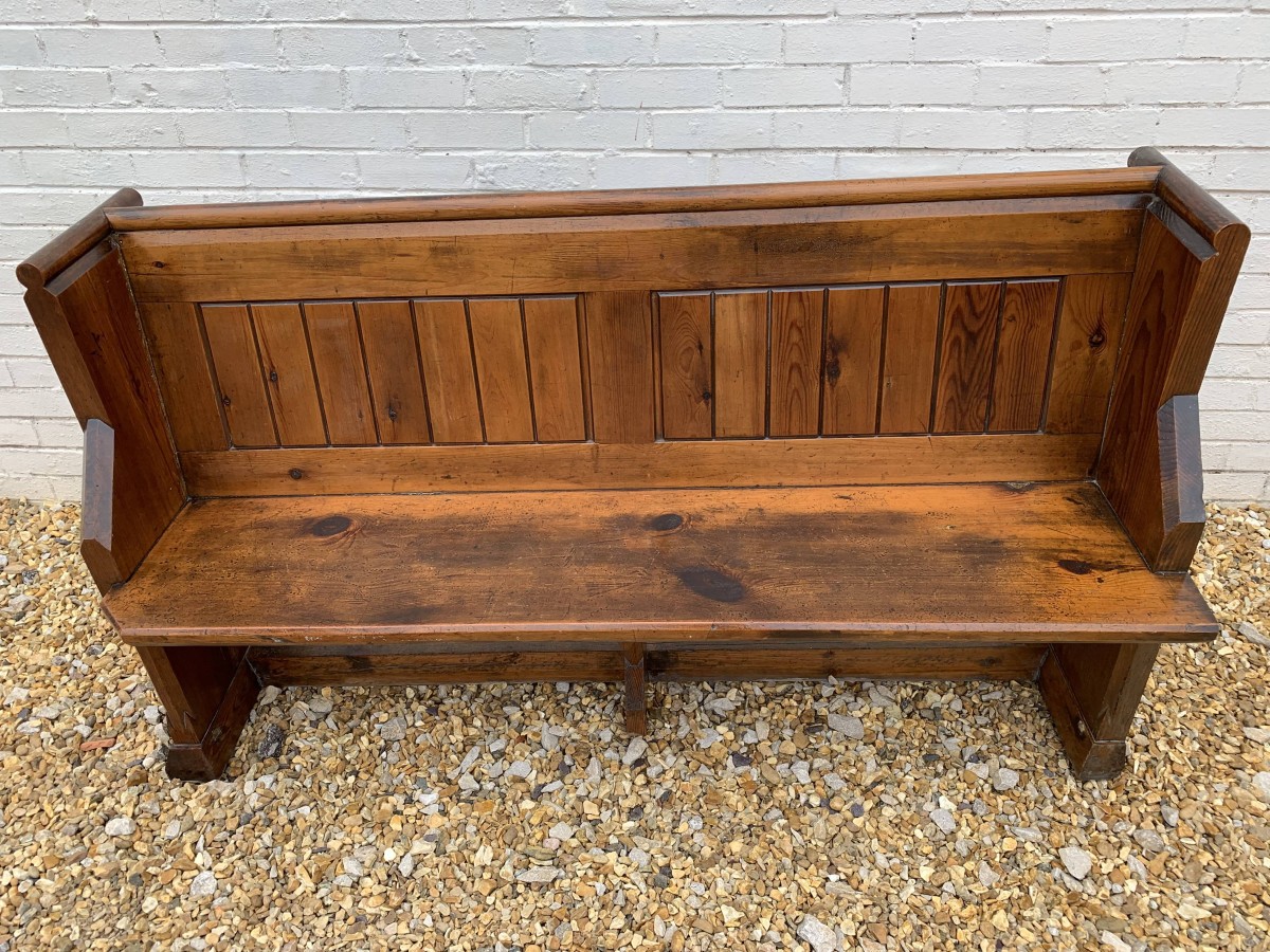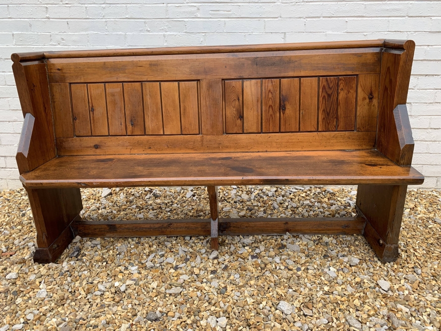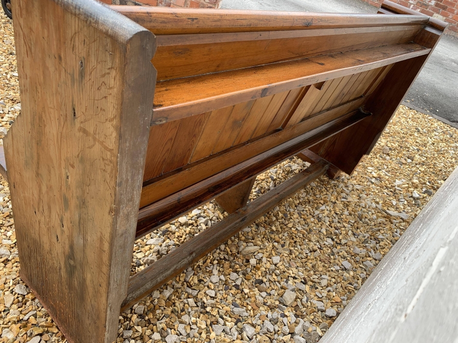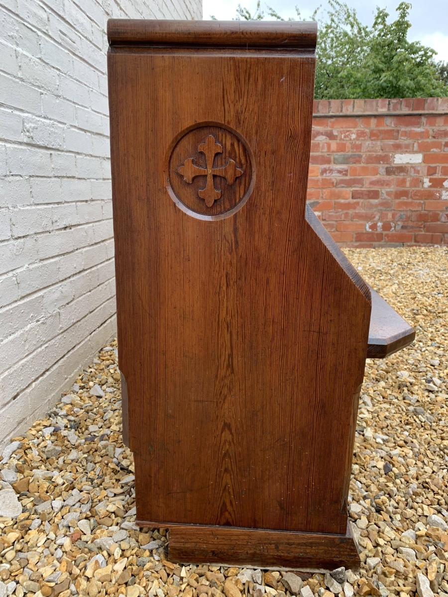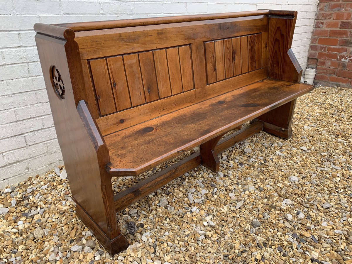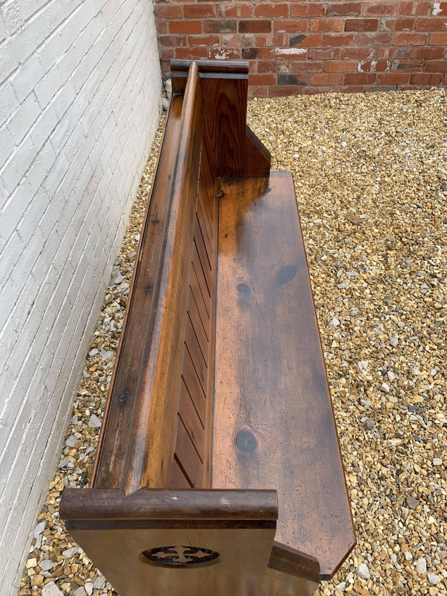 We are delighted to offer to you this delightful church pew. Made entirely of original pitch pine, ecclesiastical carvings to one end. Hymnbook shelf and lower shelf at the back.