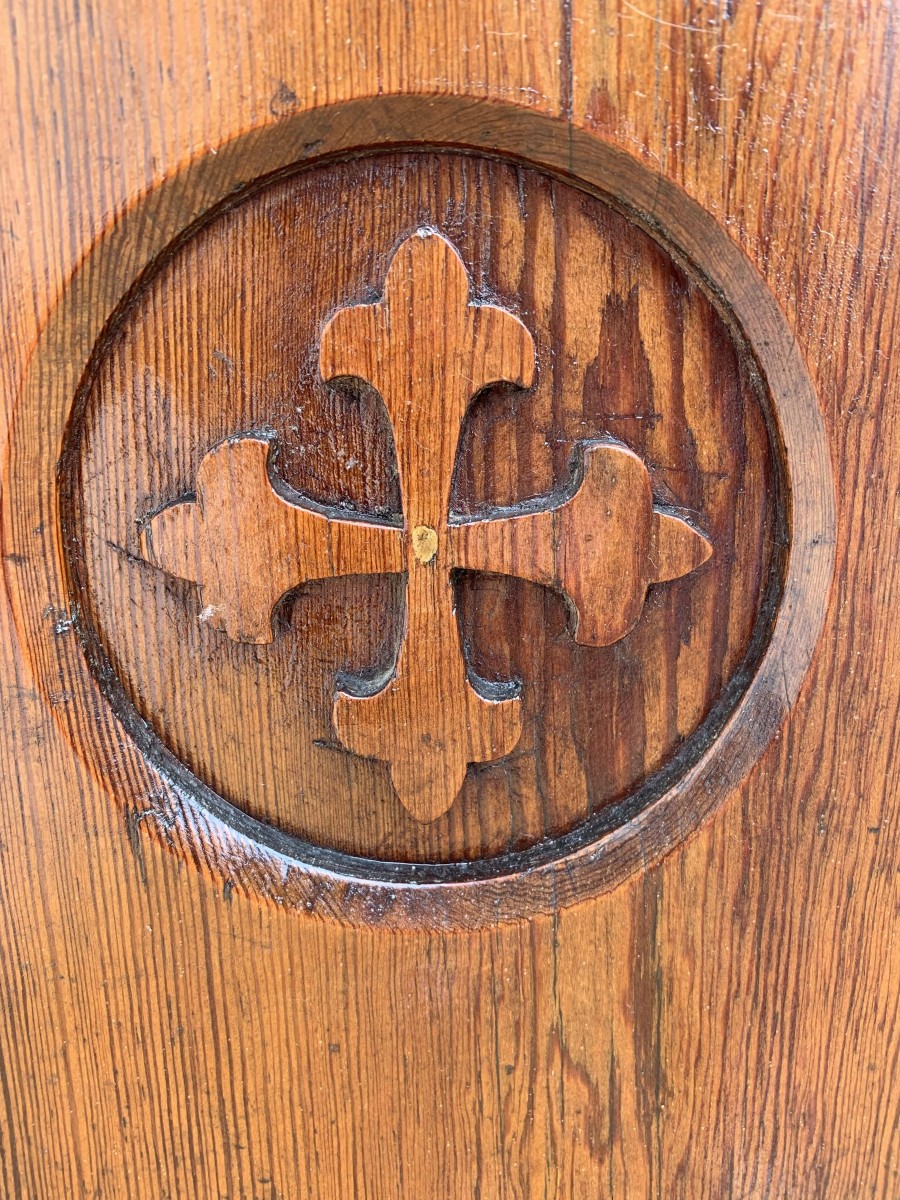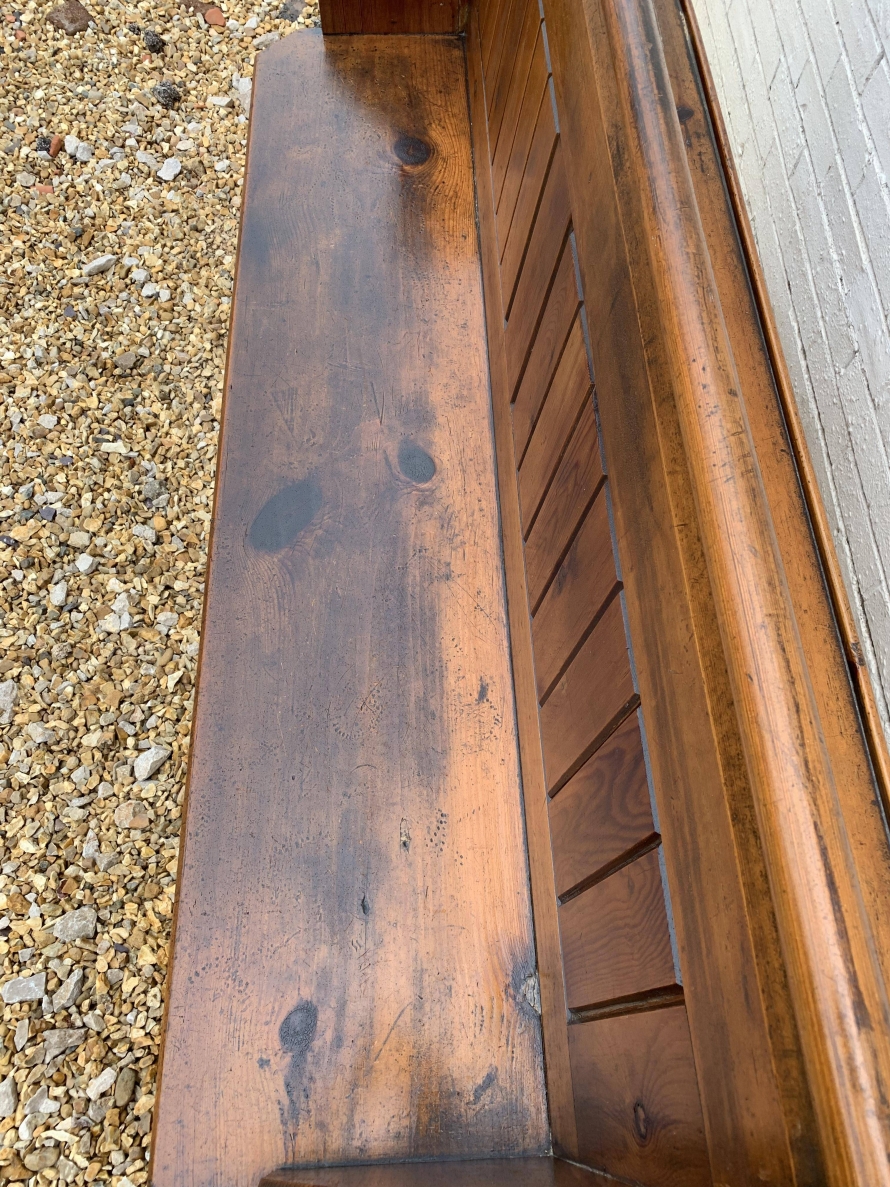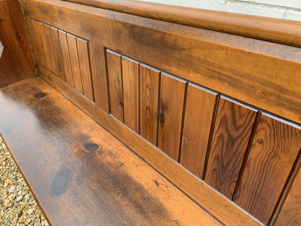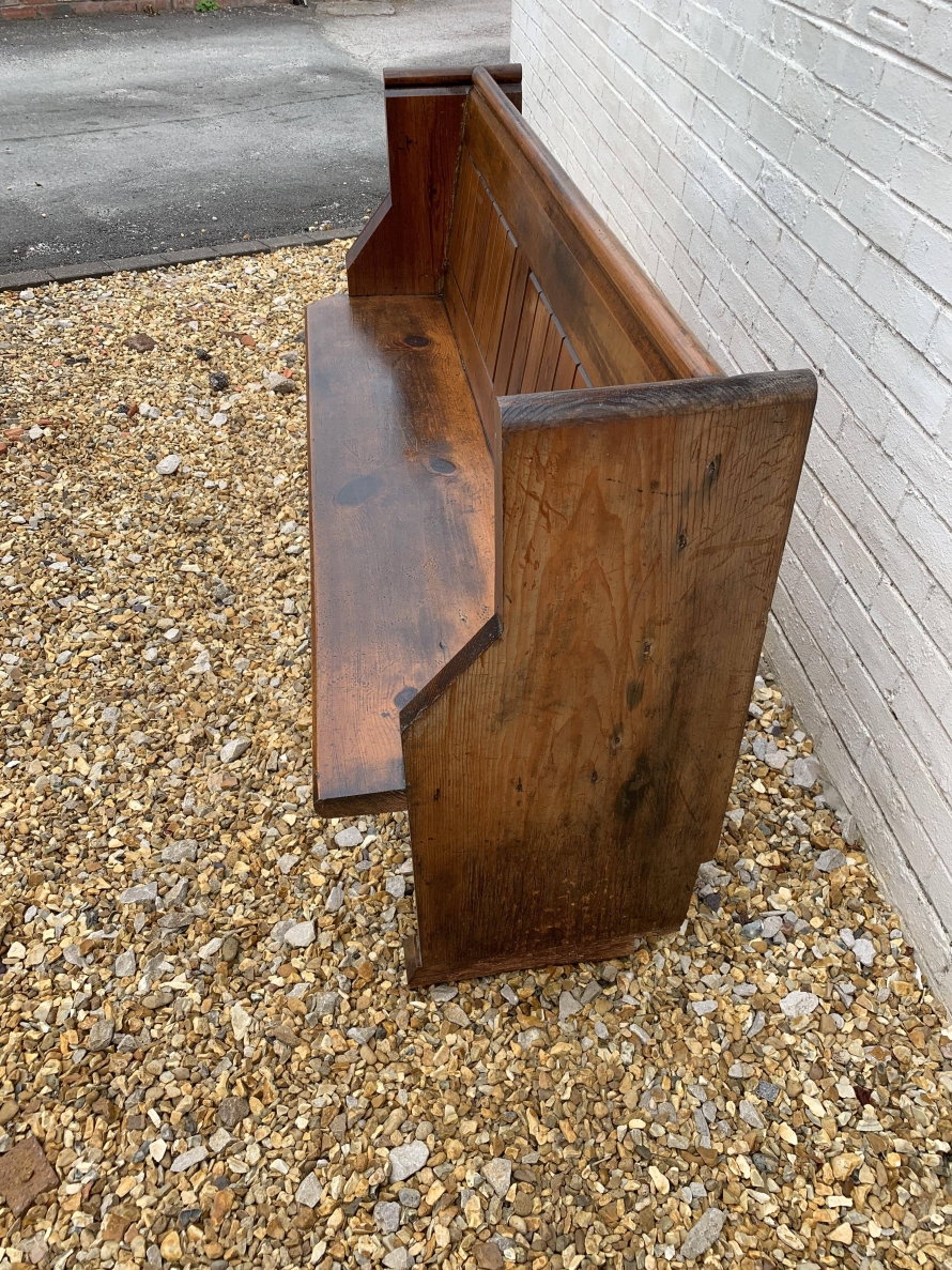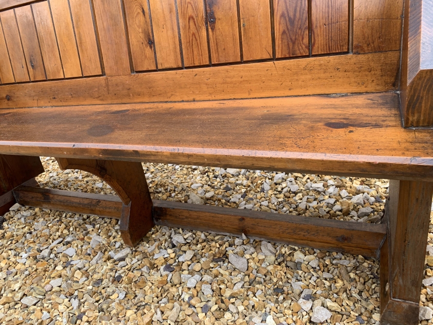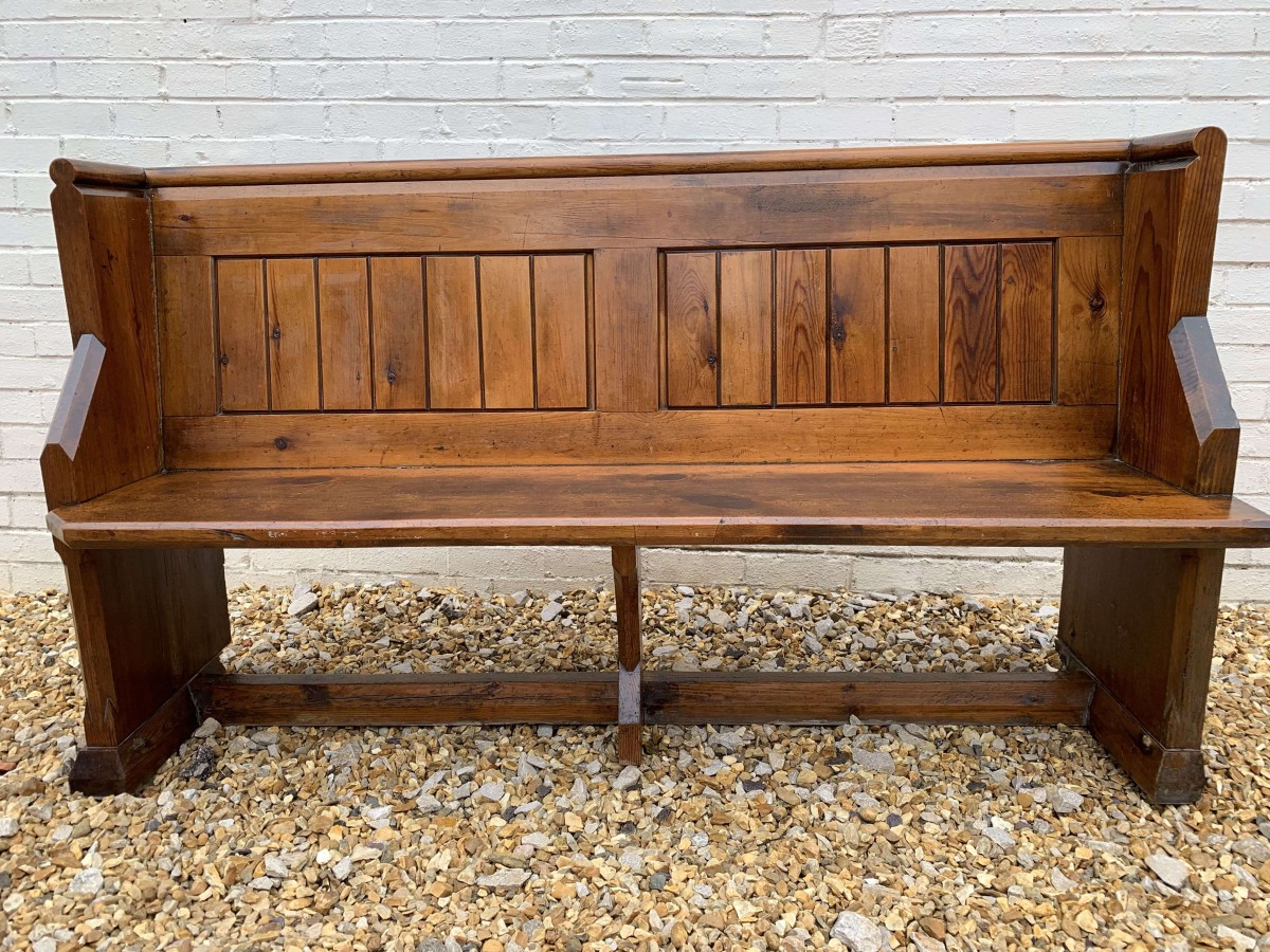 We are delighted to offer to you this delightful church pew. Made entirely of original pitch pine, ecclesiastical carvings to one end. Hymnbook shelf and lower shelf at the back.