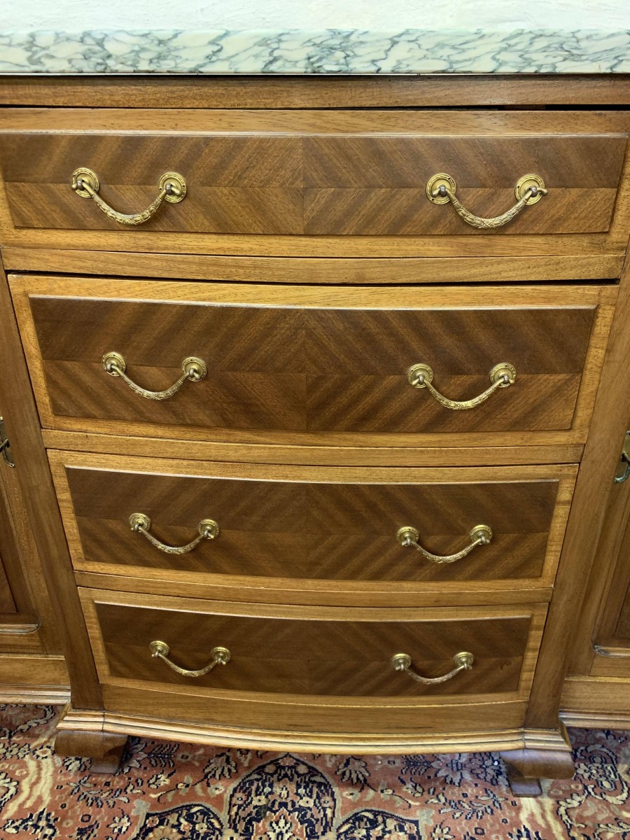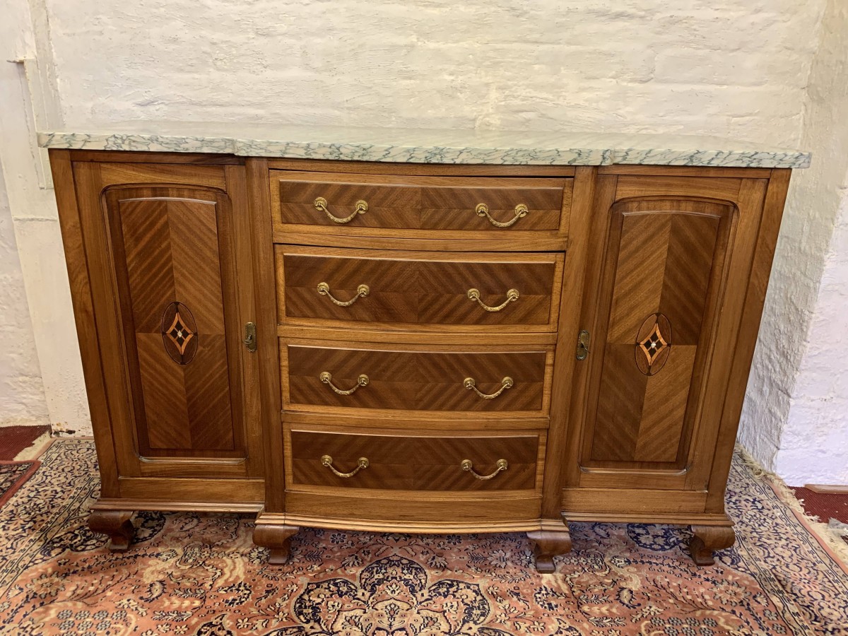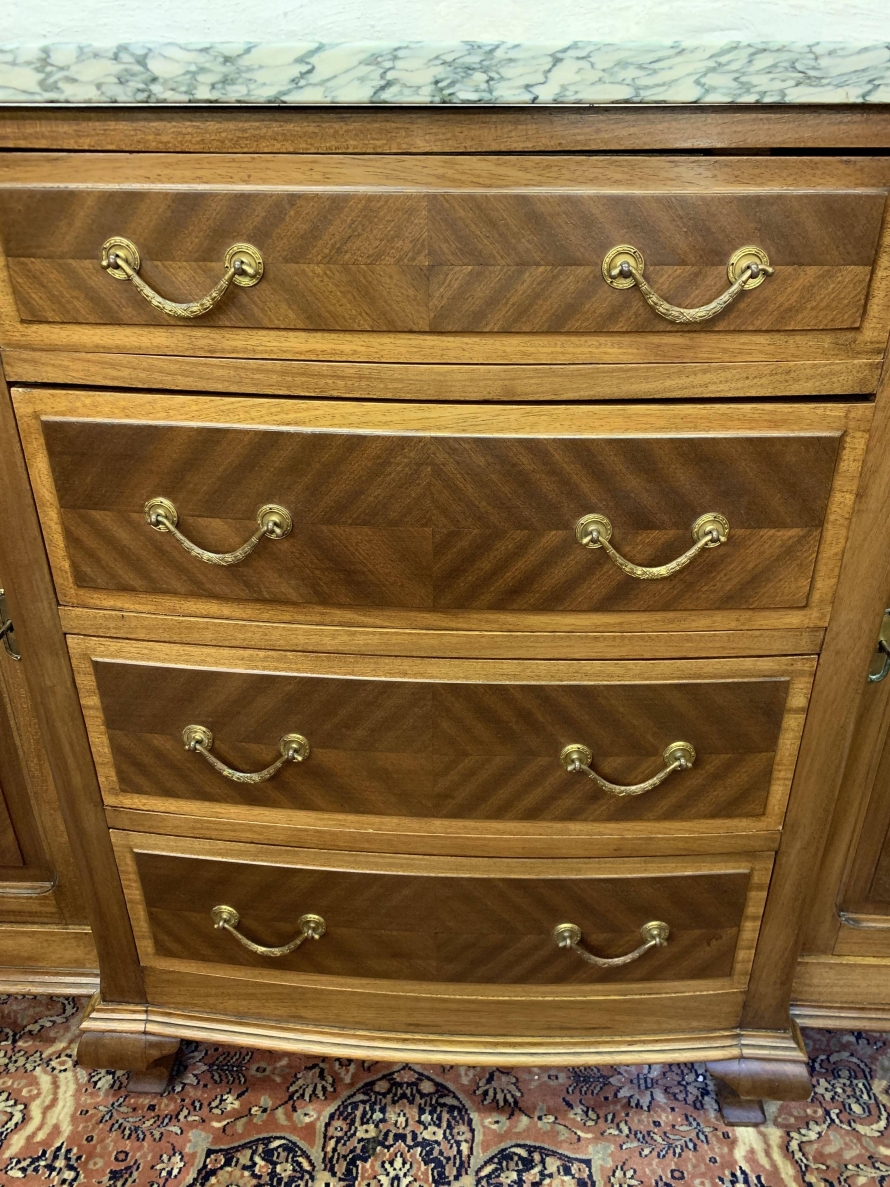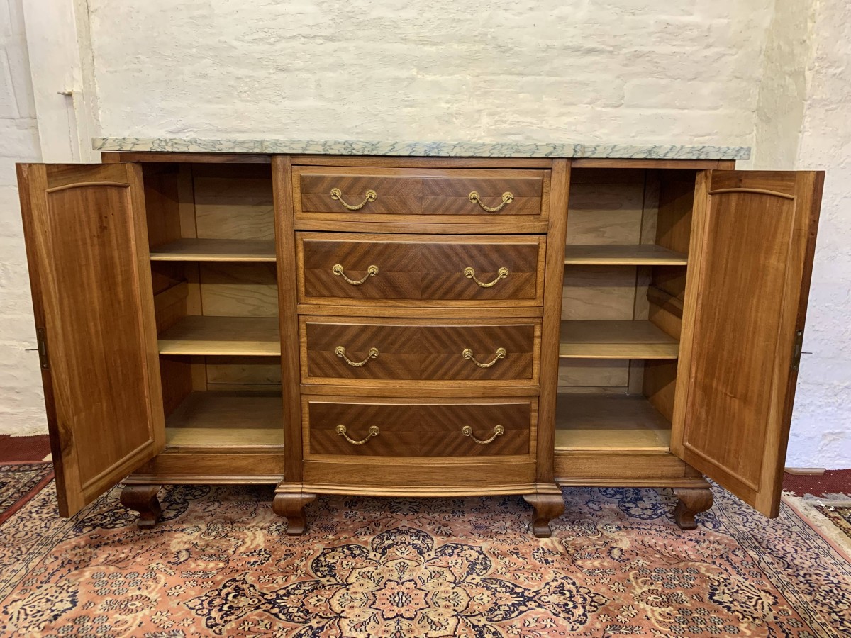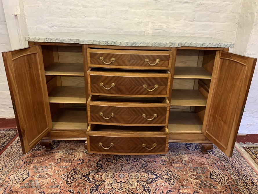 The impressive shaped marble top sits above a bank of four central brakefront drawers, each drawer having a pair of ornate brass handles. The drawers are flanked by a pair of recessed panelled inlaid lockable cupboard doors, each door opens to reveal two removable shelves. Recessed panelled sides, this fabulous quality credenza sits on four cabriole shaped legs to the front.