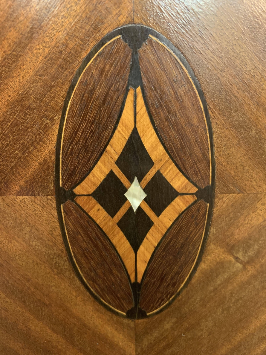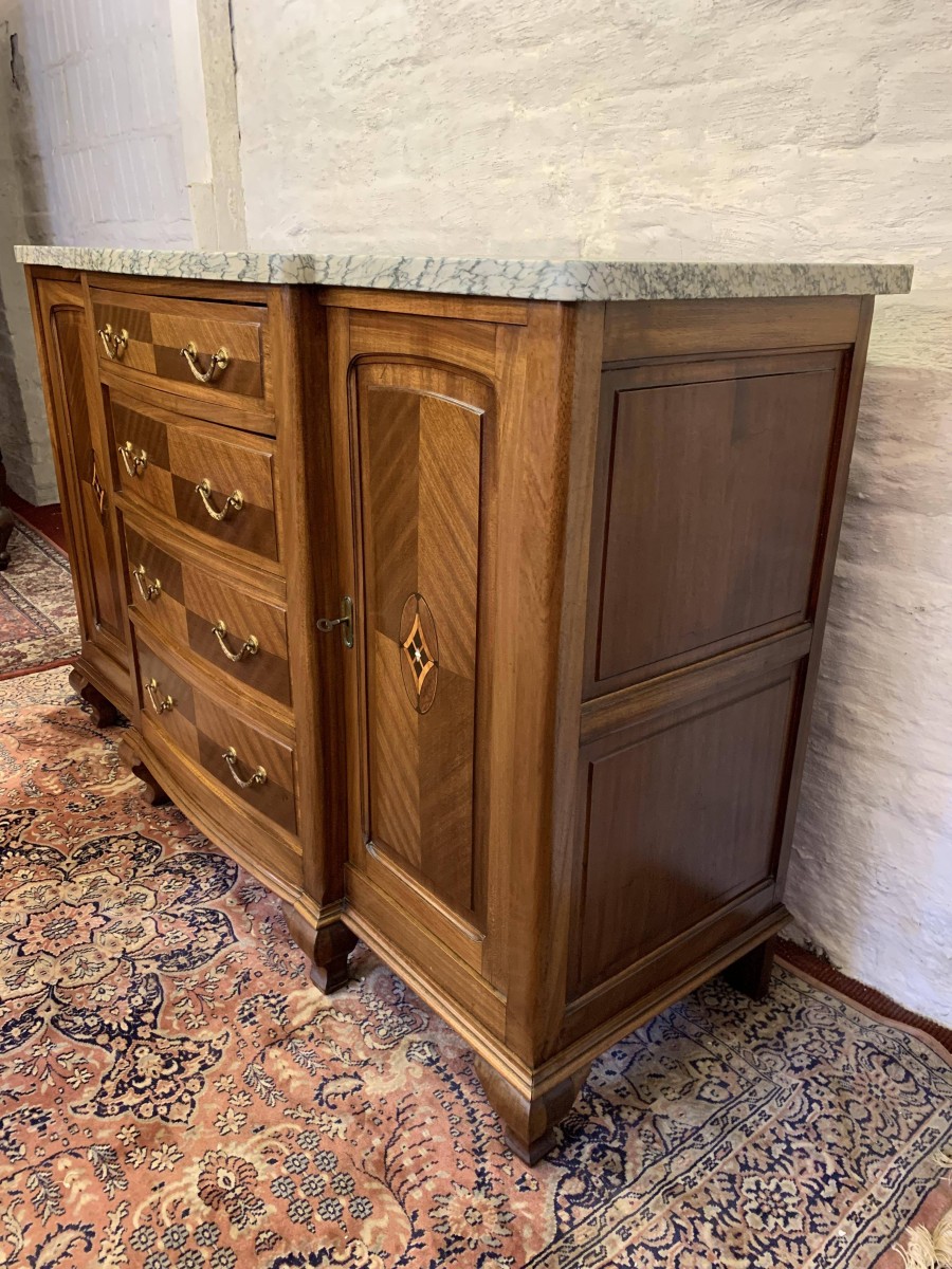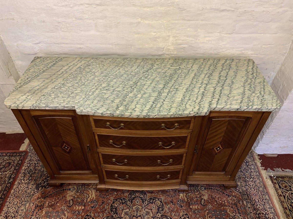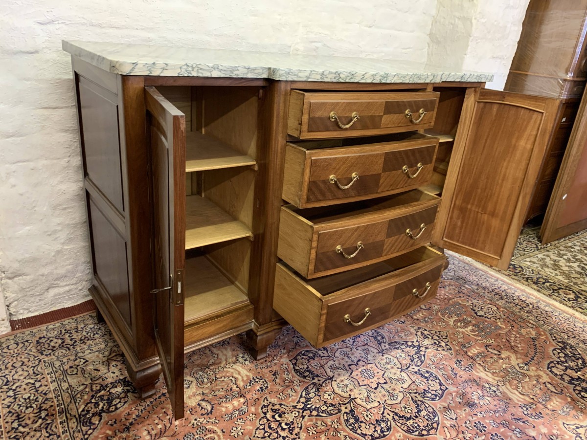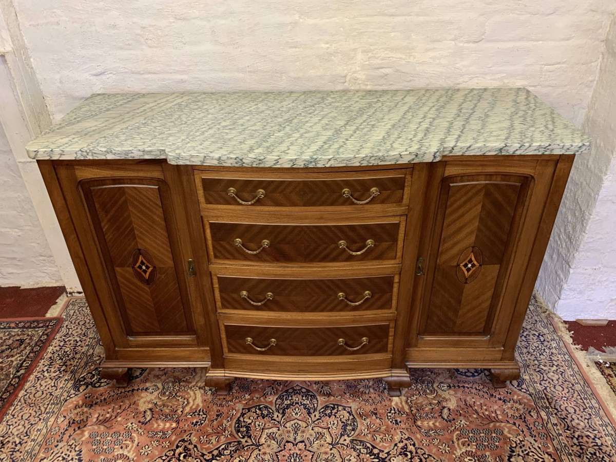 The impressive shaped marble top sits above a bank of four central brakefront drawers, each drawer having a pair of ornate brass handles. The drawers are flanked by a pair of recessed panelled inlaid lockable cupboard doors, each door opens to reveal two removable shelves. Recessed panelled sides, this fabulous quality credenza sits on four cabriole shaped legs to the front.