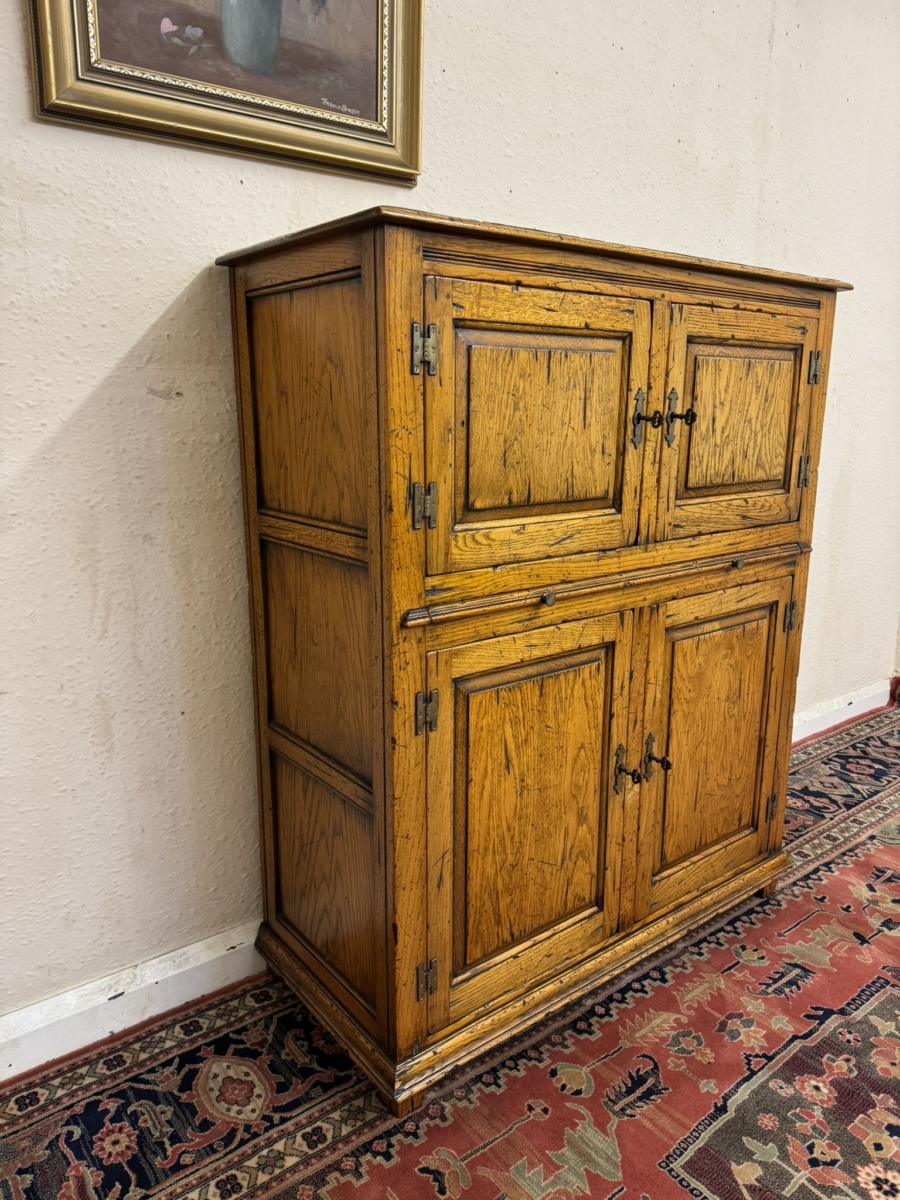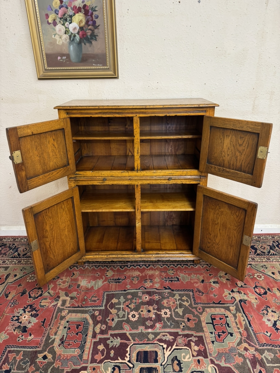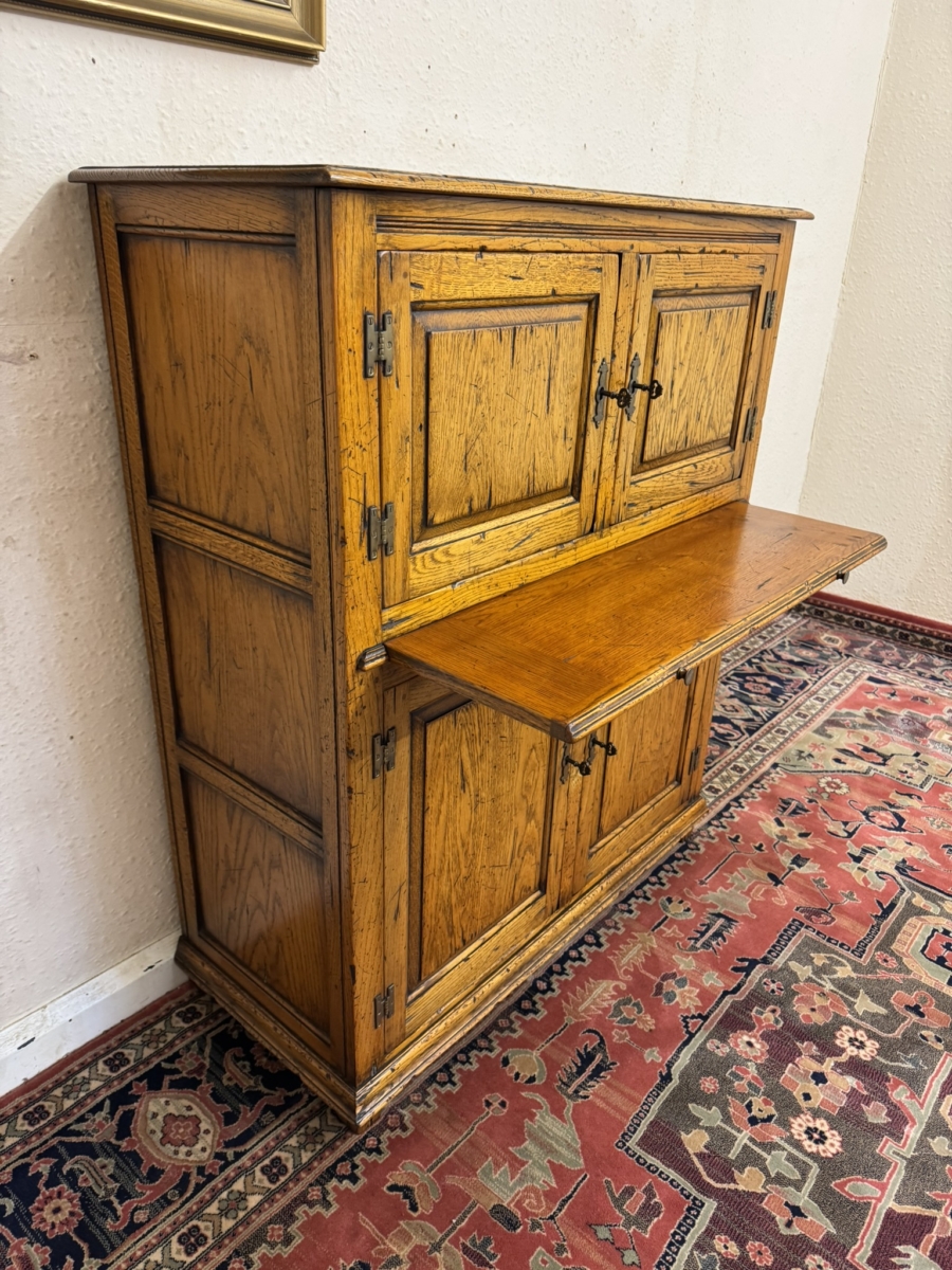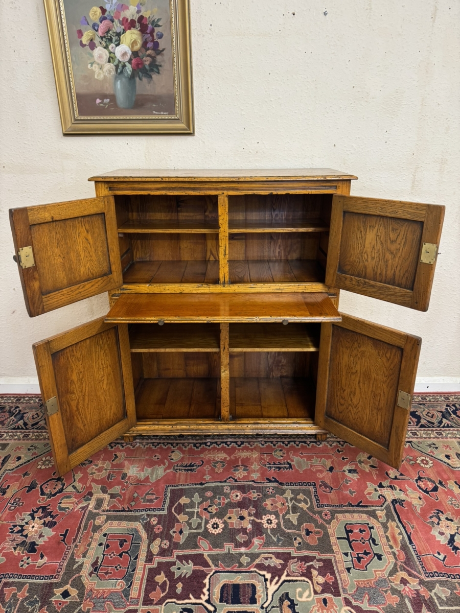 This fine cabinet is made entirely in solid oak by the renowned furniture makers Cumpers of Sailsbury and is in excellent condition. The over sailing top sits above the pair of lockable recessed panelled doors, each door having brass H hinges, escutcheon and key. The doors open to reveal a fixed shelf with boarded back and base. Below is a re-tractable slide, below the slide is a pair of lockable recessed panelled cupboard doors, each door having brass H hinges, escutcheon and key. The doors open to reveal a fixed shelf boarded back and base full stop recessed panelled sides and standing on for traditional block feet.