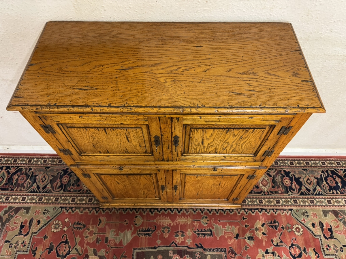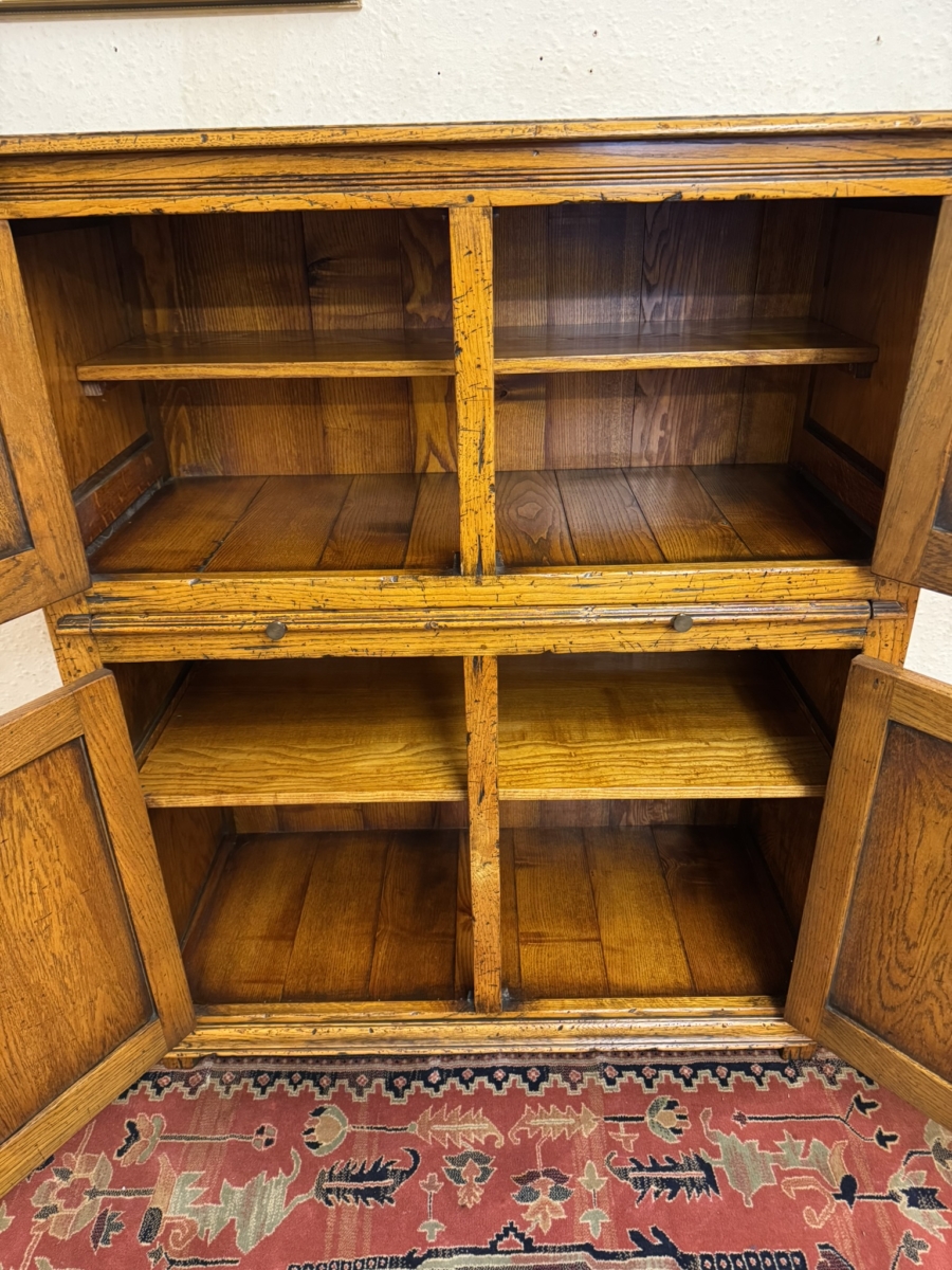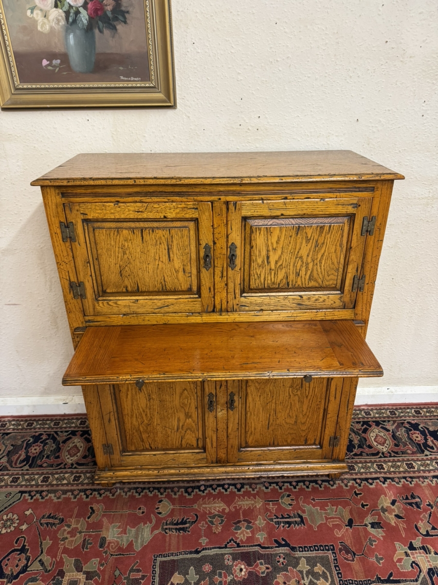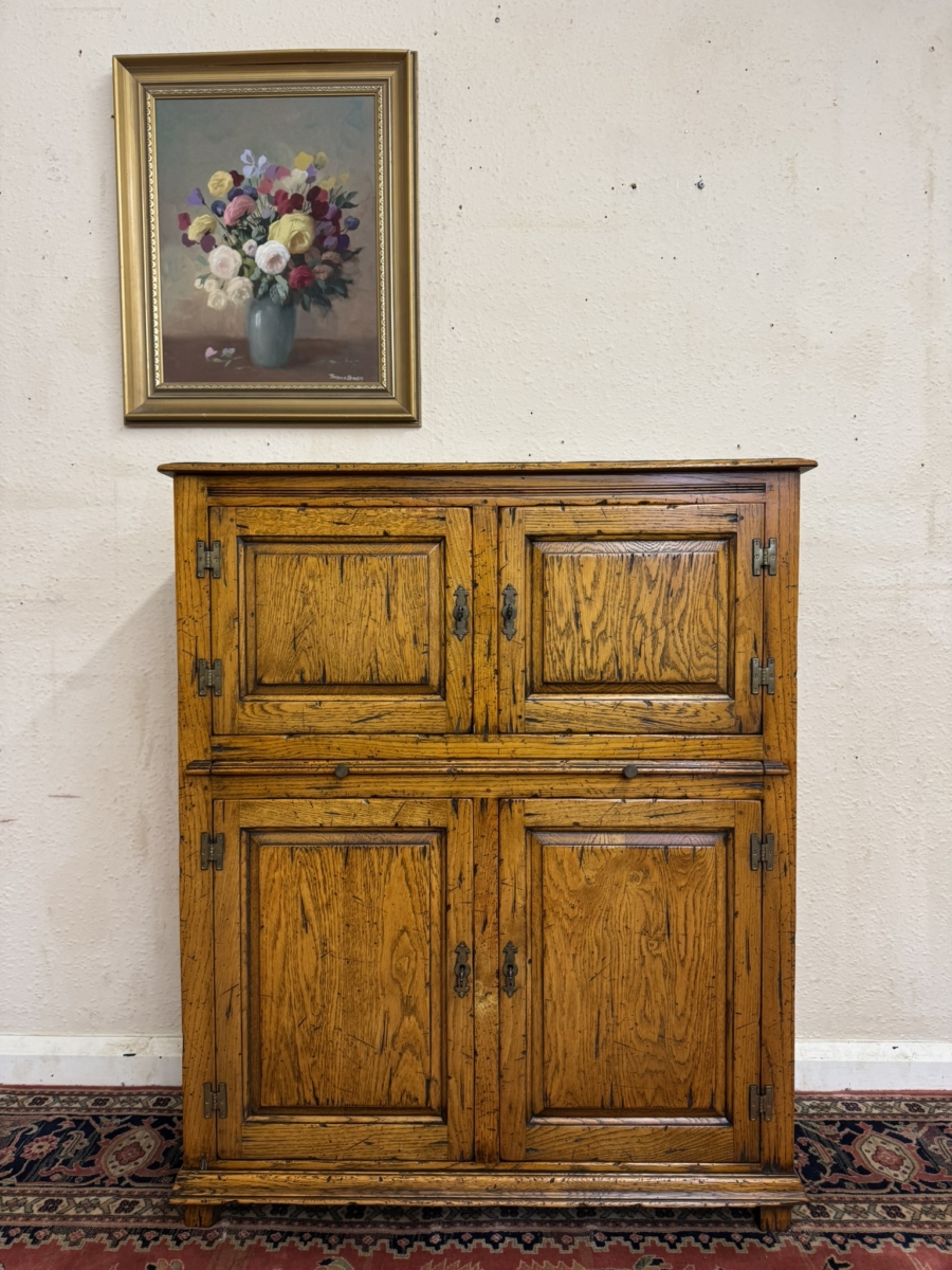 This fine cabinet is made entirely in solid oak by the renowned furniture makers Cumpers of Sailsbury and is in excellent condition. The over sailing top sits above the pair of lockable recessed panelled doors, each door having brass H hinges, escutcheon and key. The doors open to reveal a fixed shelf with boarded back and base. Below is a re-tractable slide, below the slide is a pair of lockable recessed panelled cupboard doors, each door having brass H hinges, escutcheon and key. The doors open to reveal a fixed shelf boarded back and base full stop recessed panelled sides and standing on for traditional block feet.