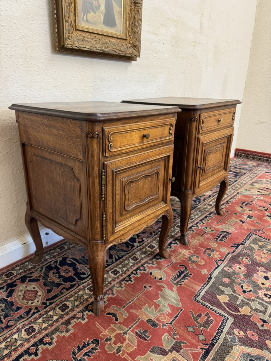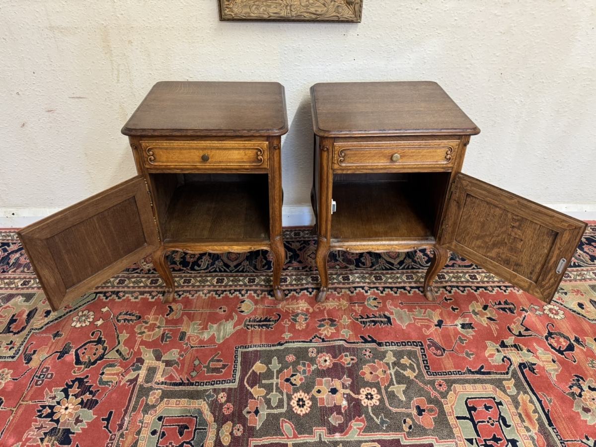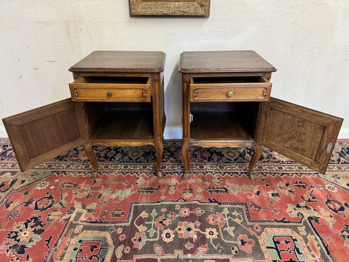 The cabinets are in excellent condition. The over sailing top sits above a carved drawer, the drawer having a brass button handle, below is a recessed panelled cupboard door, the door having brass hinges and a brass button handle. Recessed panelled sides, shaped skirt and standing on four elegant carved cabriole shaped legs.