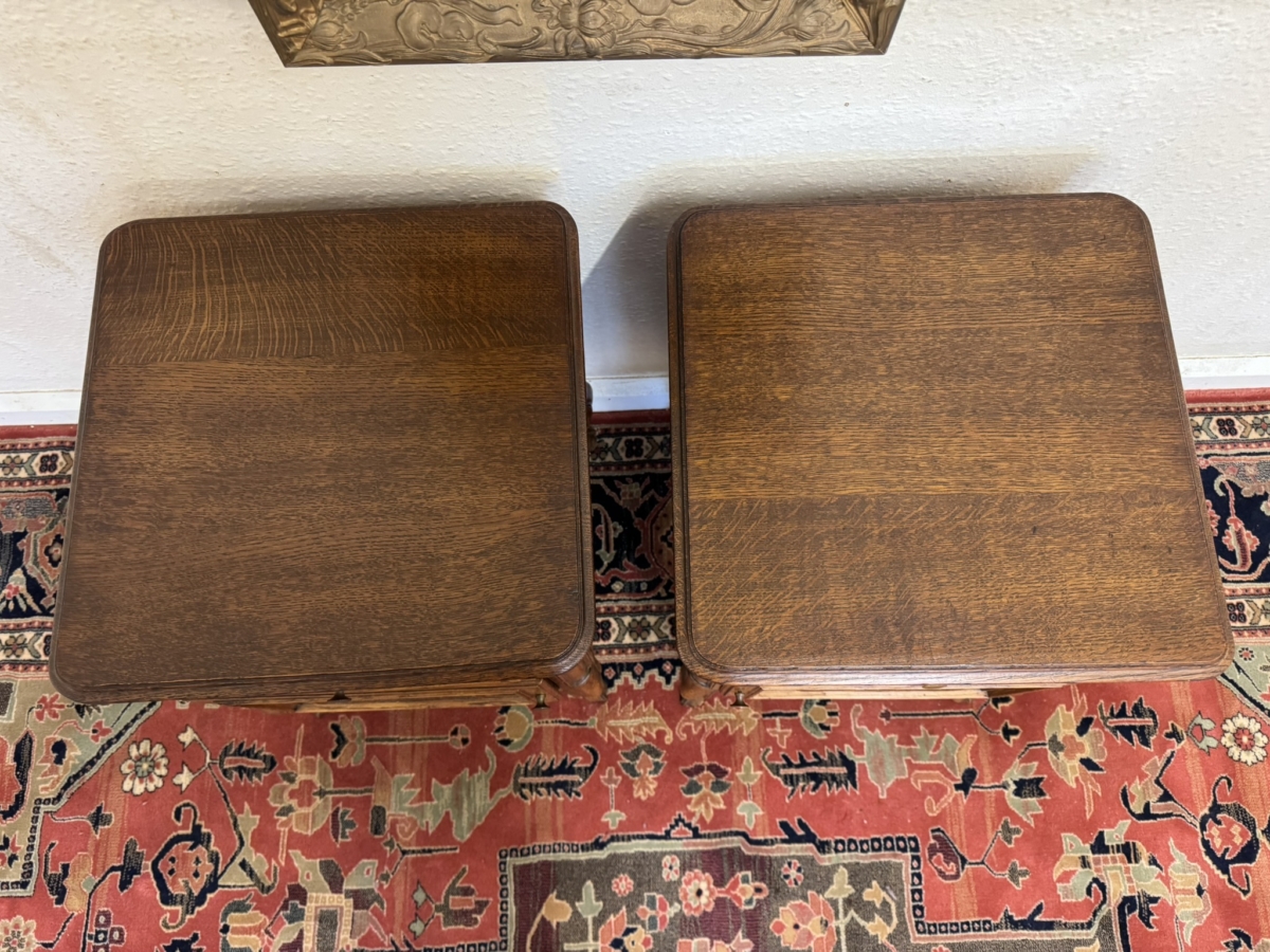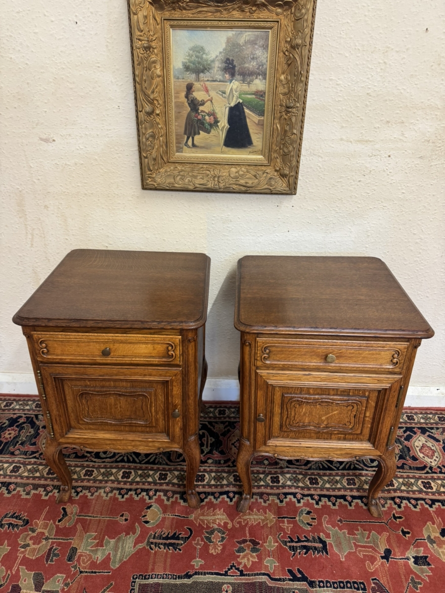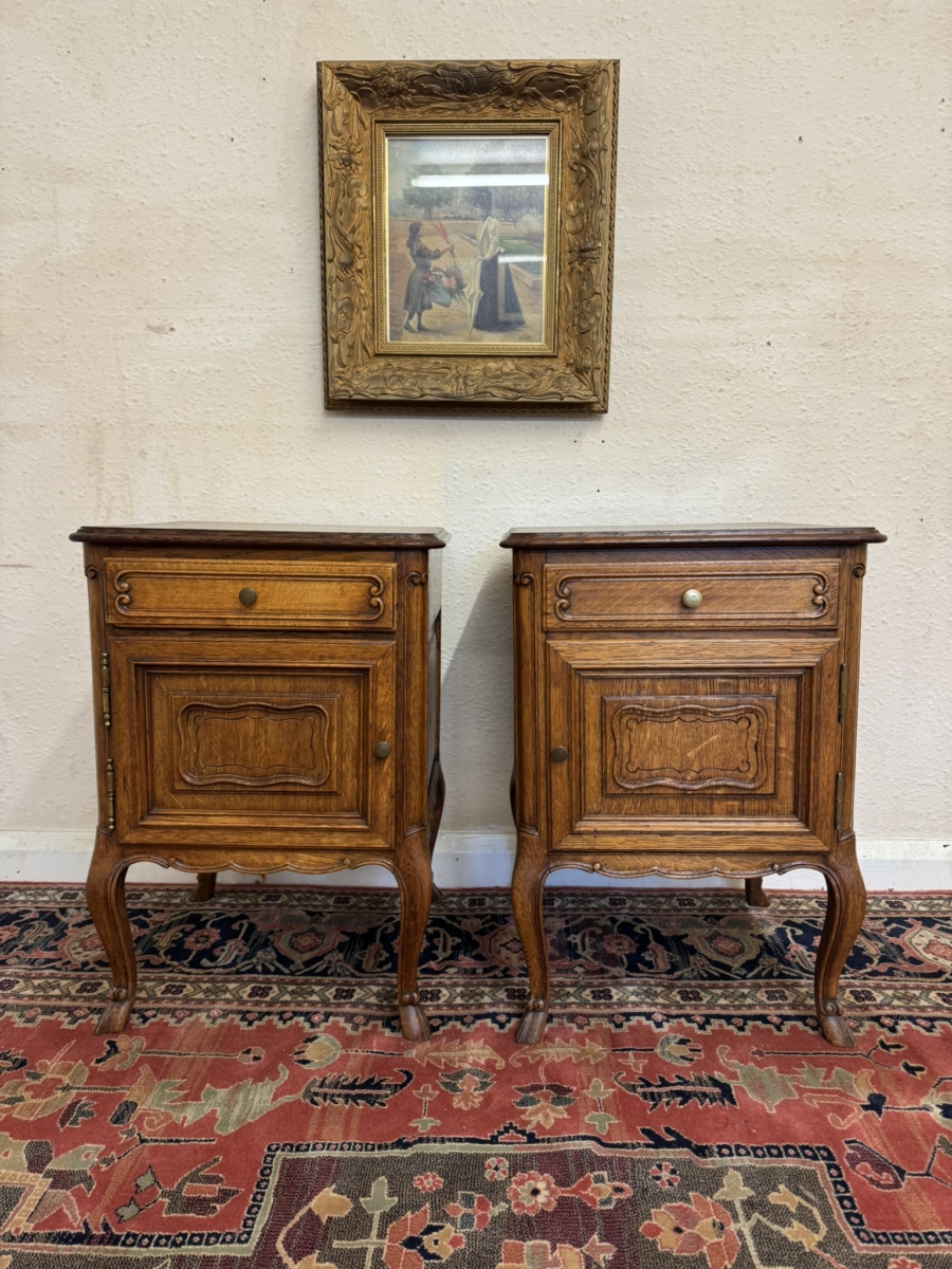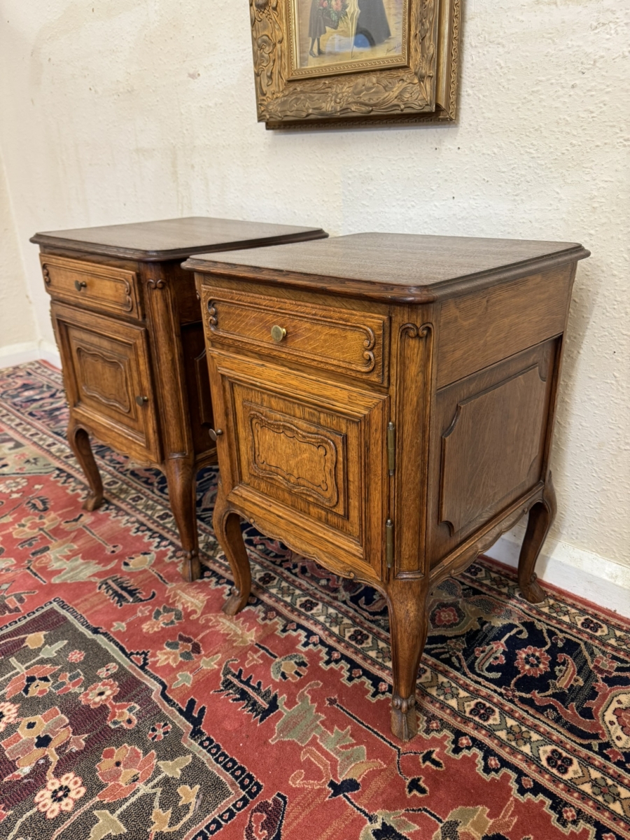 The cabinets are in excellent condition. The over sailing top sits above a carved drawer, the drawer having a brass button handle, below is a recessed panelled cupboard door, the door having brass hinges and a brass button handle. Recessed panelled sides, shaped skirt and standing on four elegant carved cabriole shaped legs.