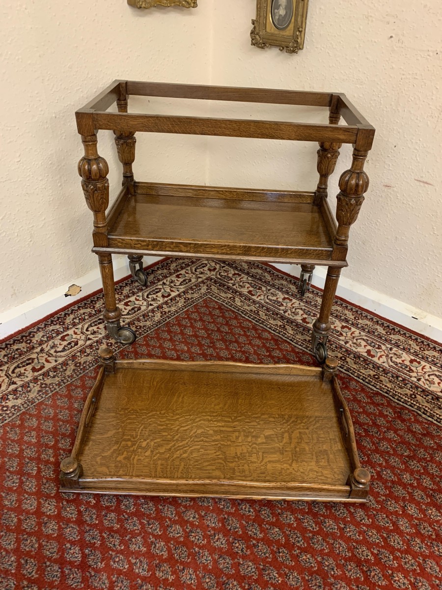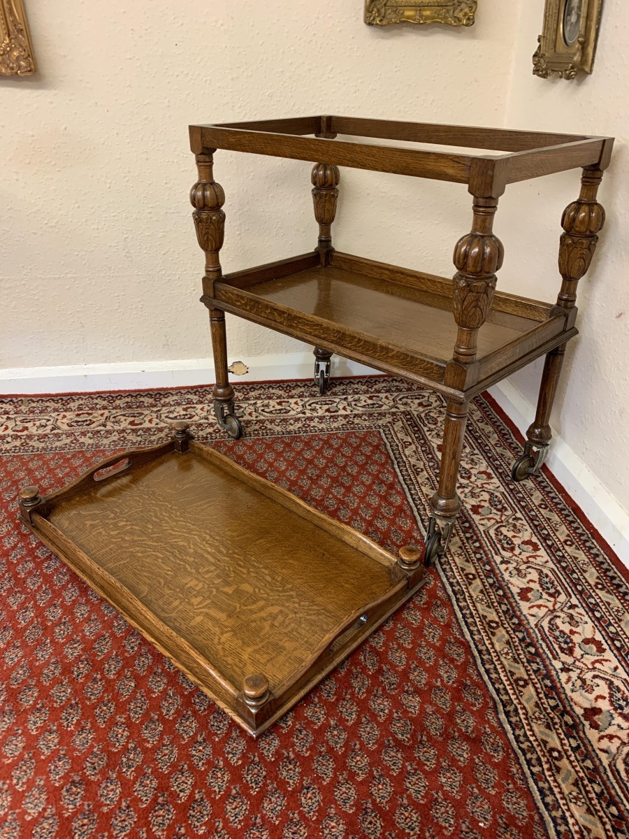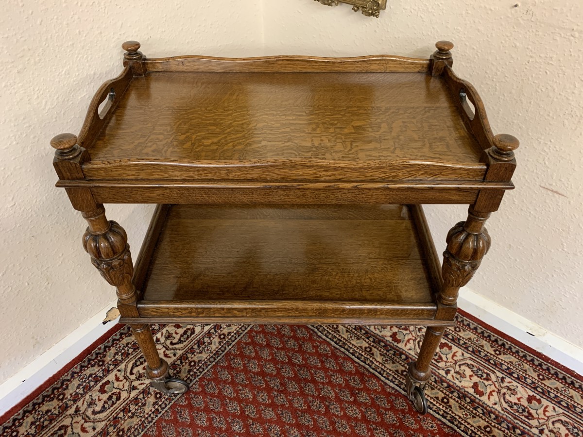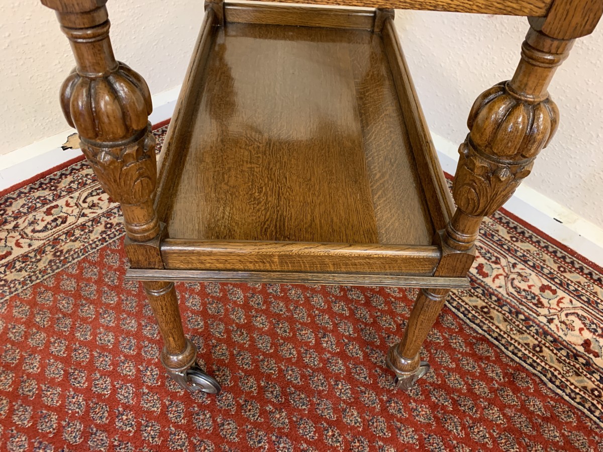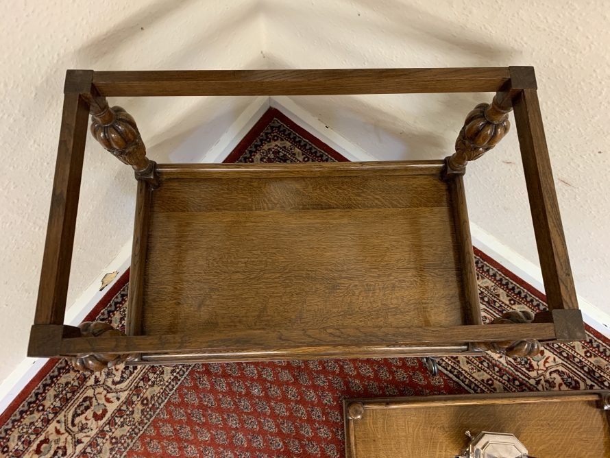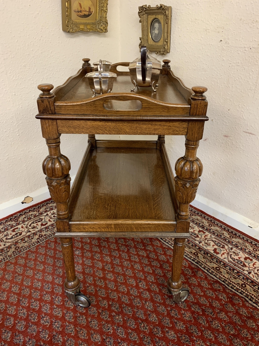 Made in glorious solid oak and in excellent condition this rare tray top trolley dates circa 1925. Having four carved baluster central supports leading down to four turned legs with rare 'suspension' casters. The tops show beautiful figuring with the uper one a two handled lift off tray which would be taken to guests.