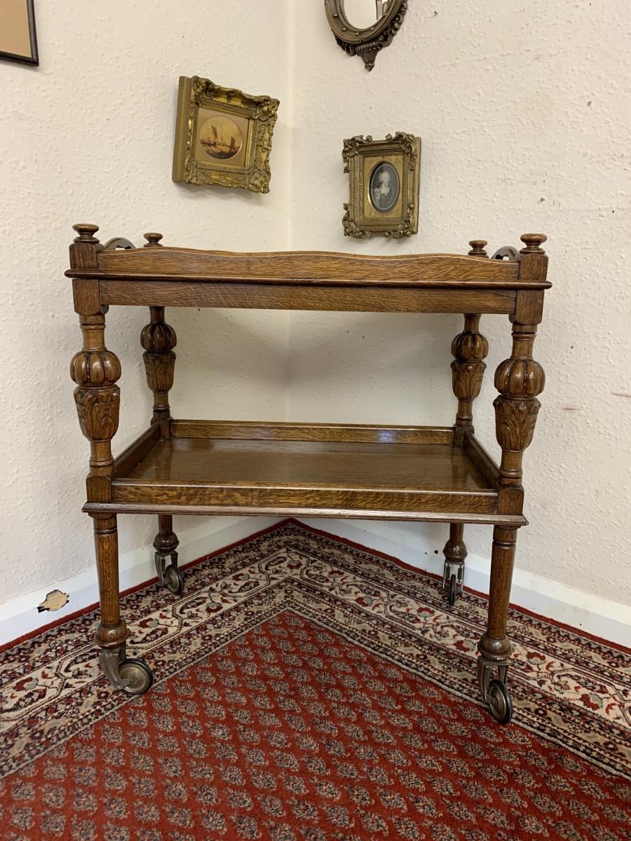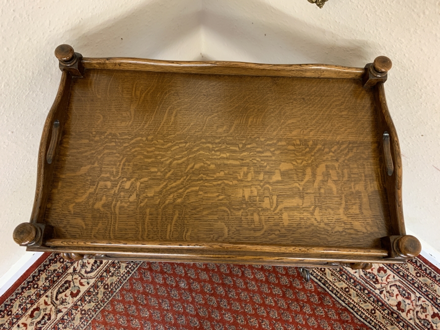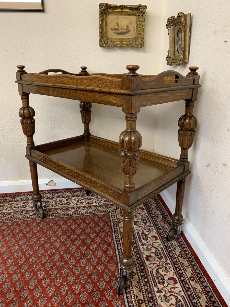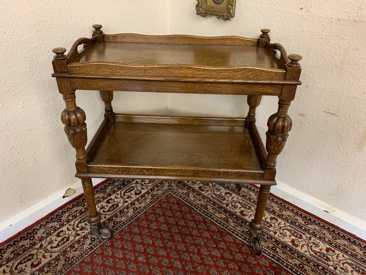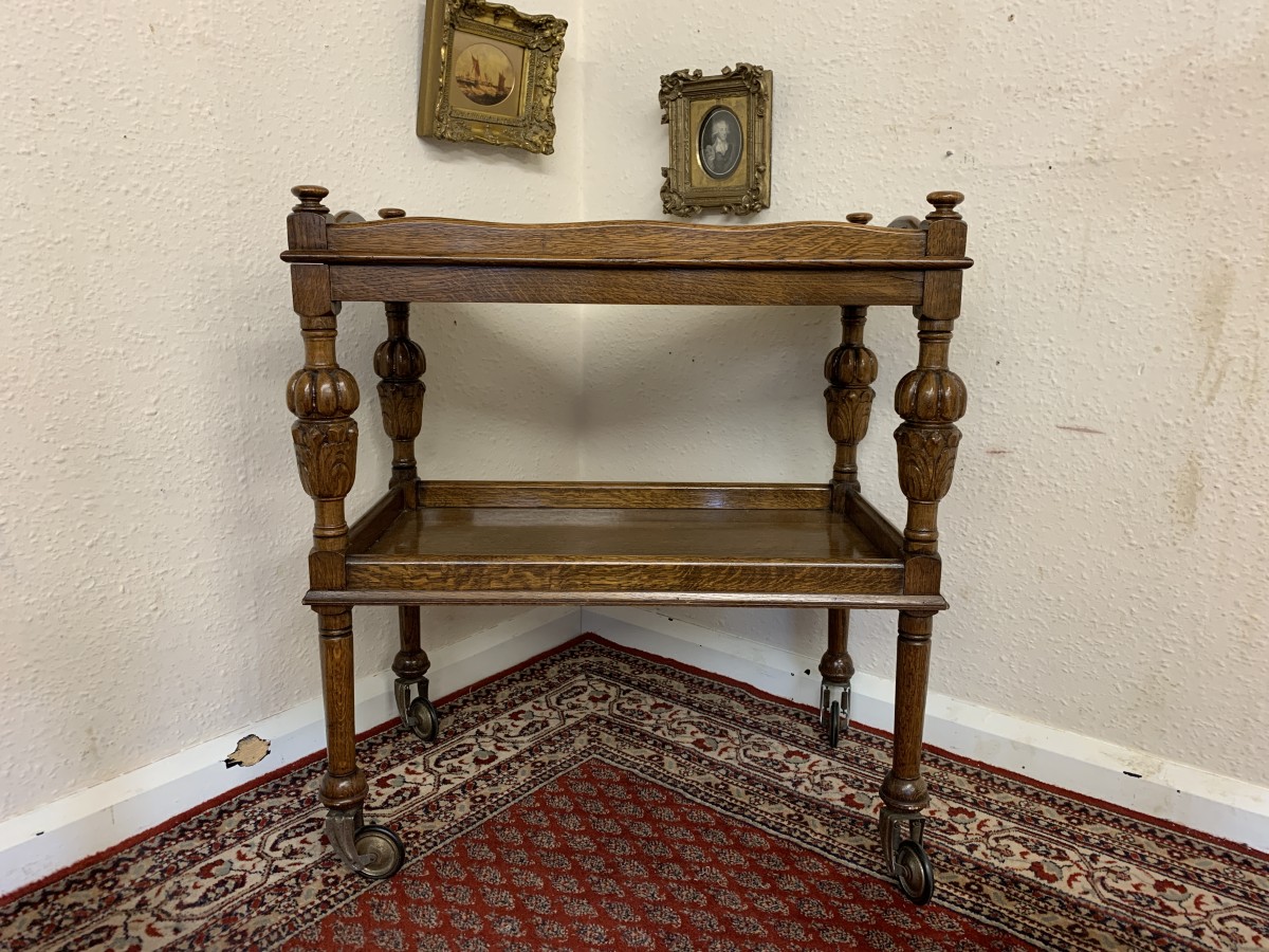 Made in glorious solid oak and in excellent condition this rare tray top trolley dates circa 1925. Having four carved baluster central supports leading down to four turned legs with rare 'suspension' casters. The tops show beautiful figuring with the uper one a two handled lift off tray which would be taken to guests.