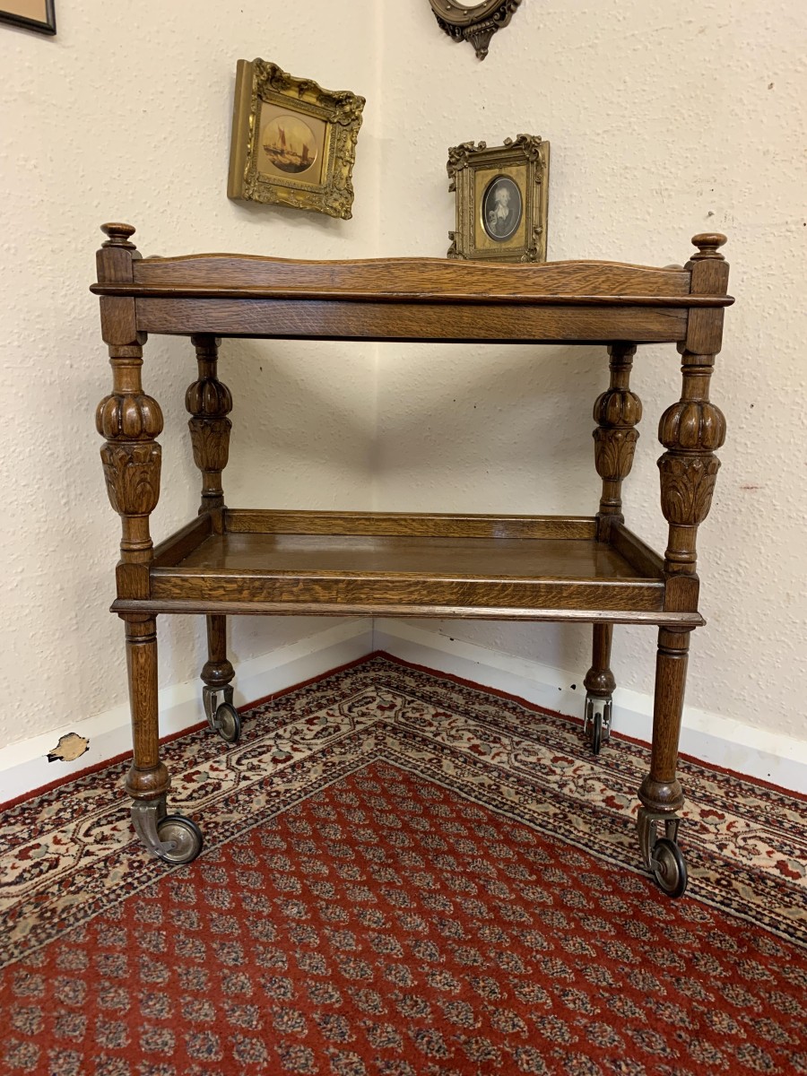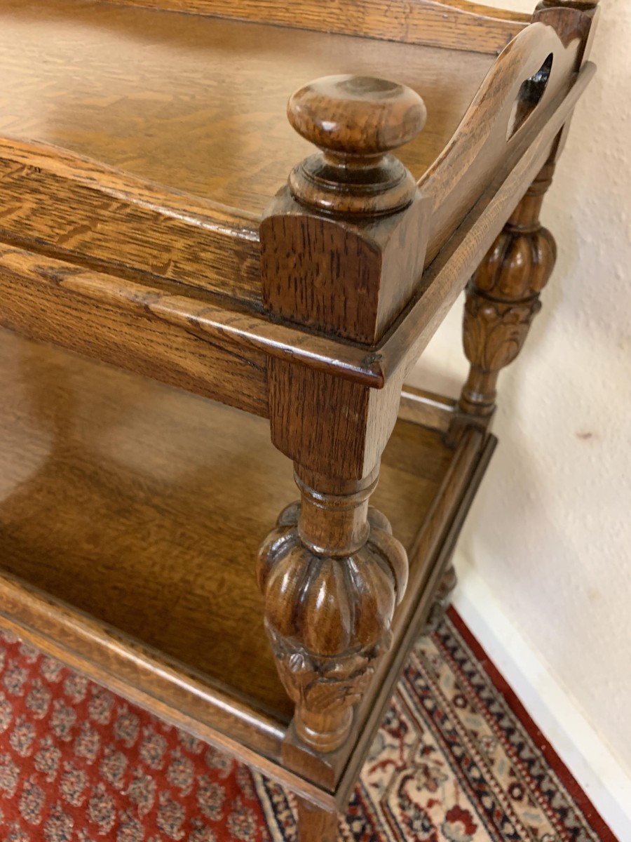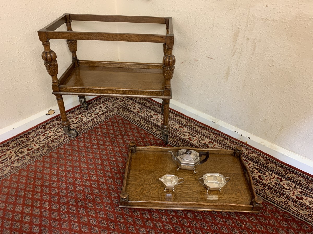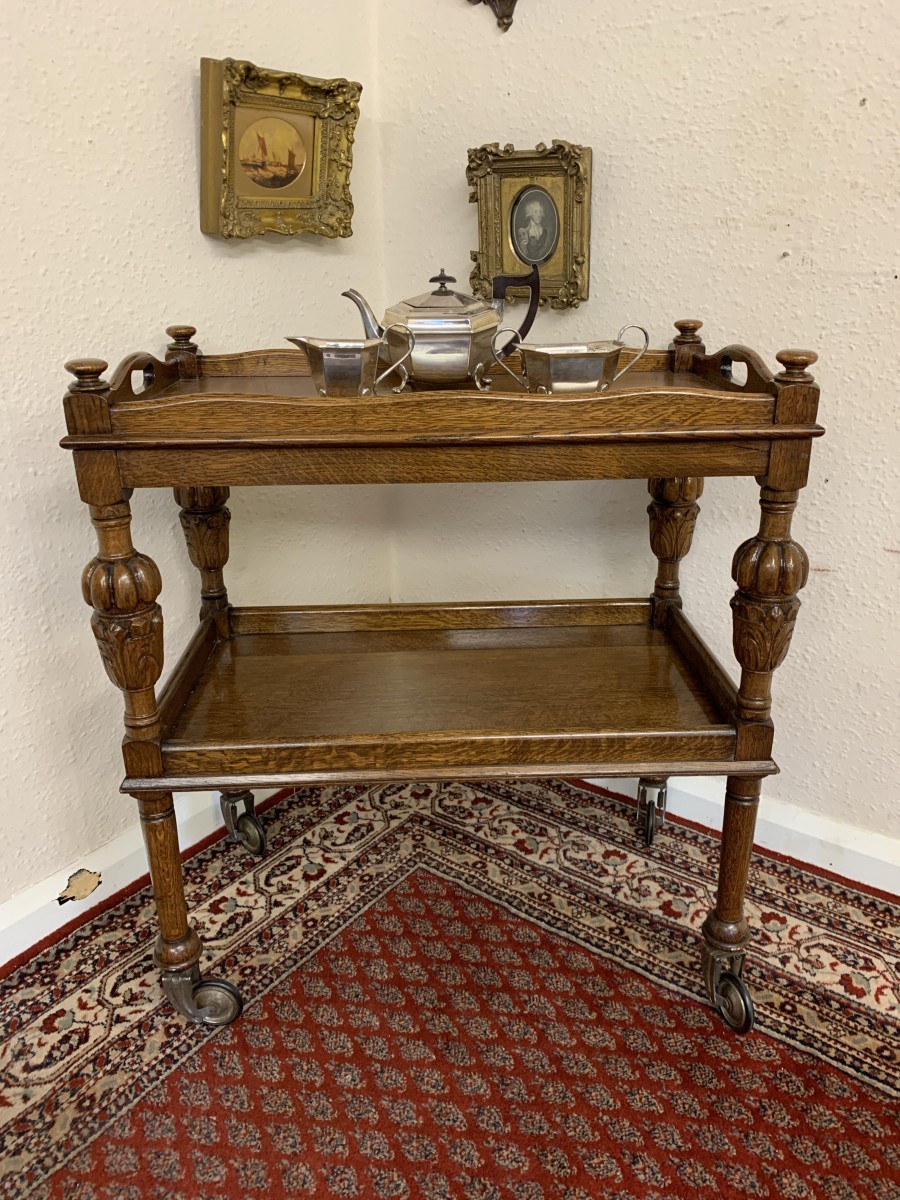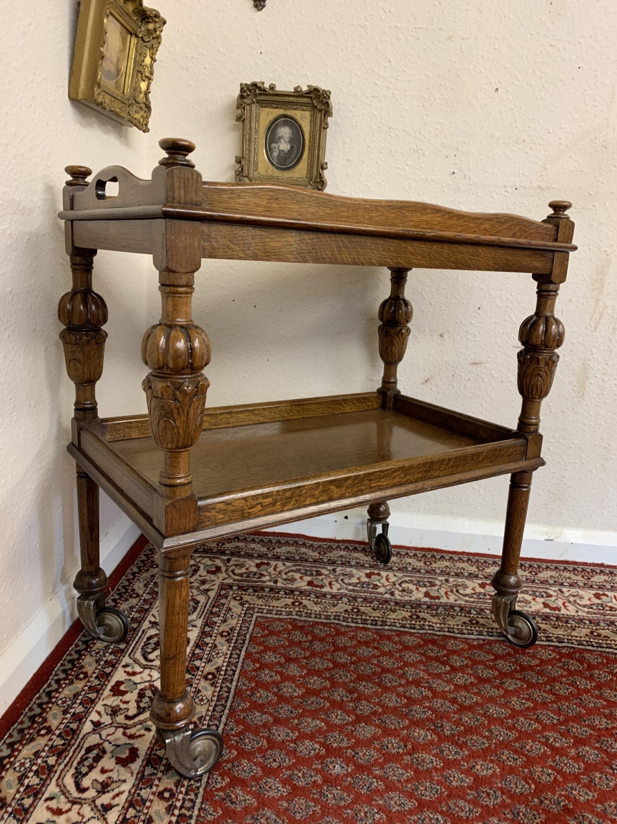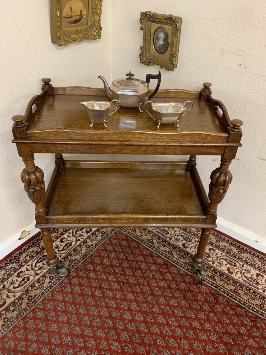 Made in glorious solid oak and in excellent condition this rare tray top trolley dates circa 1925. Having four carved baluster central supports leading down to four turned legs with rare 'suspension' casters. The tops show beautiful figuring with the uper one a two handled lift off tray which would be taken to guests.