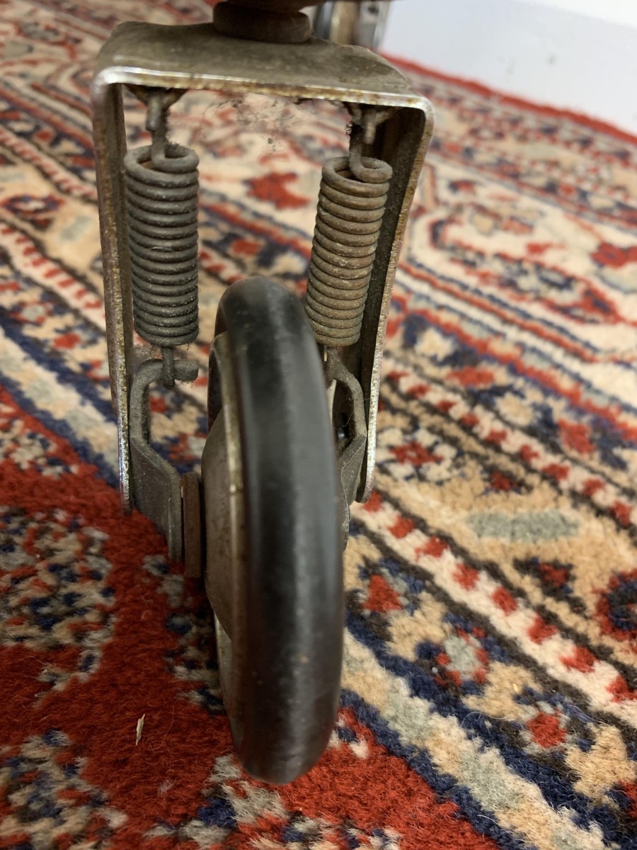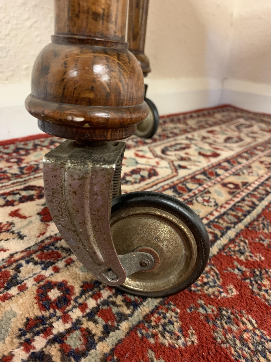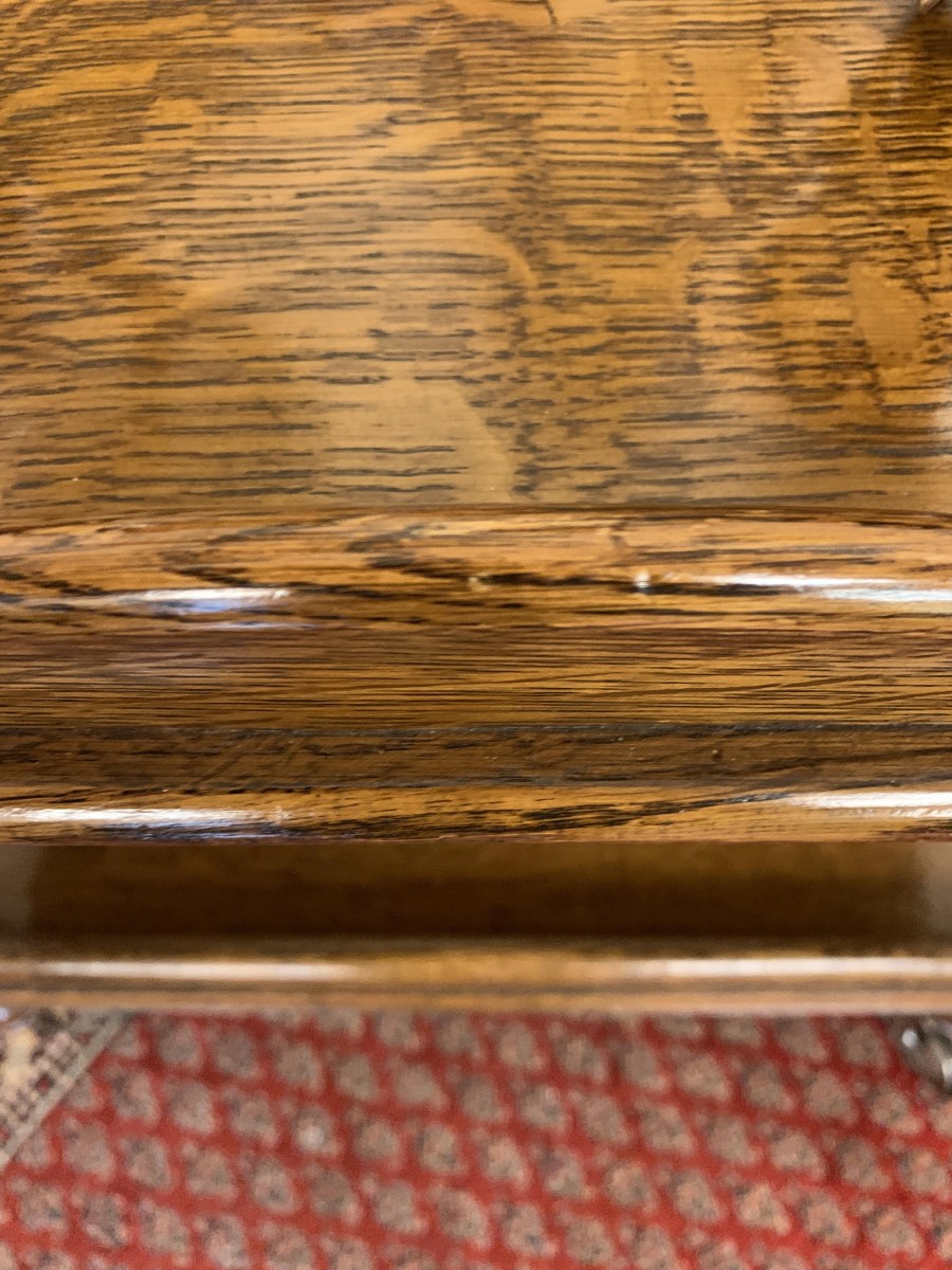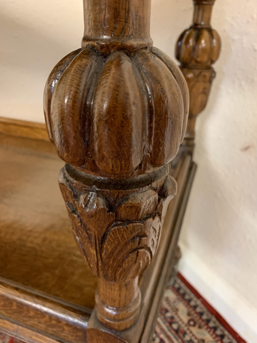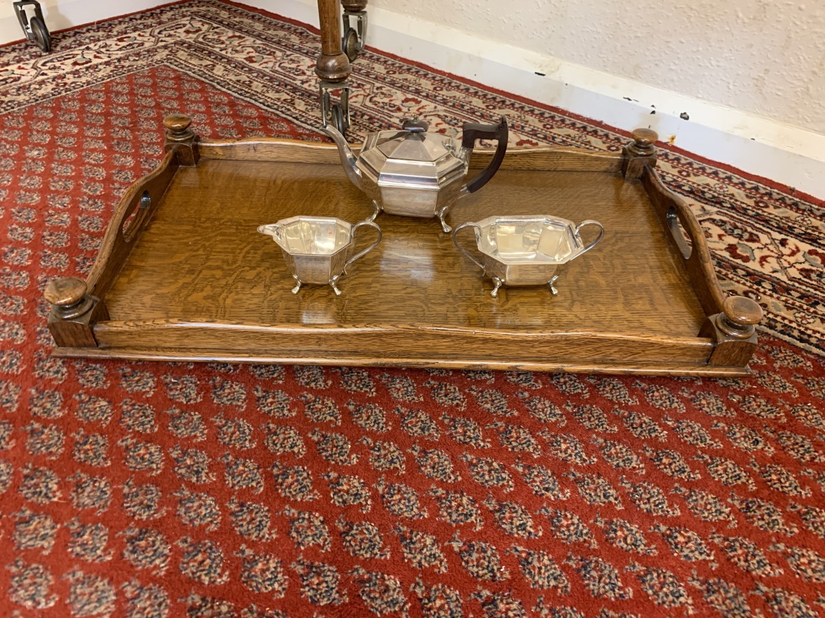 Made in glorious solid oak and in excellent condition this rare tray top trolley dates circa 1925. Having four carved baluster central supports leading down to four turned legs with rare 'suspension' casters. The tops show beautiful figuring with the uper one a two handled lift off tray which would be taken to guests.