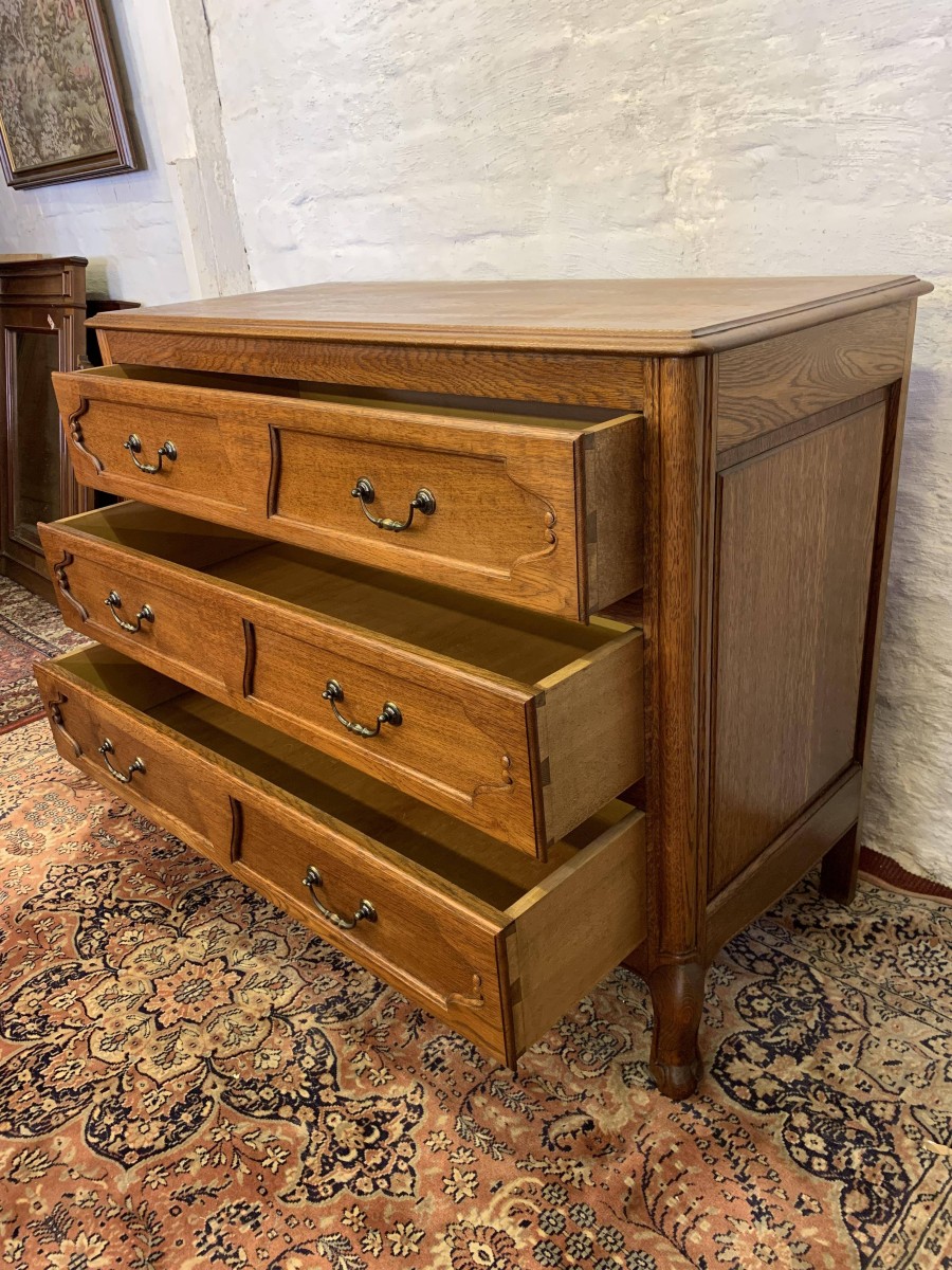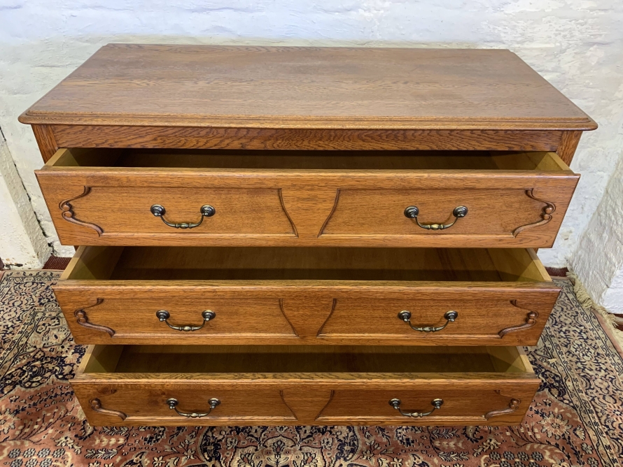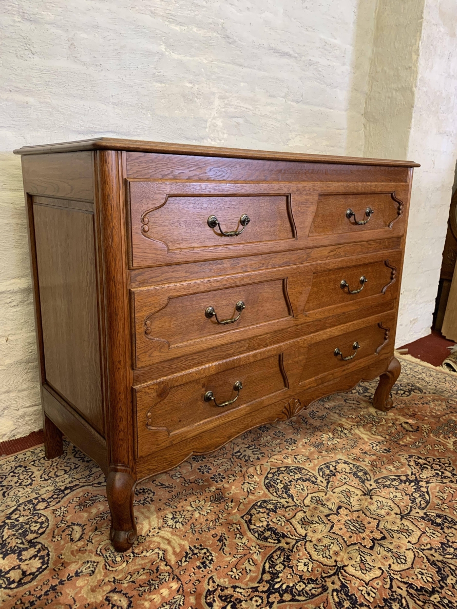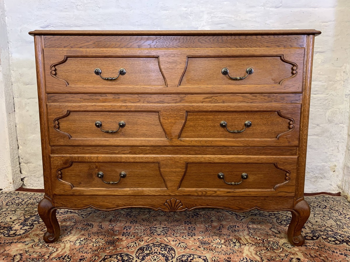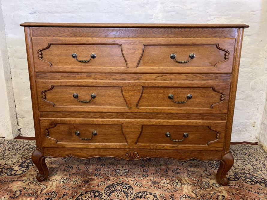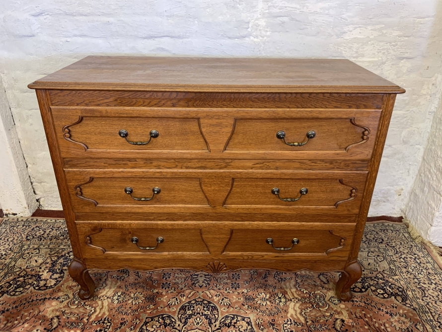 Made in glorious solid oak. The oversailing top sits above three carved recessed panelled drawers, each drawer having a pair of brass handles. Recessed panelled sides, shaped skirt with central ornate carving this elegant French chest of drawers stands on two carved cabriole shaped legs to the front.