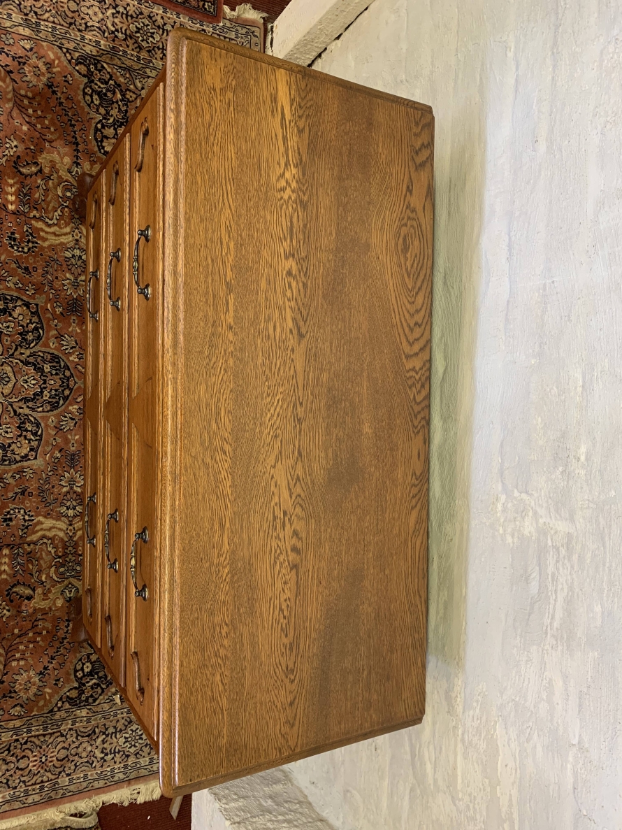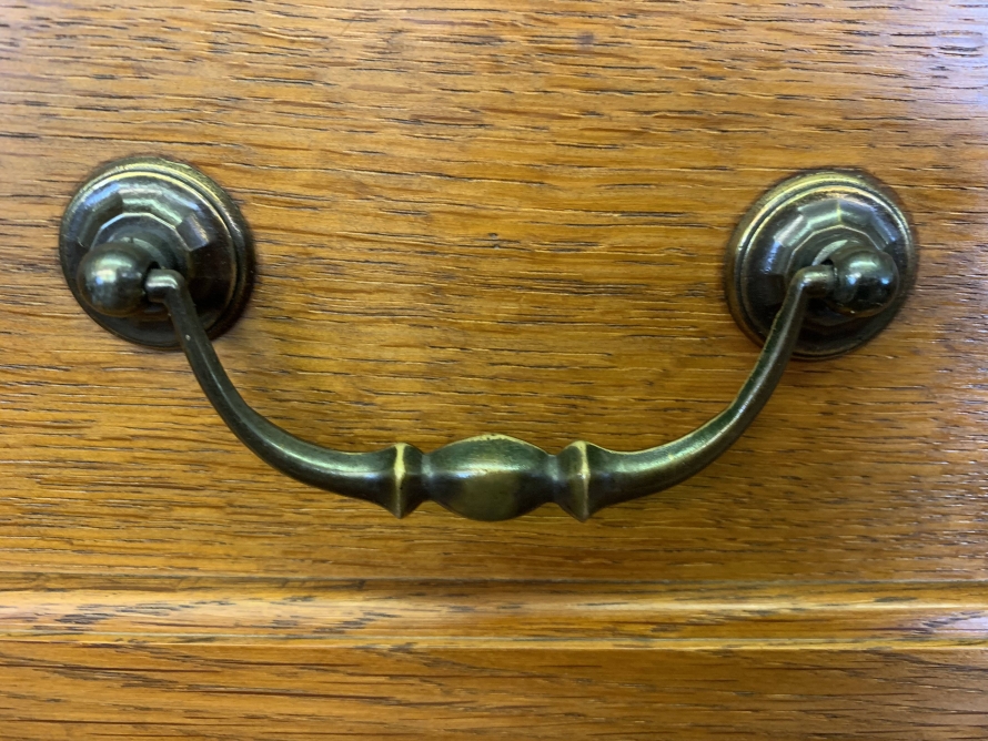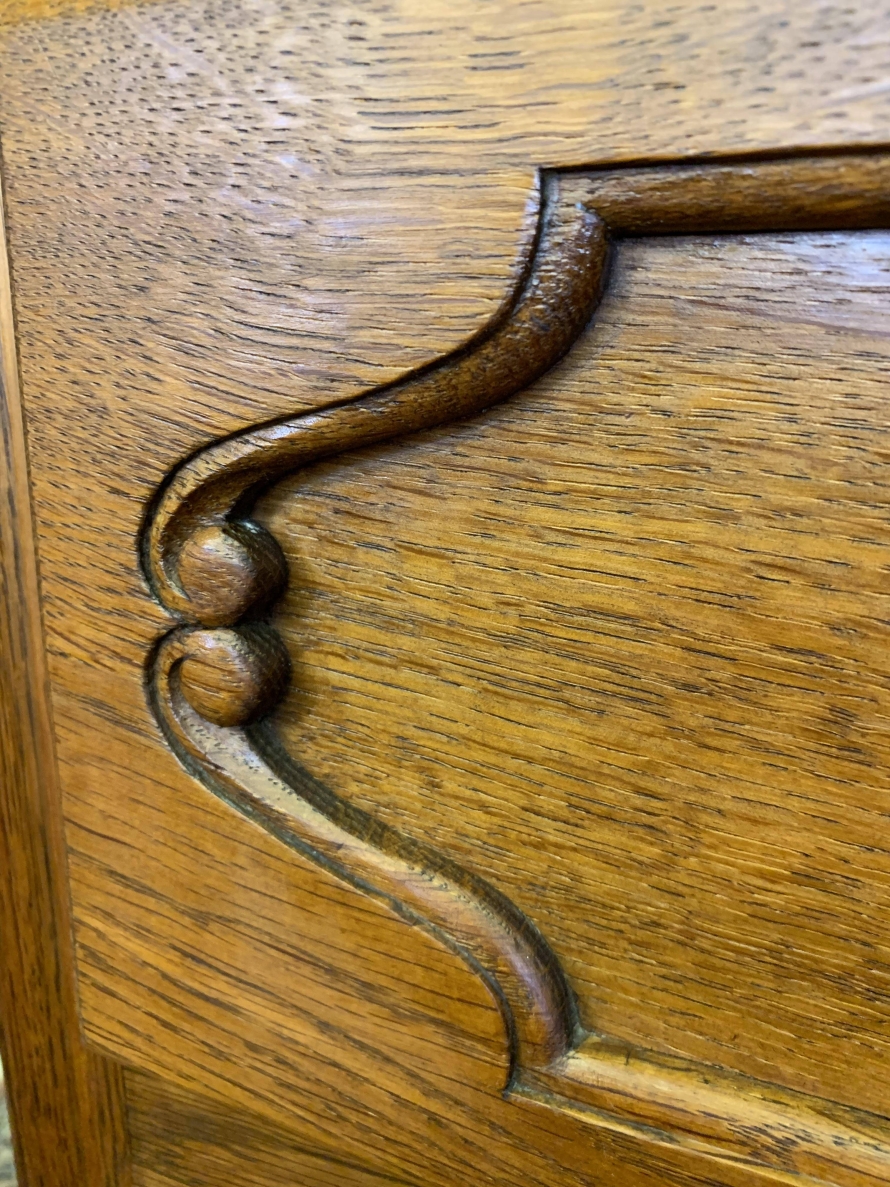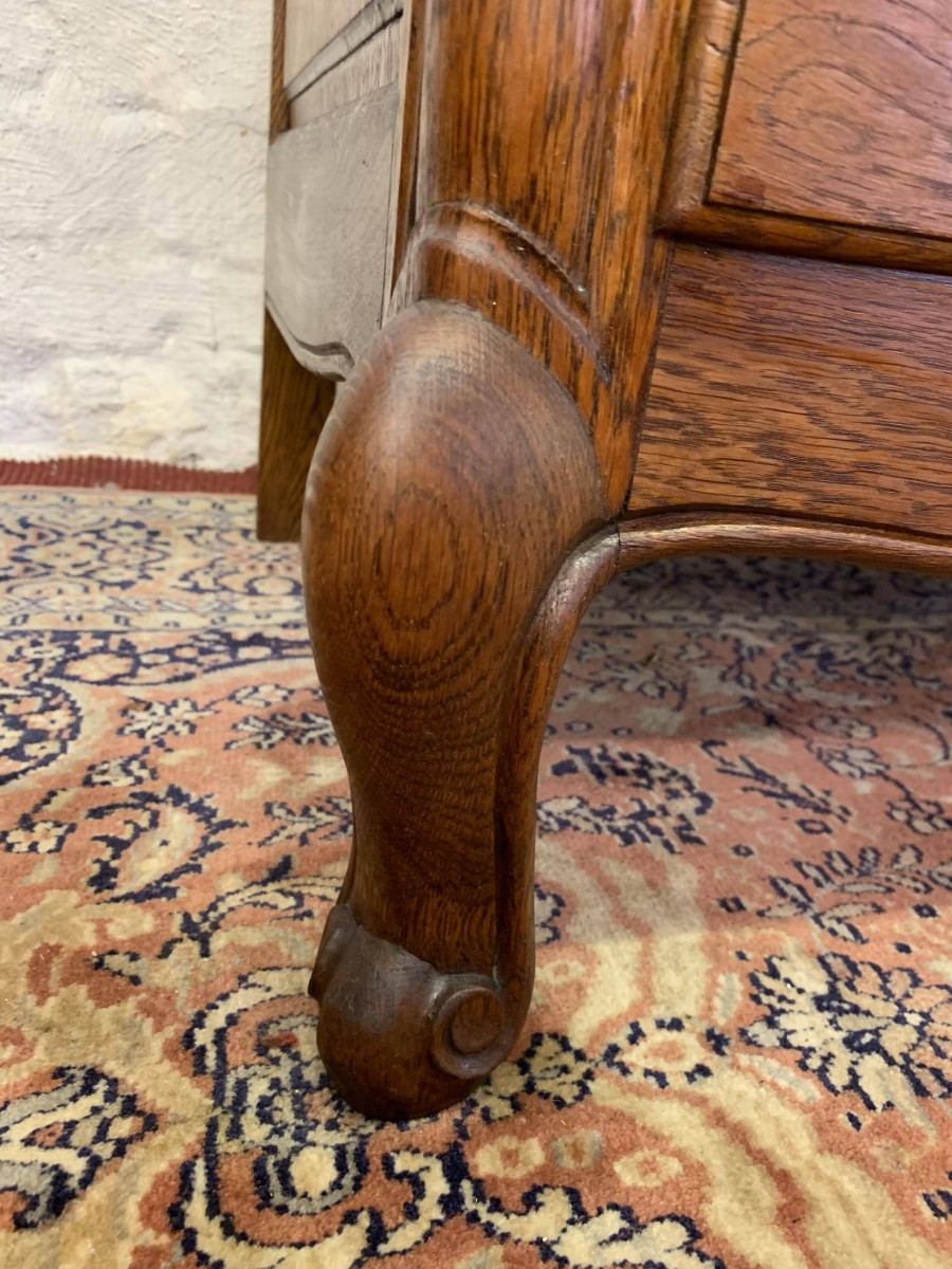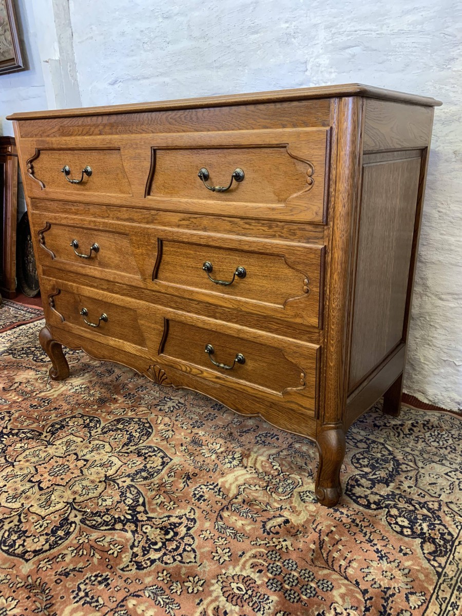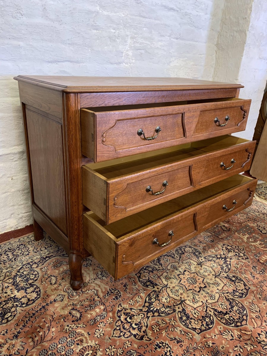 Made in glorious solid oak. The oversailing top sits above three carved recessed panelled drawers, each drawer having a pair of brass handles. Recessed panelled sides, shaped skirt with central ornate carving this elegant French chest of drawers stands on two carved cabriole shaped legs to the front.