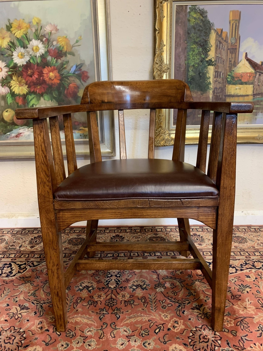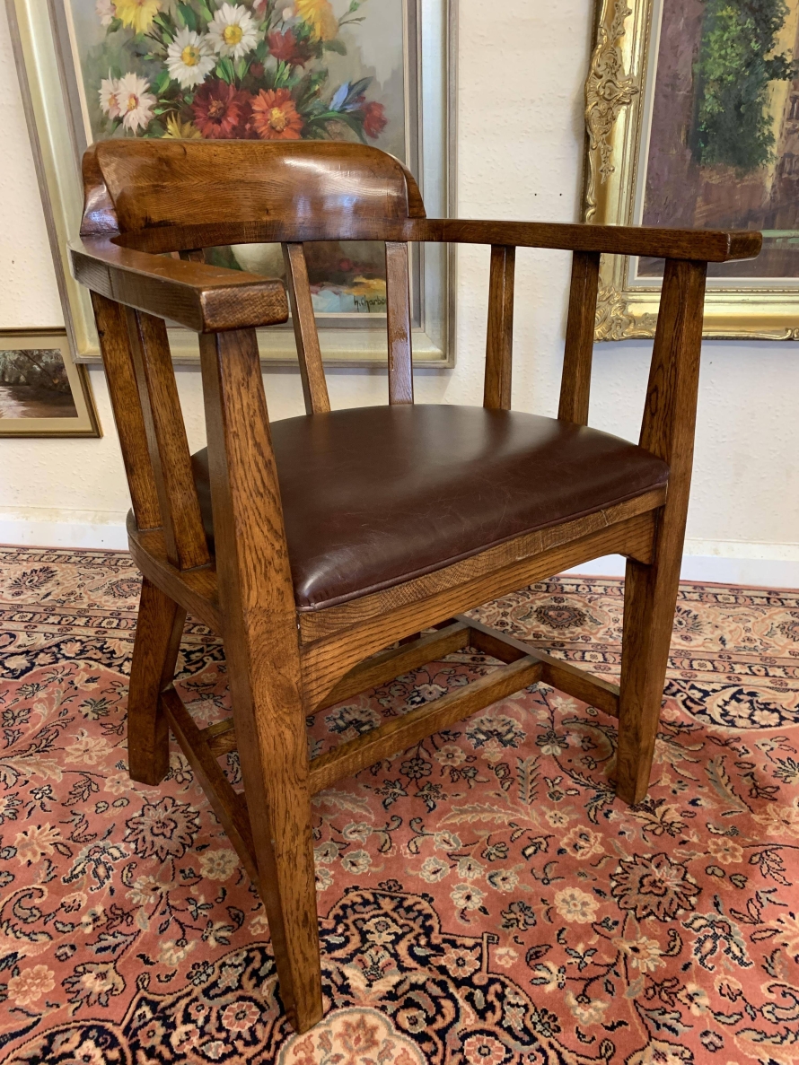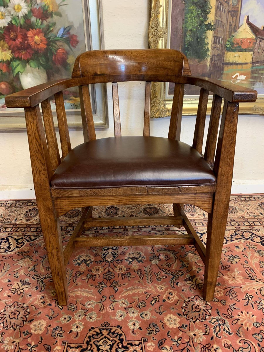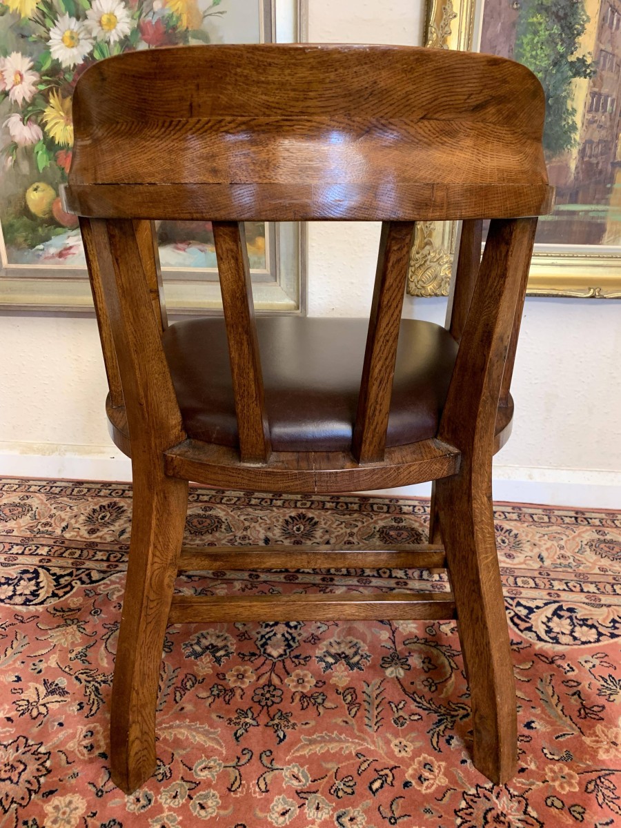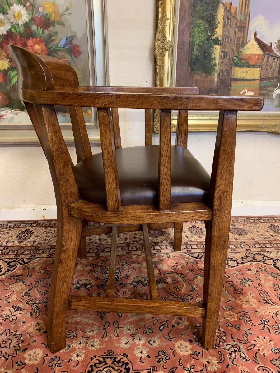 Made in solid oak, the chair has a leathered upholstered cushioned seat, stretcher supports, shaped back legs with tapered front legs.