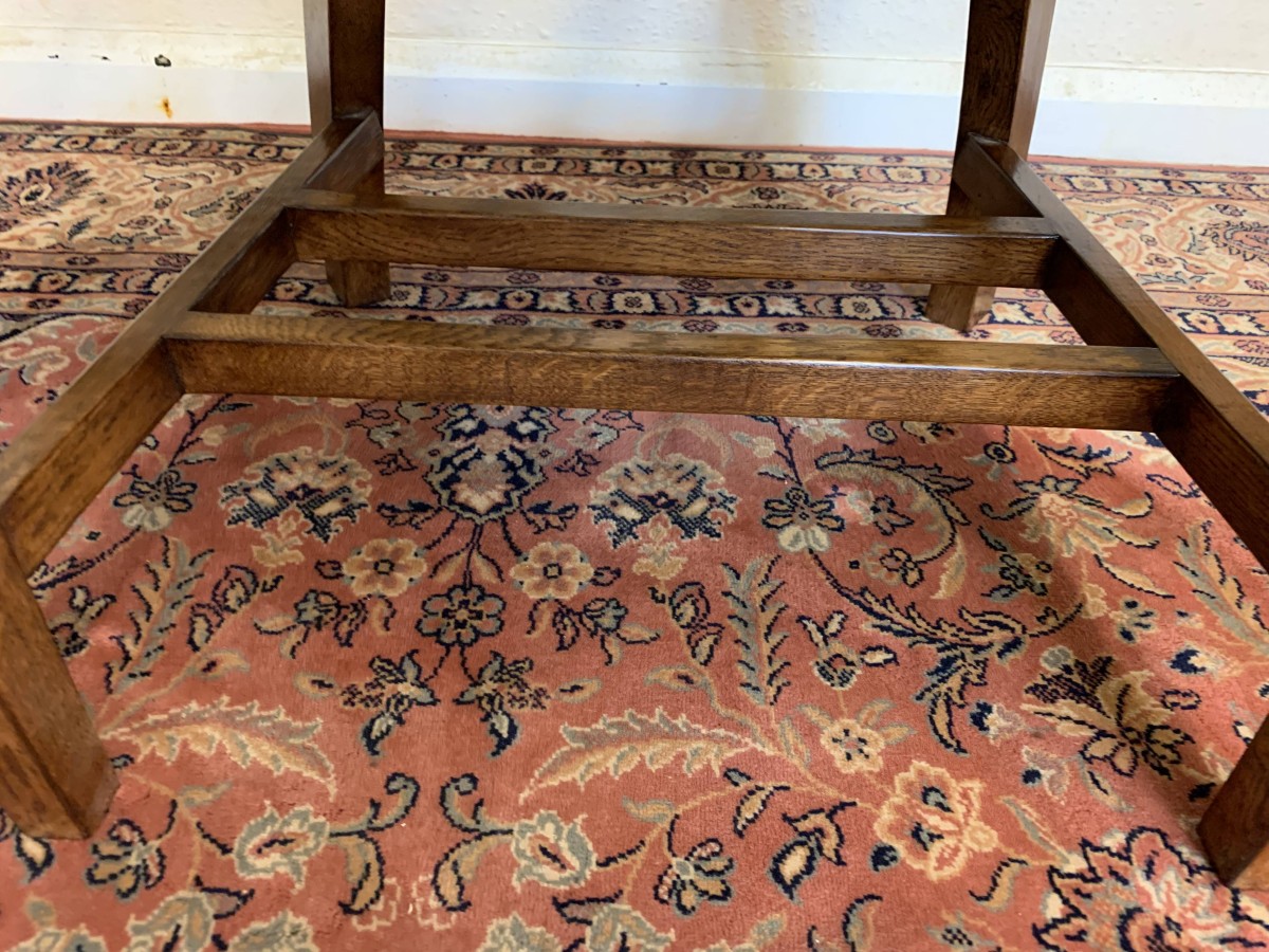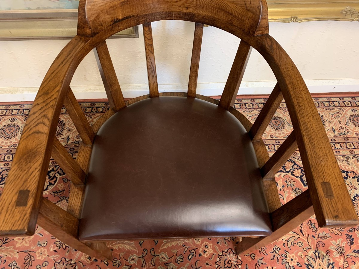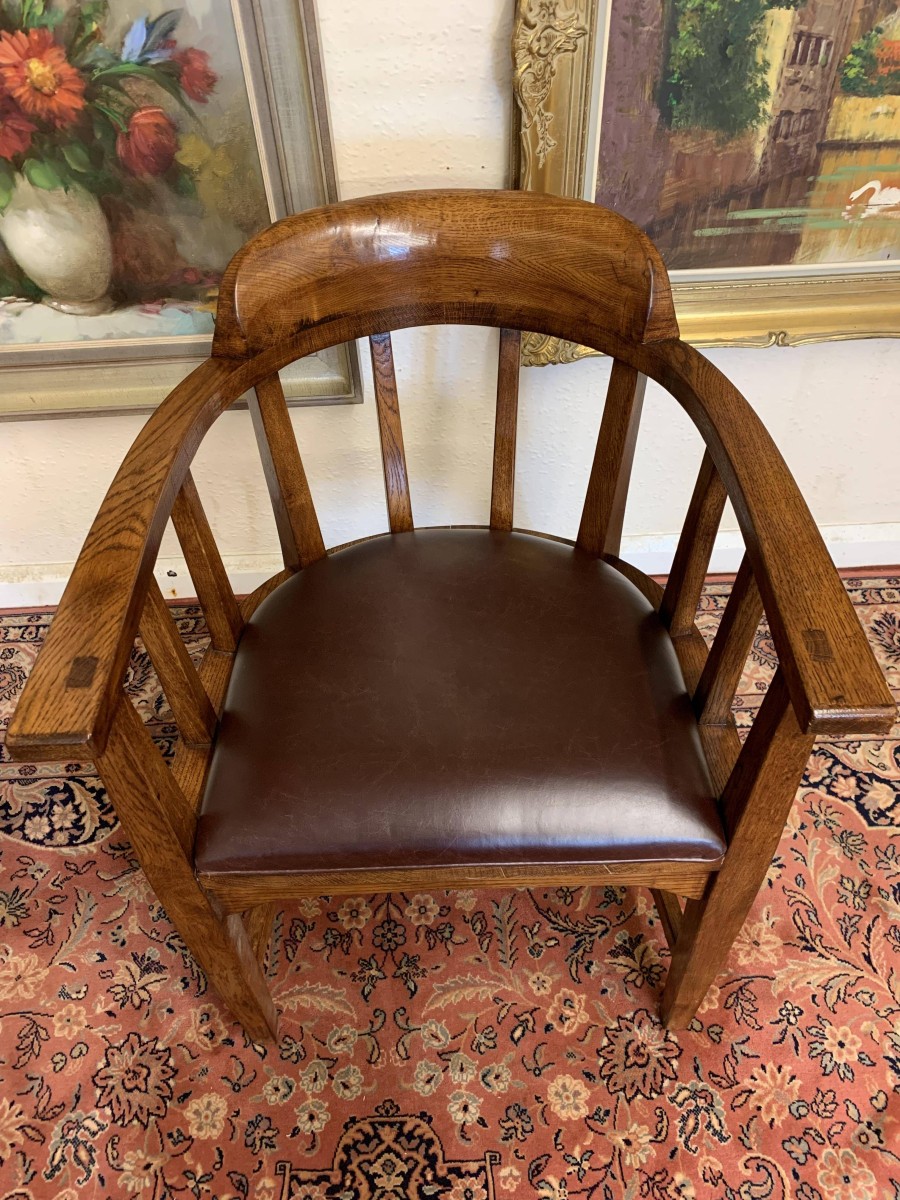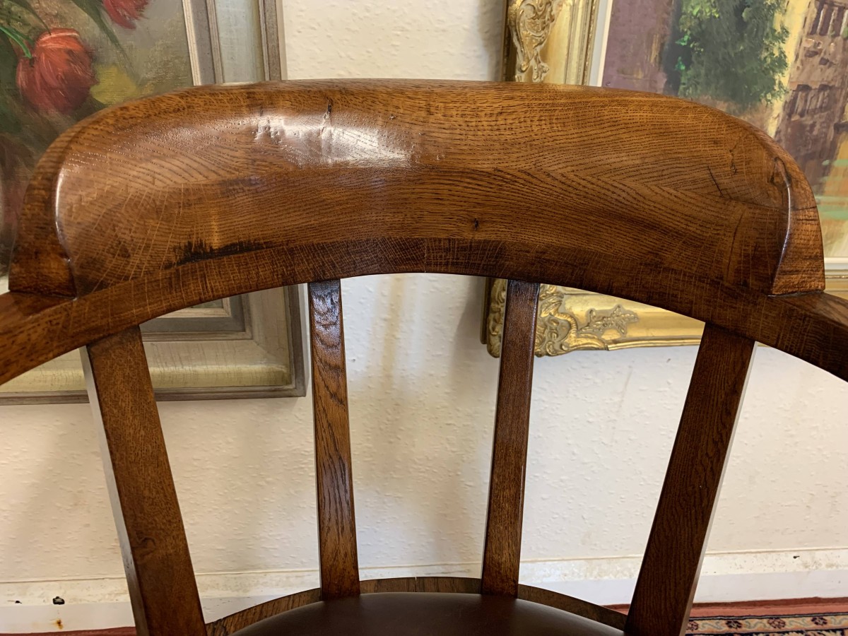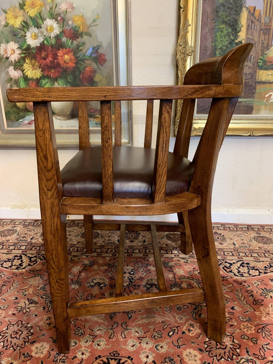 Made in solid oak, the chair has a leathered upholstered cushioned seat, stretcher supports, shaped back legs with tapered front legs.