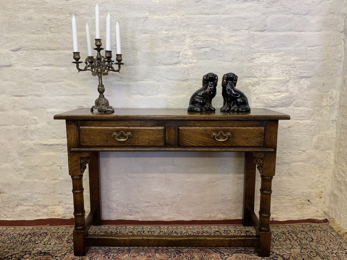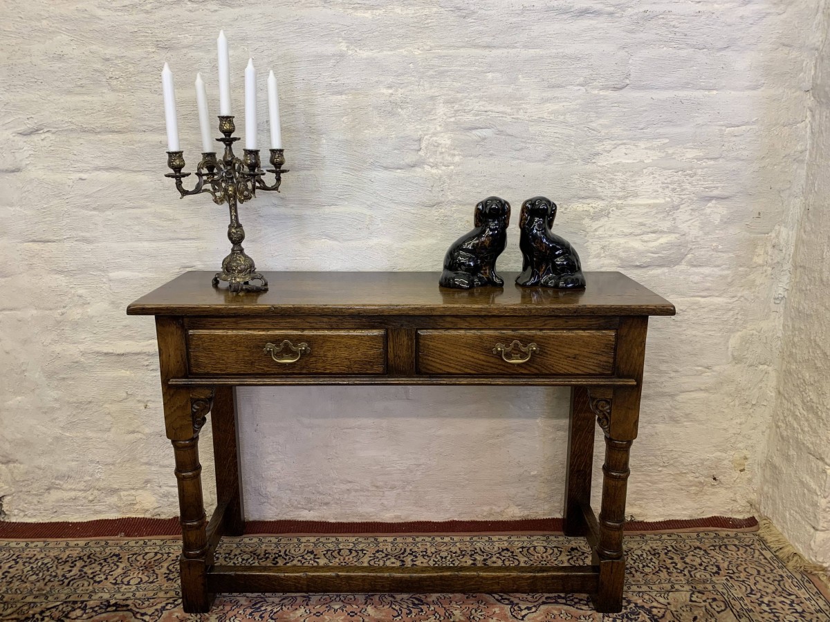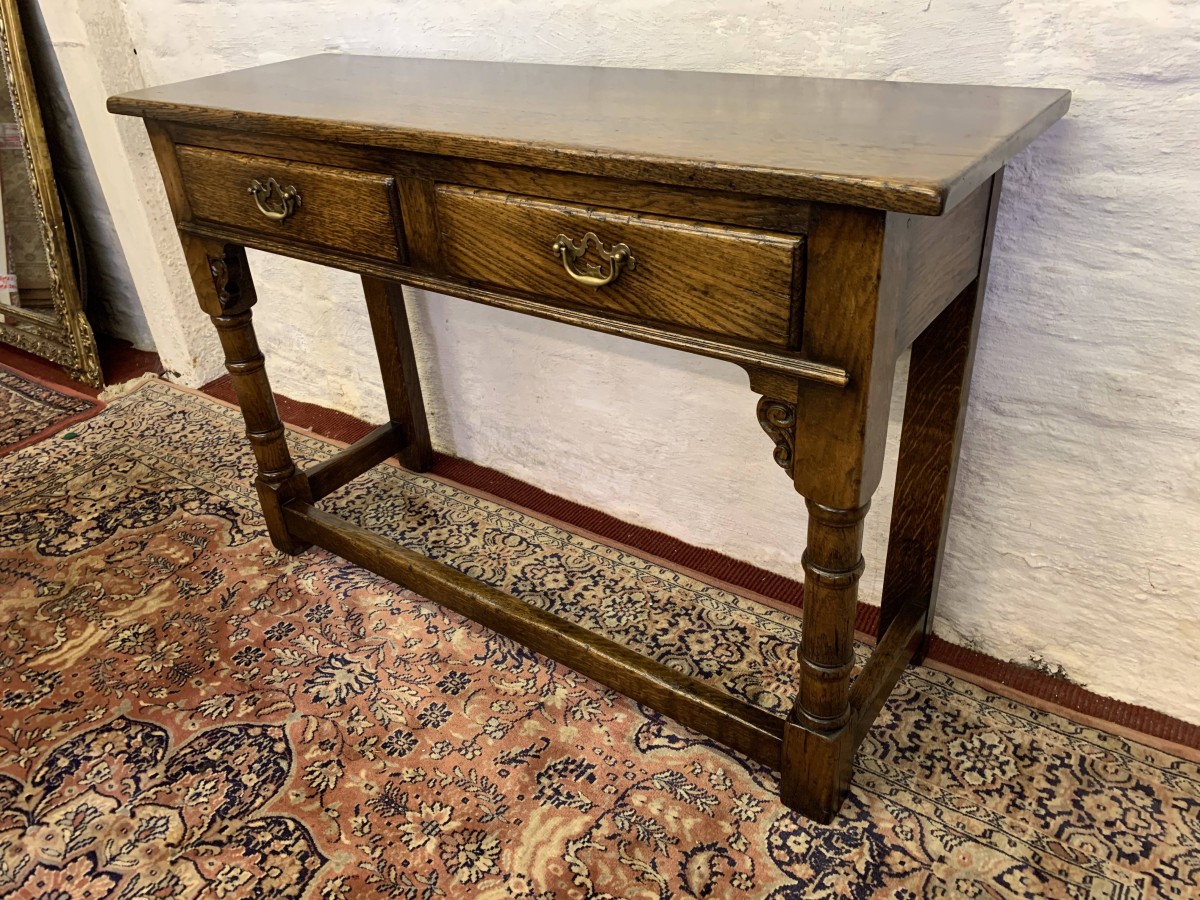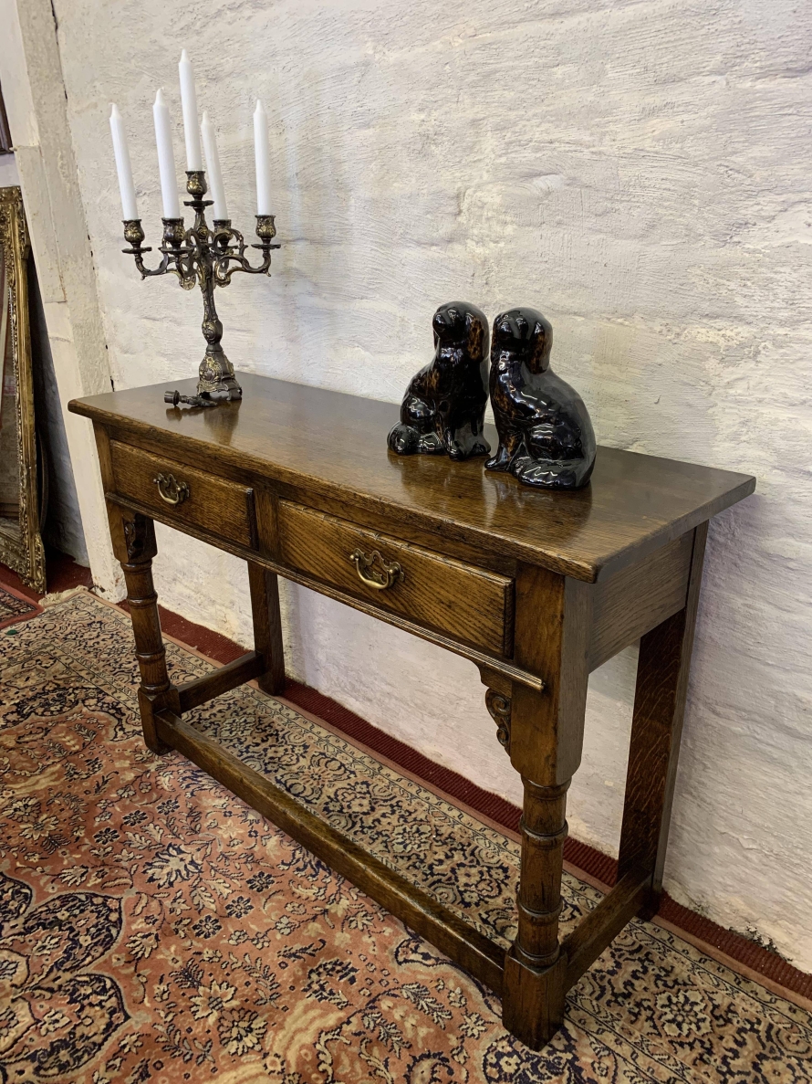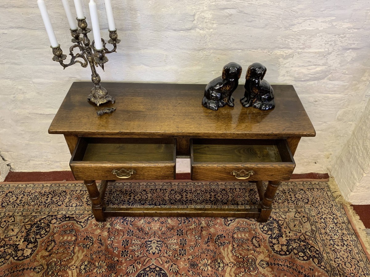 This console table is made in fantastic solid oak and is in excellent condition. The oversailing top sits above a pair of drawers, each drawer having a brass ornate handle. Having two turned legs to the front, stretcher supports and standing on traditional block feet.