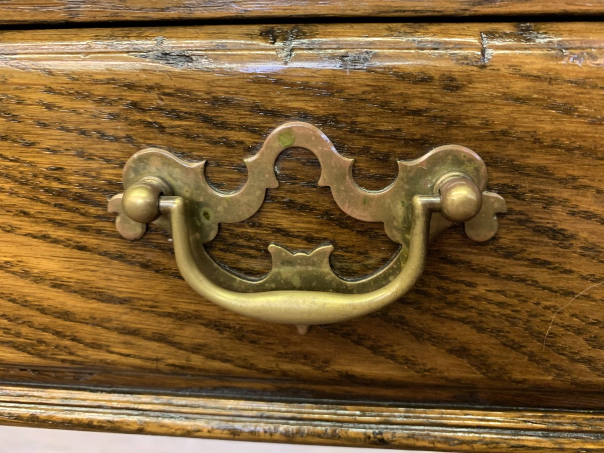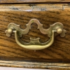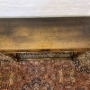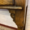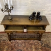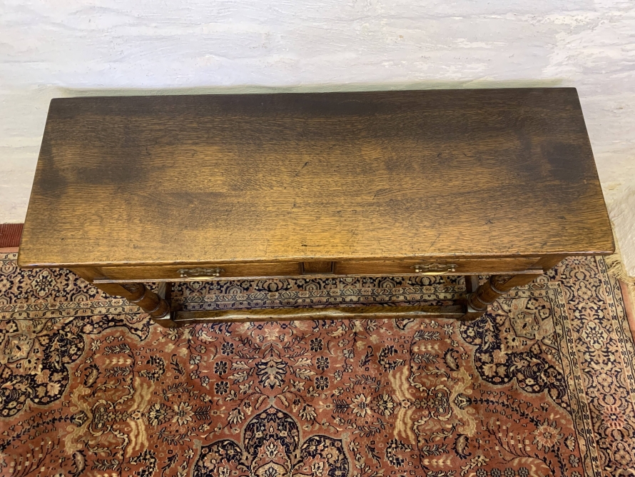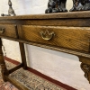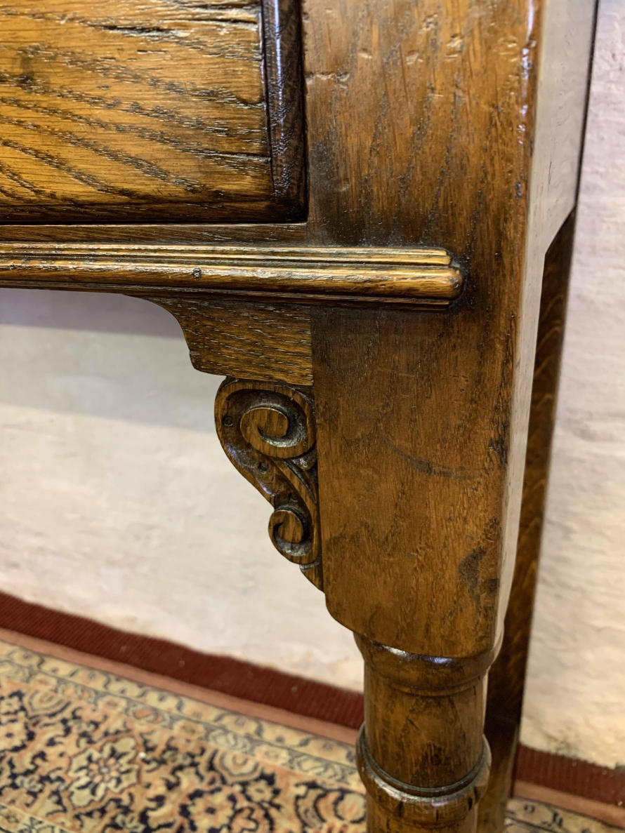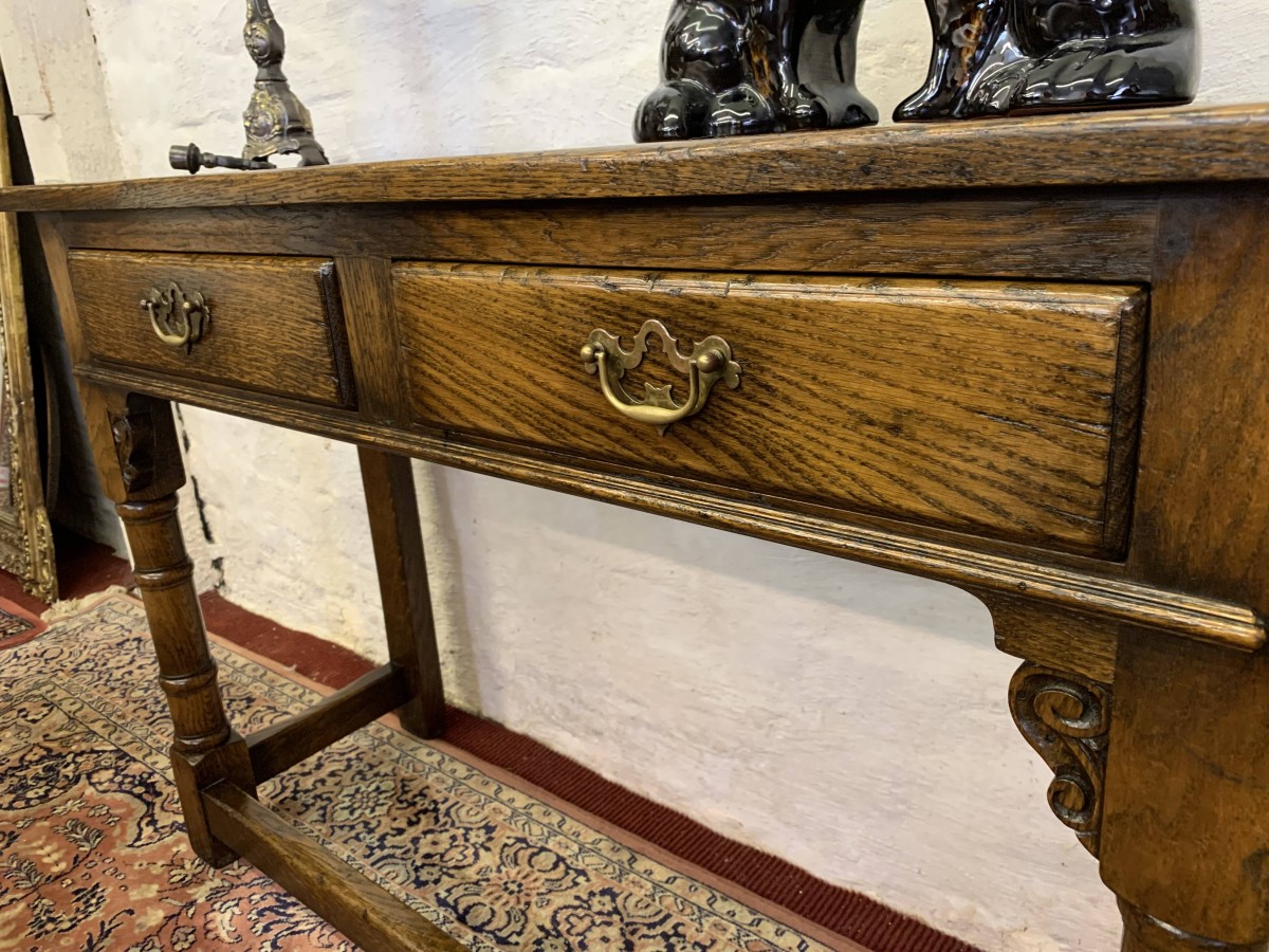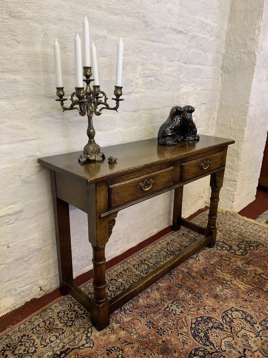 This console table is made in fantastic solid oak and is in excellent condition. The oversailing top sits above a pair of drawers, each drawer having a brass ornate handle. Having two turned legs to the front, stretcher supports and standing on traditional block feet.