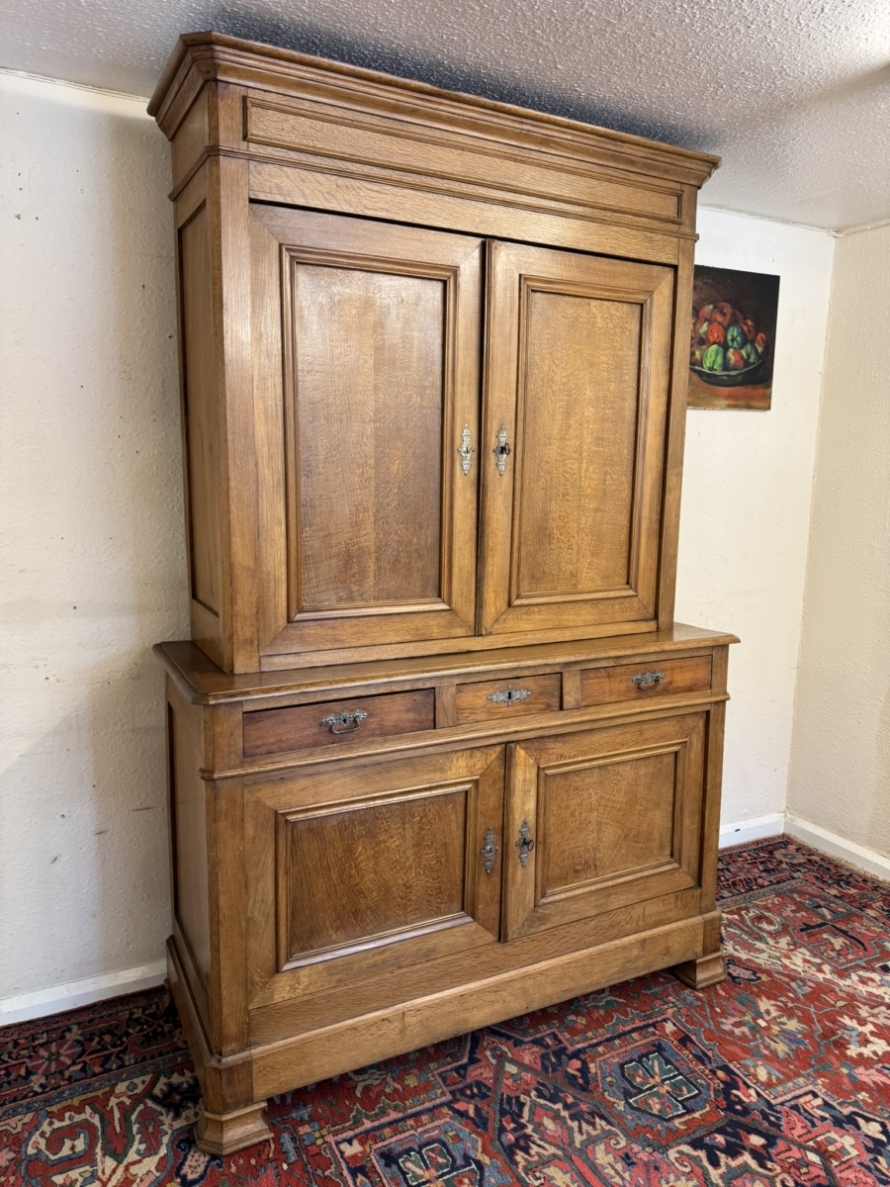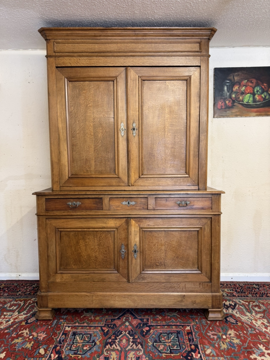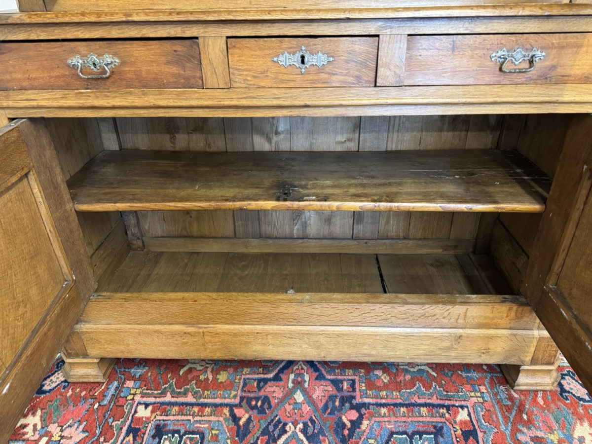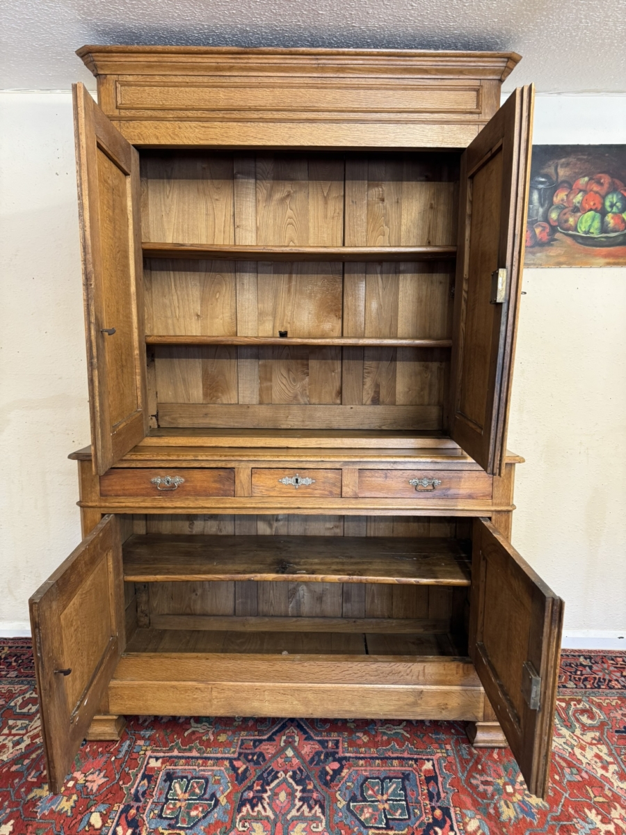 This superb housekeepers cupboard dates circa 1870. The stepped top sits above a pair of lockable recessed panelled doors, the doors open to reveal a panelled back and two removable wooden shelves, below are three drawers, the drawers sit above a pair of recessed panelled lockable doors, the door opens to reveal panelled back and base and removable shelf. Recessed panelled sides, platform plinth base and standing on four shaped feet.