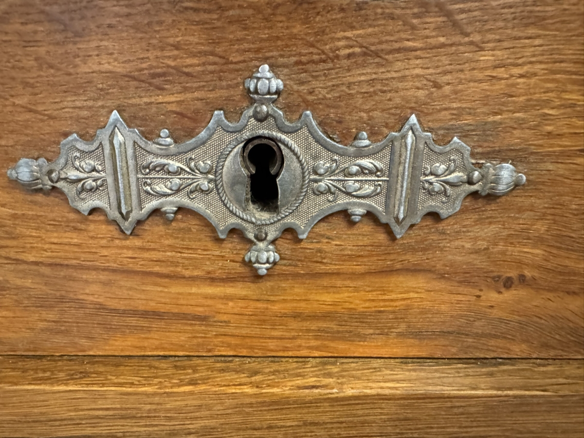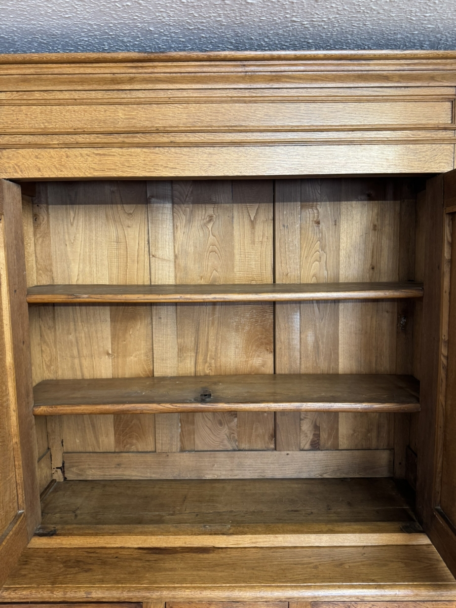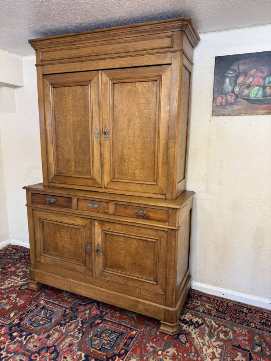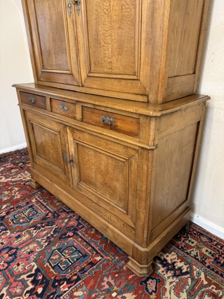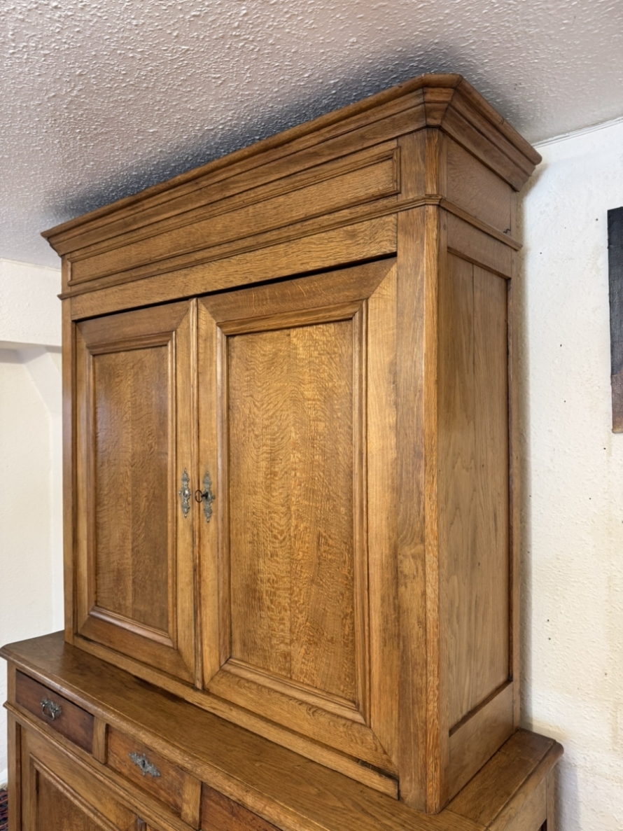 This superb housekeepers cupboard dates circa 1870. The stepped top sits above a pair of lockable recessed panelled doors, the doors open to reveal a panelled back and two removable wooden shelves, below are three drawers, the drawers sit above a pair of recessed panelled lockable doors, the door opens to reveal panelled back and base and removable shelf. Recessed panelled sides, platform plinth base and standing on four shaped feet.