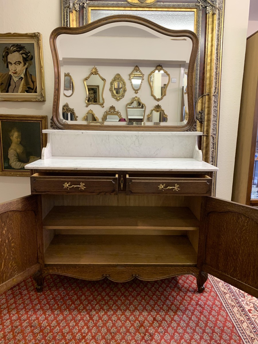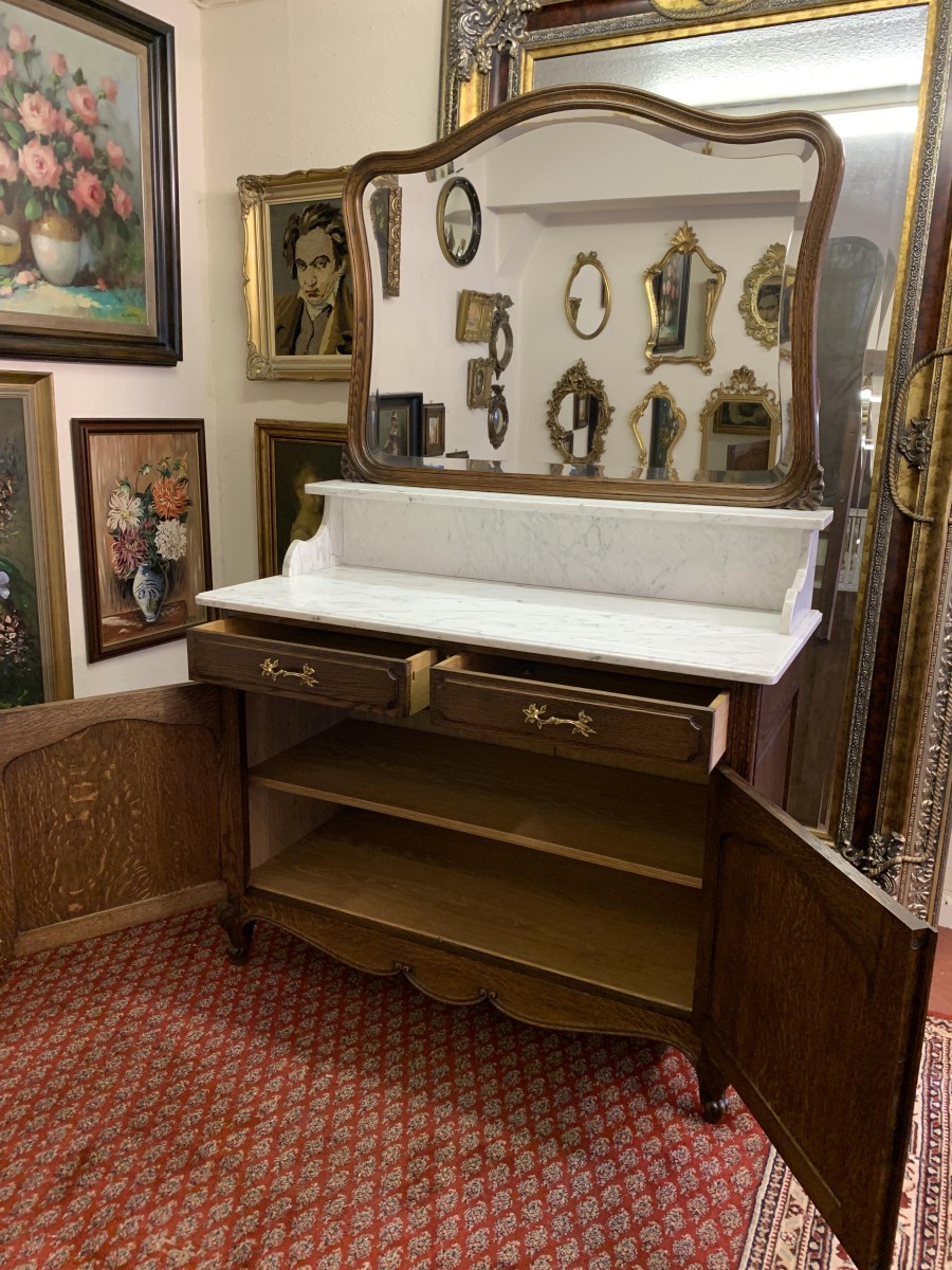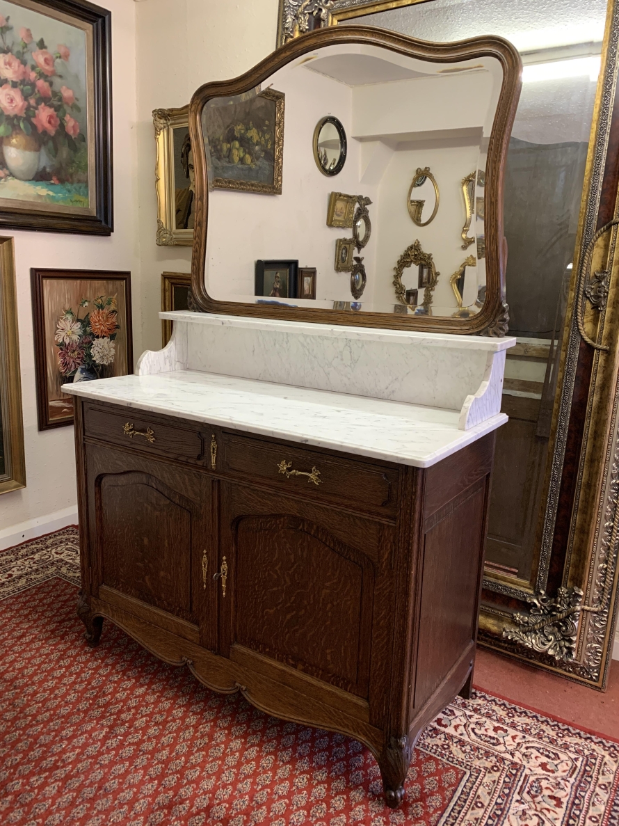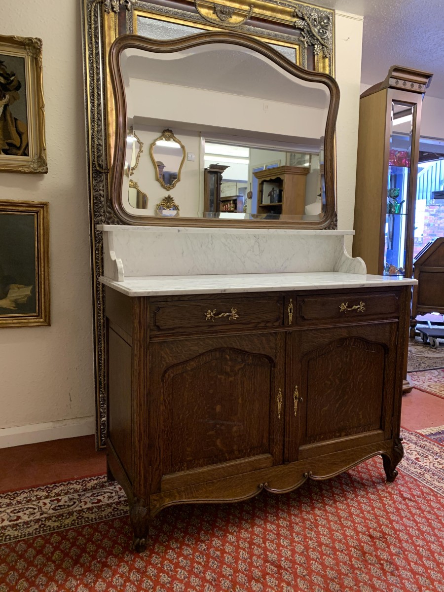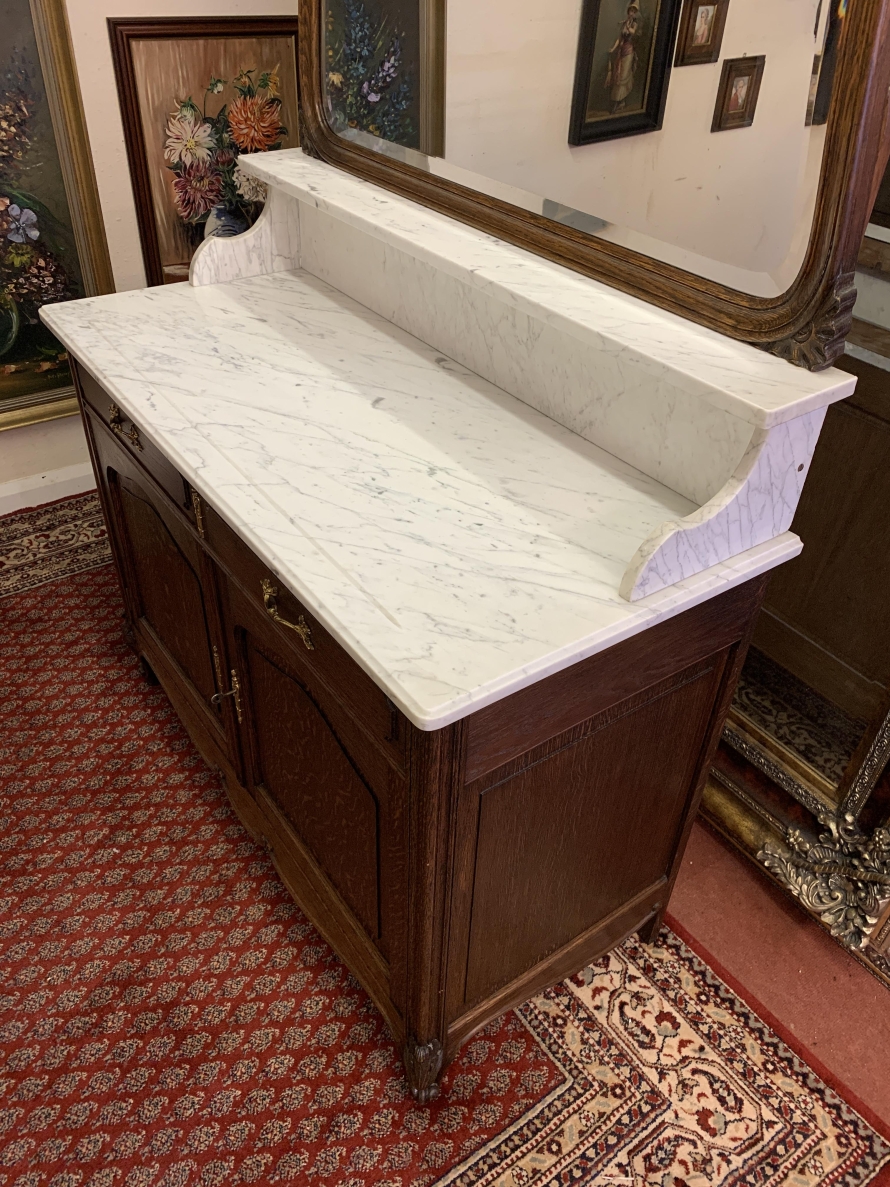 This fabulous French antique marble top commode dates circa 1890. The shaped bevel edged mirror sits on a marble shelf. The base has a marble top with two drawers below, each drawer having an ornate brass handle. Below the drawers are a pair of recessed panelled lockable doors the doors open to reveal a removable shelf. Recessed panelled sides this fabulous cabinet stands on two carved cabriole shaped legs to the front.