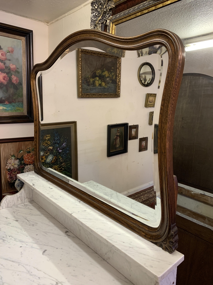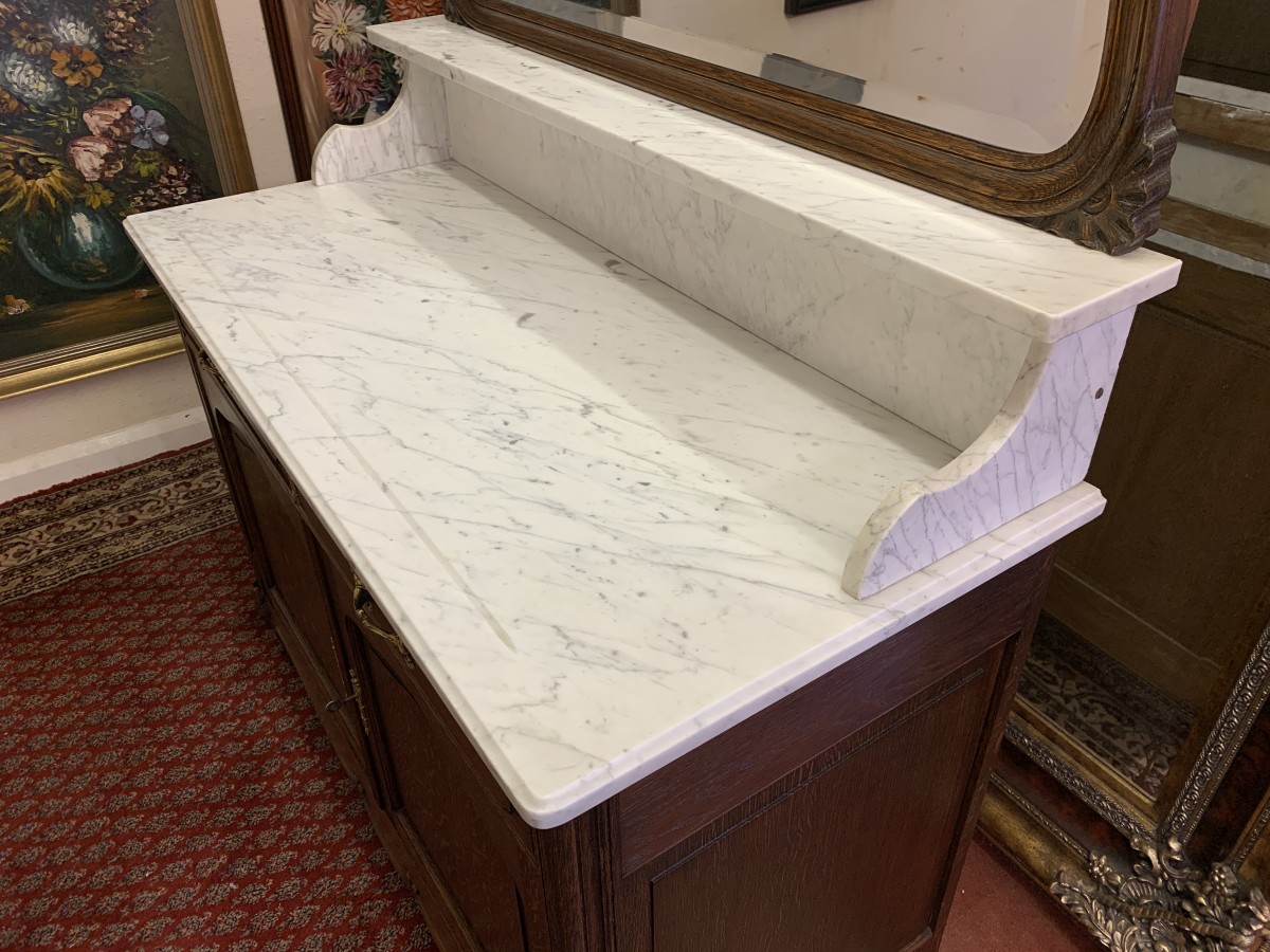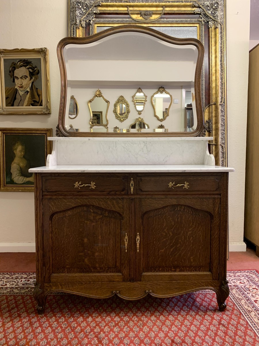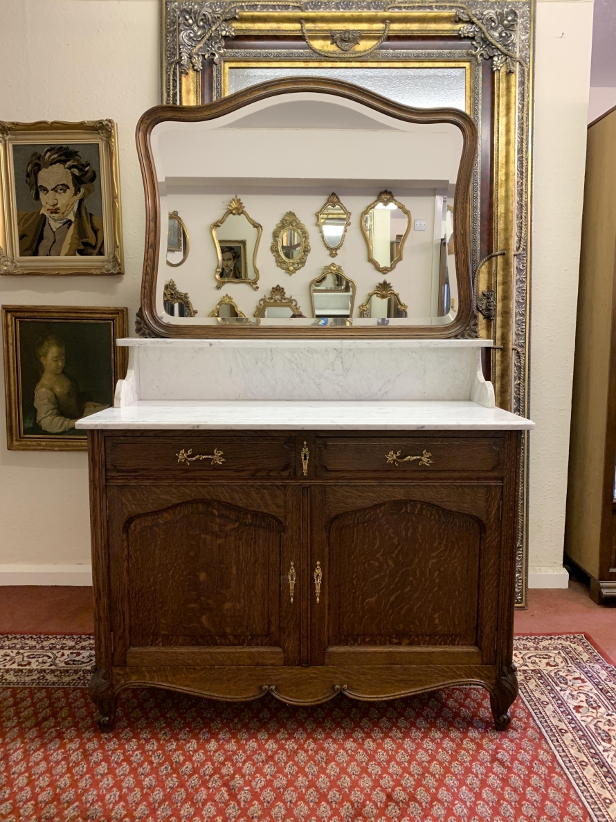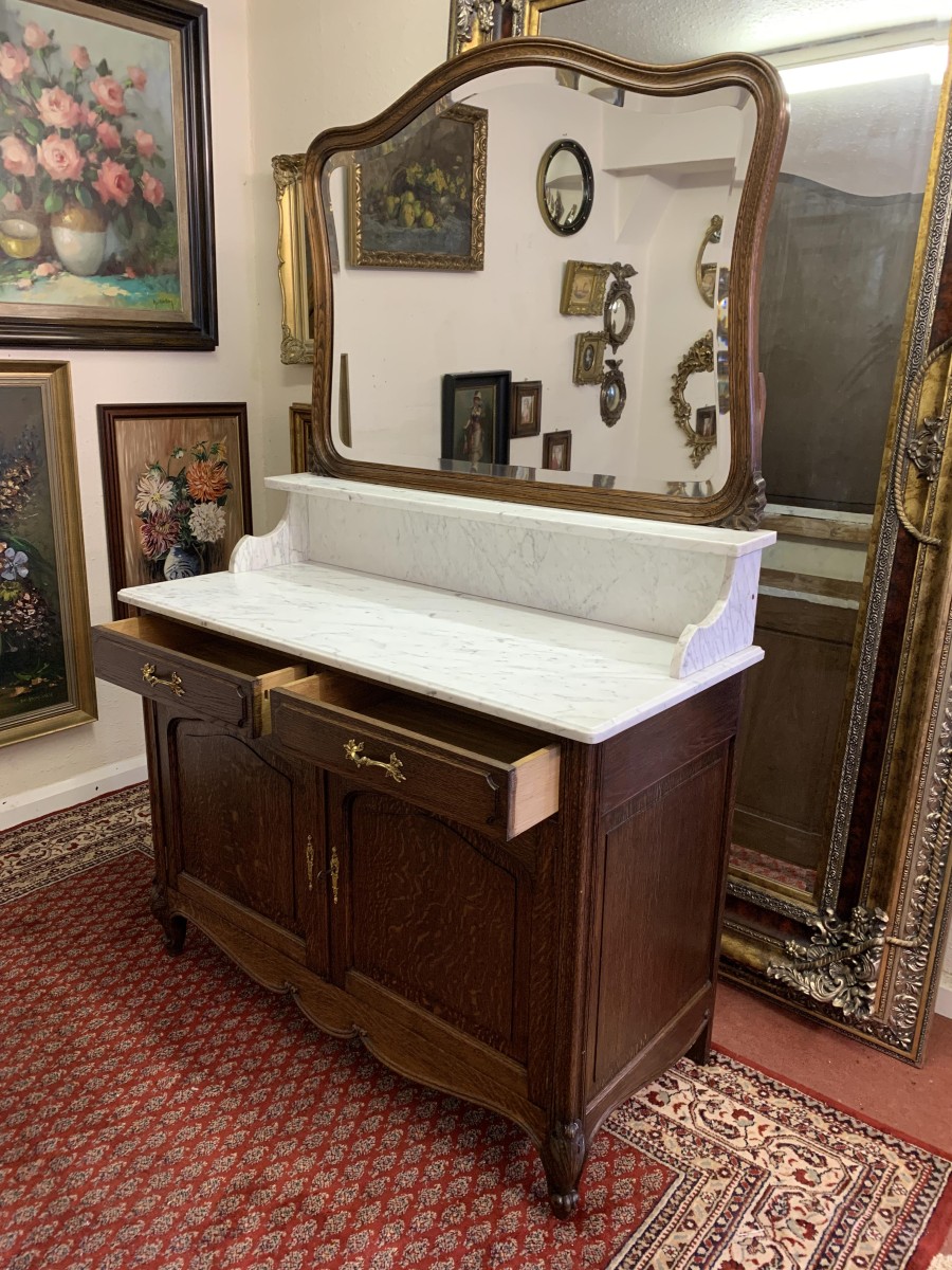 This fabulous French antique marble top commode dates circa 1890. The shaped bevel edged mirror sits on a marble shelf. The base has a marble top with two drawers below, each drawer having an ornate brass handle. Below the drawers are a pair of recessed panelled lockable doors the doors open to reveal a removable shelf. Recessed panelled sides this fabulous cabinet stands on two carved cabriole shaped legs to the front.