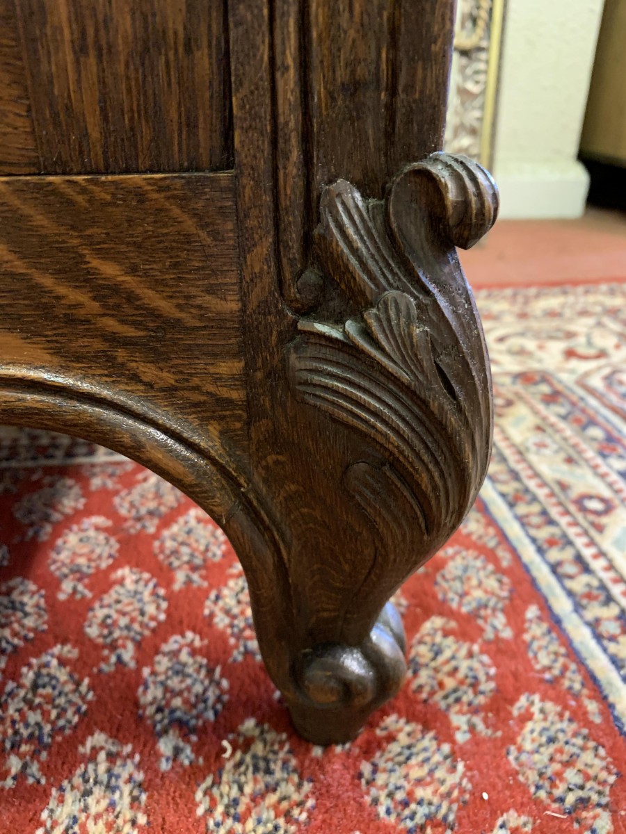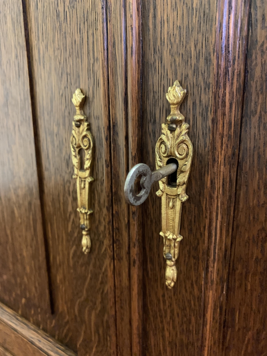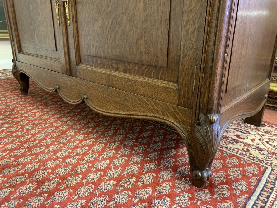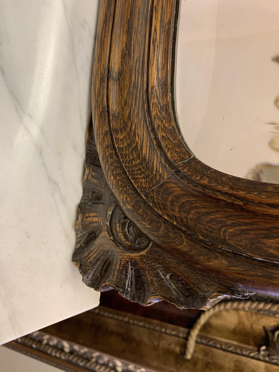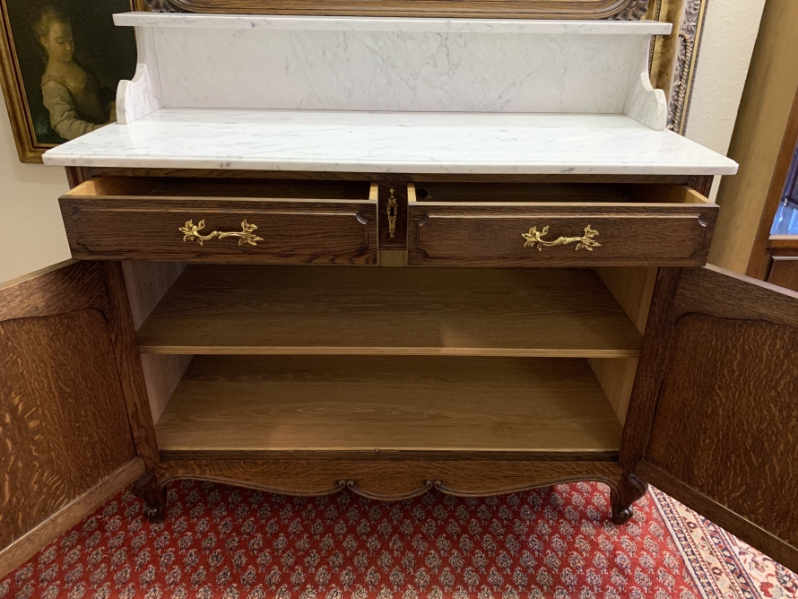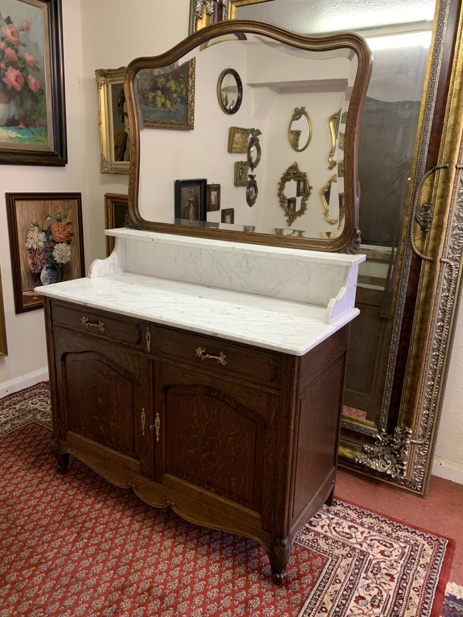 This fabulous French antique marble top commode dates circa 1890. The shaped bevel edged mirror sits on a marble shelf. The base has a marble top with two drawers below, each drawer having an ornate brass handle. Below the drawers are a pair of recessed panelled lockable doors the doors open to reveal a removable shelf. Recessed panelled sides this fabulous cabinet stands on two carved cabriole shaped legs to the front.