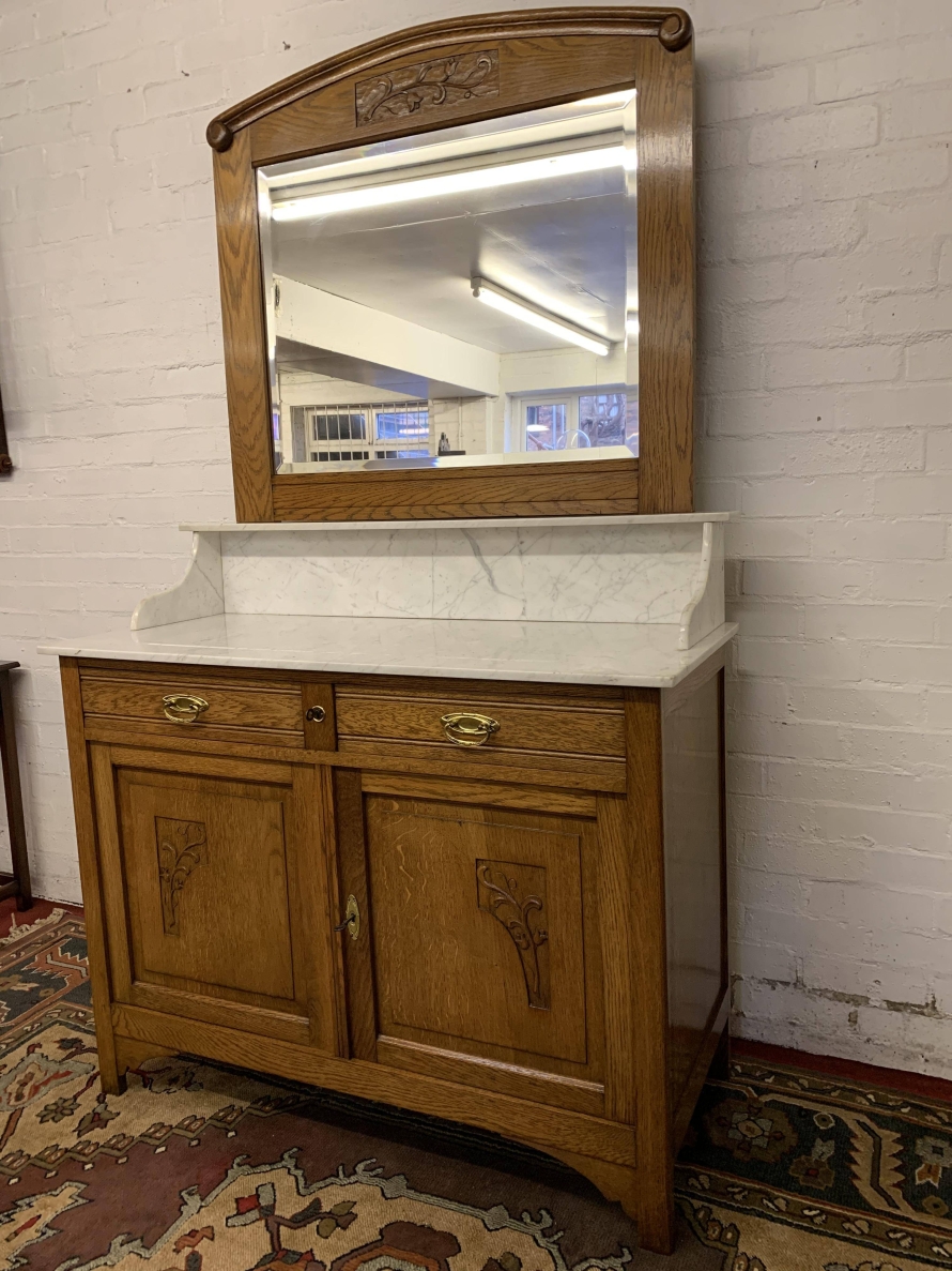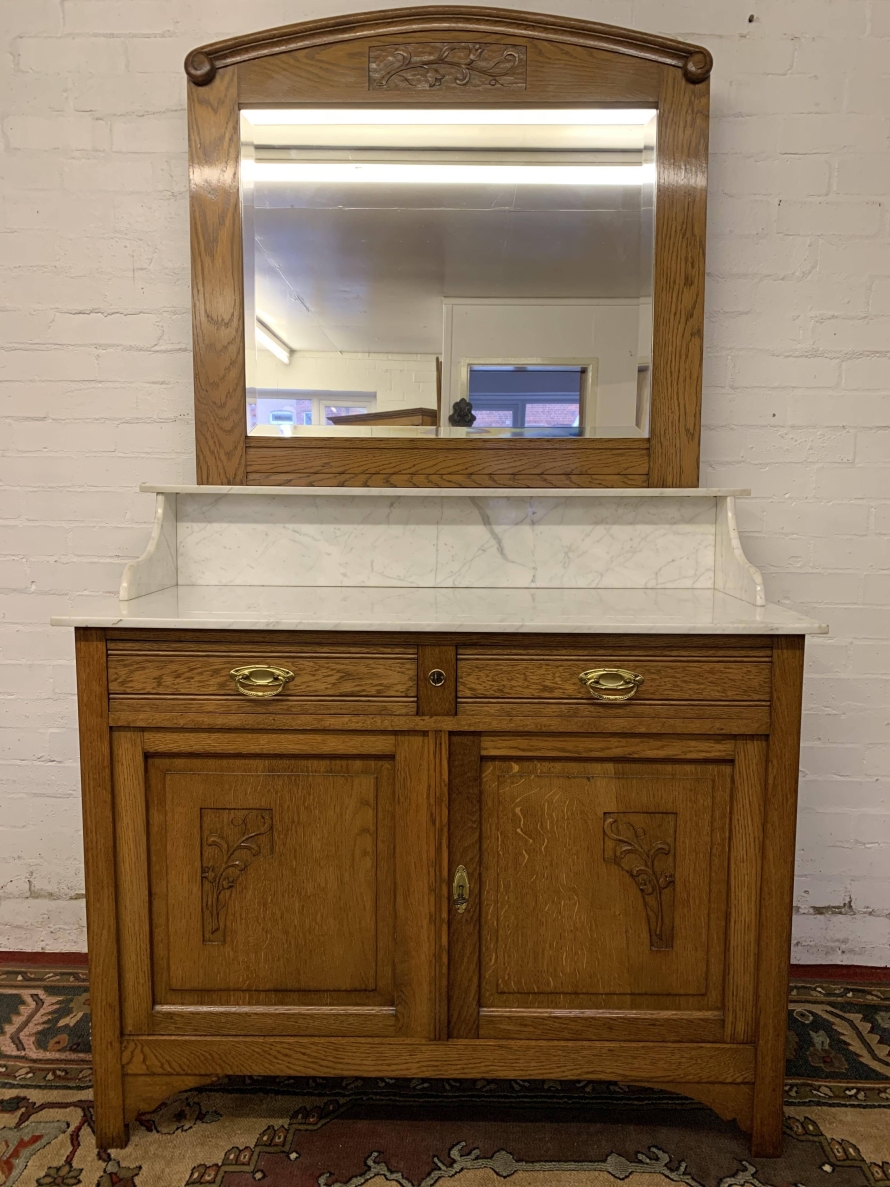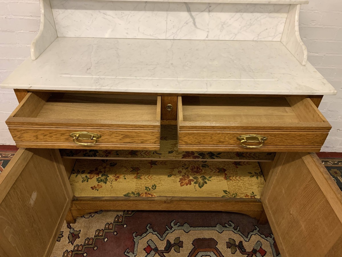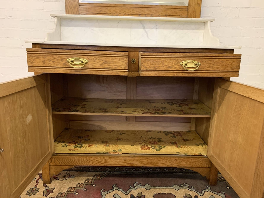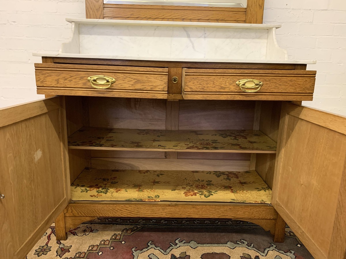 The removable bevelled mirror back has an ornate carving to the top. The mirror sits on a marble shelf. The marble top of the washstand sits above a pair of drawers, each drawer having brass handle, below are a pair of lockable recessed panelled carved cupboard doors, the doors open to reveal a shelf and offer ample storage. A fine example of French furniture in excellent condition