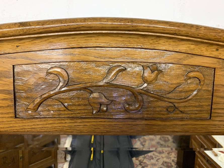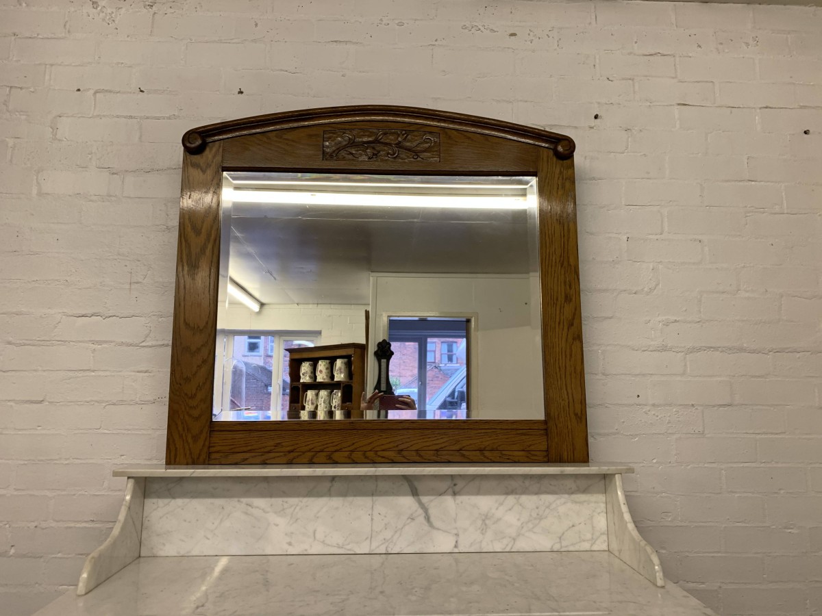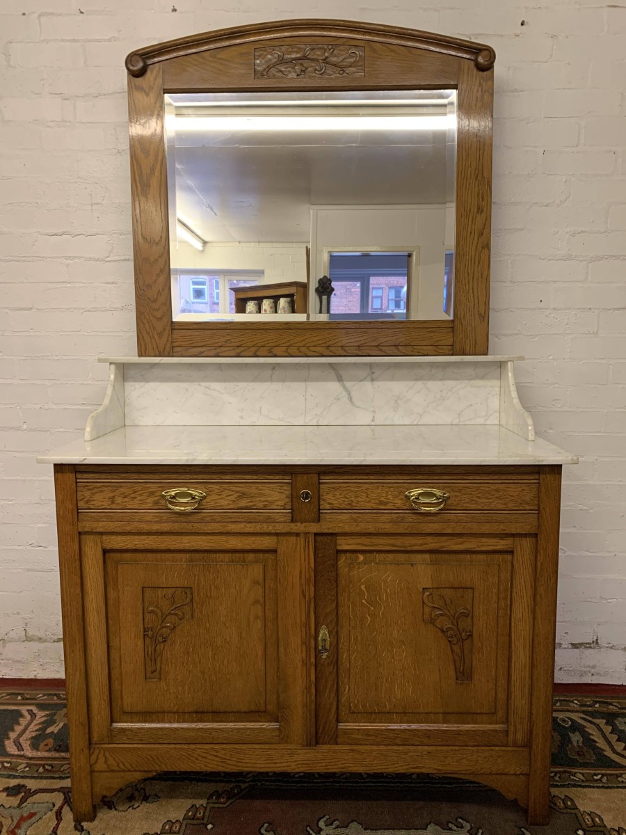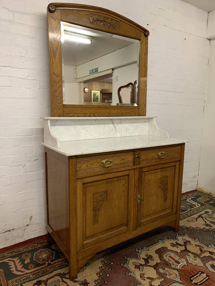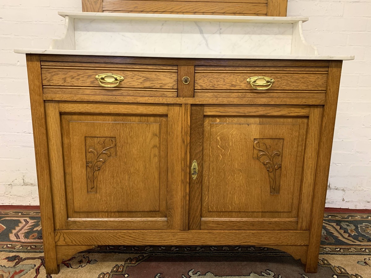 The removable bevelled mirror back has an ornate carving to the top. The mirror sits on a marble shelf. The marble top of the washstand sits above a pair of drawers, each drawer having brass handle, below are a pair of lockable recessed panelled carved cupboard doors, the doors open to reveal a shelf and offer ample storage. A fine example of French furniture in excellent condition