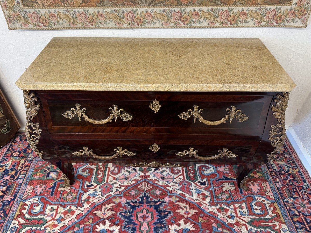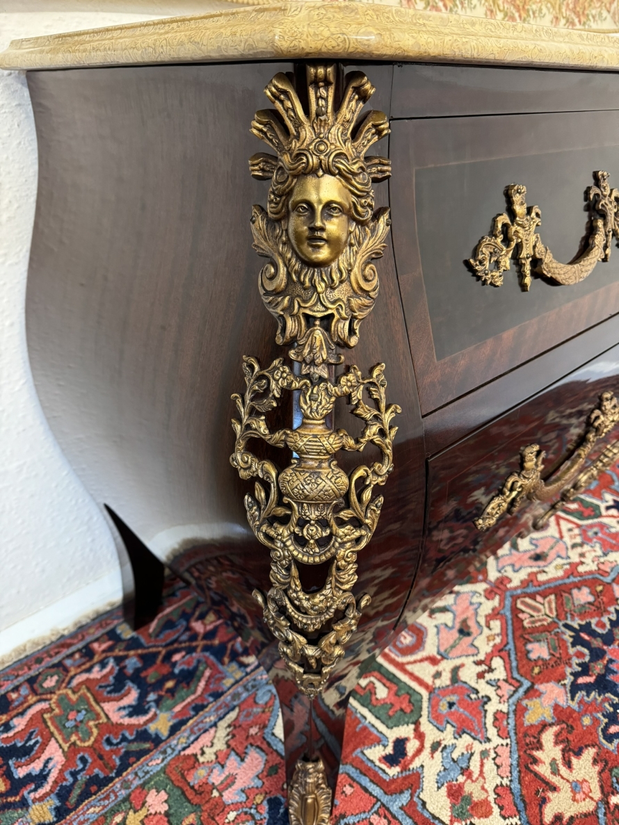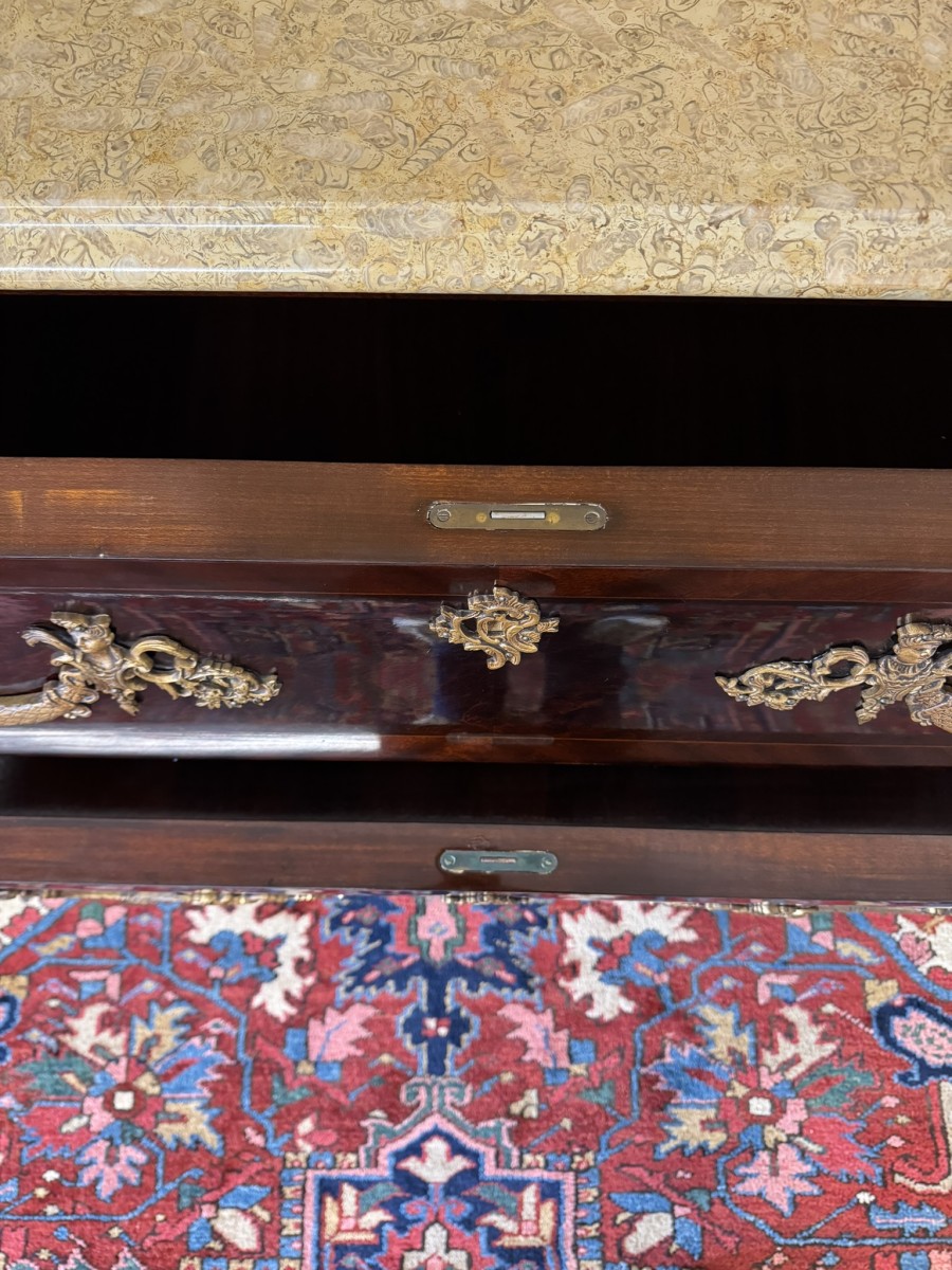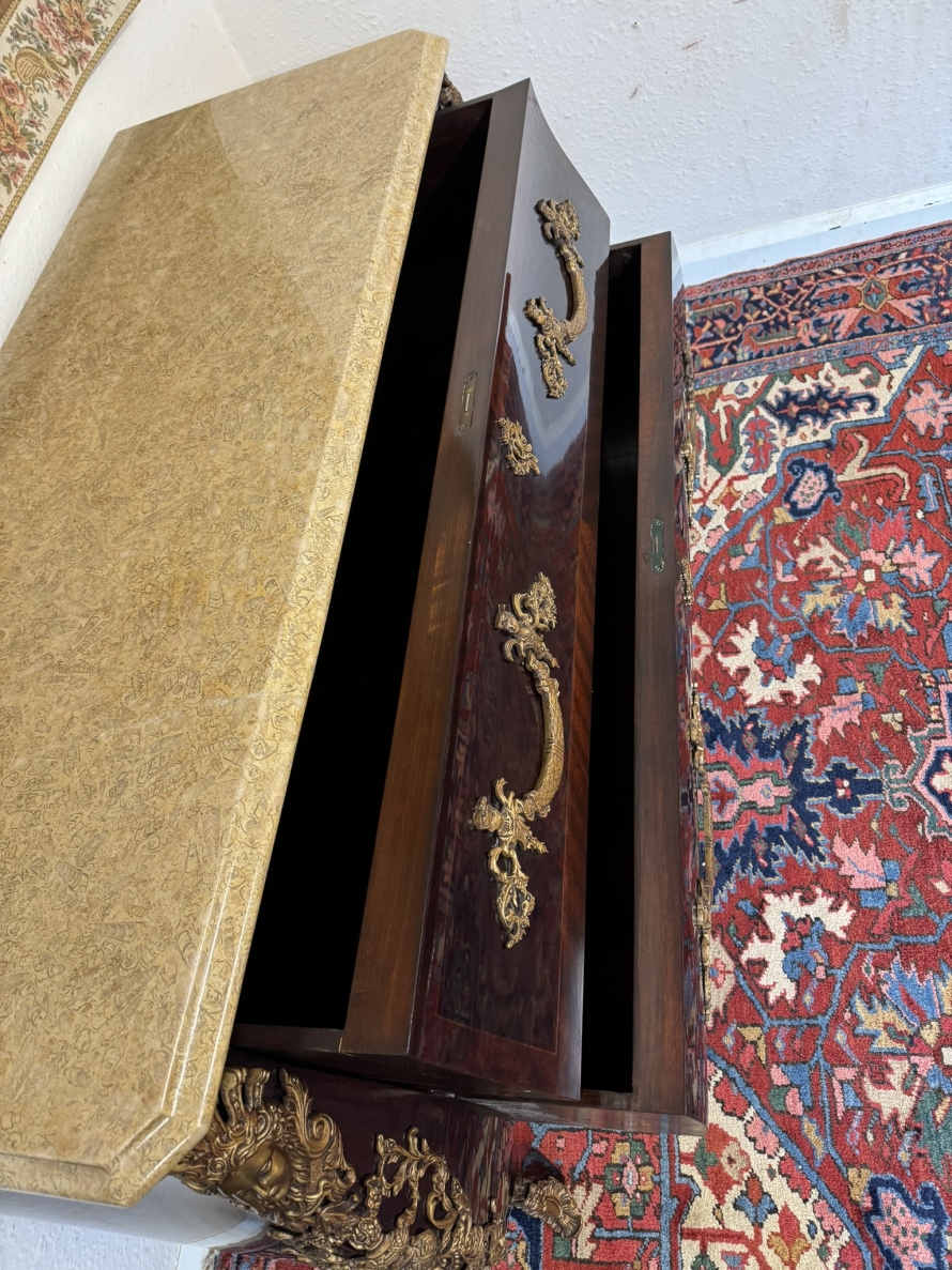 The marble top sits above a pair of lockable shaped drawers, each drawer having a pair of ornate ormolu handles. Shaped sides. Front legs having fabulous sunburst ormolu mounts with ormolu feet.