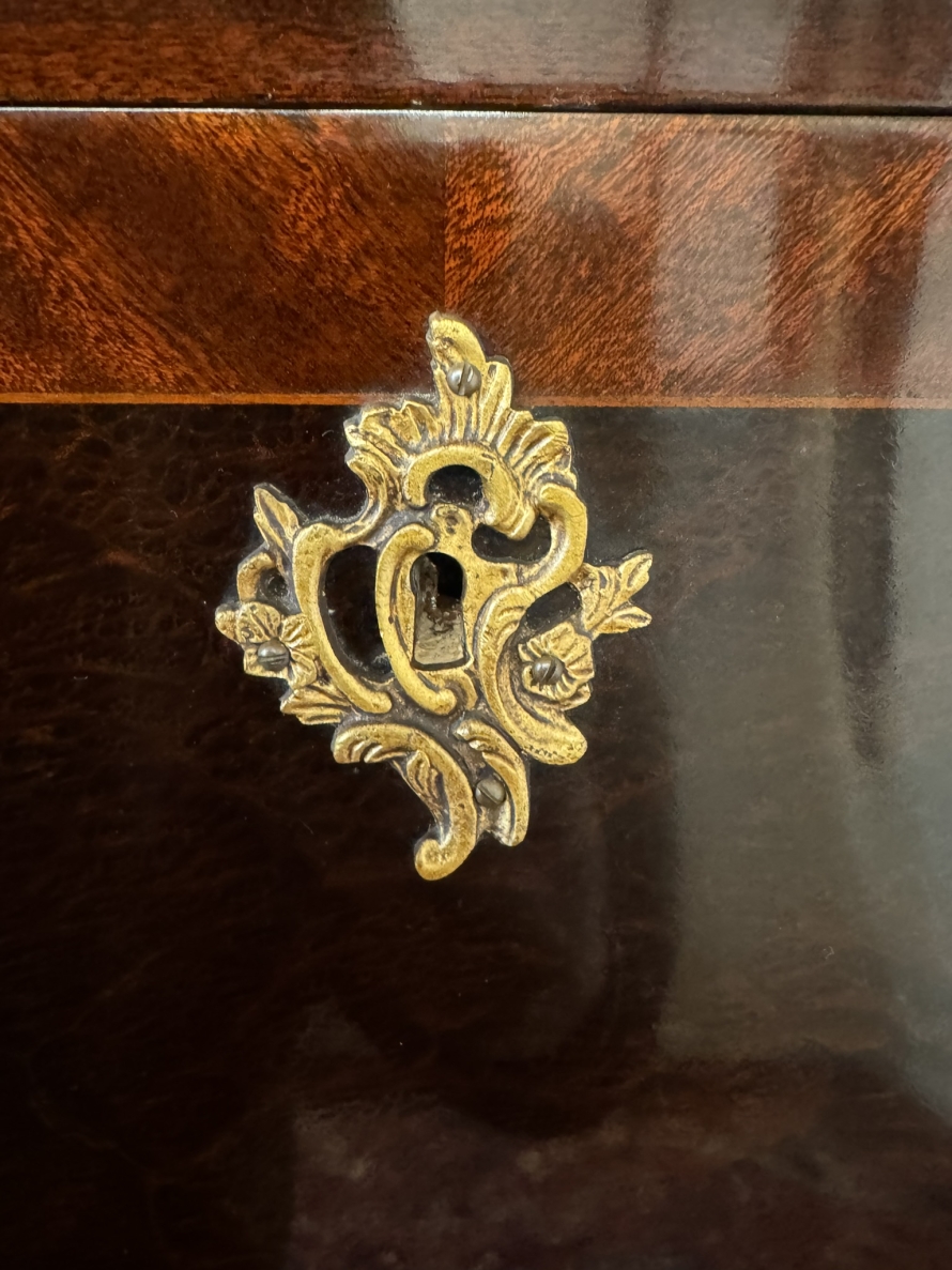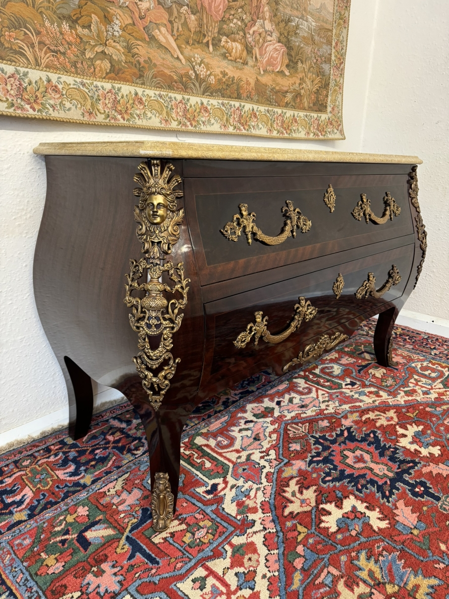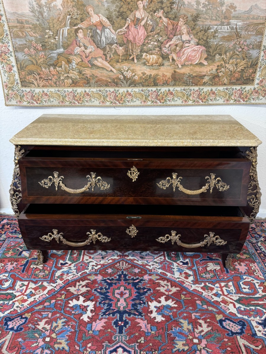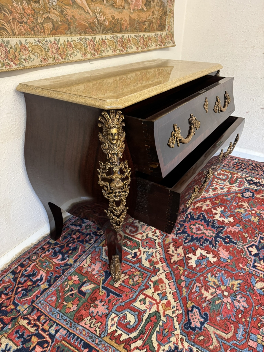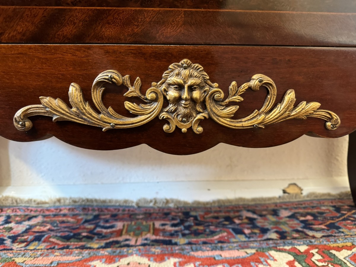 The marble top sits above a pair of lockable shaped drawers, each drawer having a pair of ornate ormolu handles. Shaped sides. Front legs having fabulous sunburst ormolu mounts with ormolu feet.