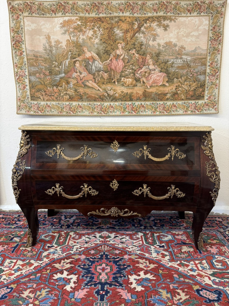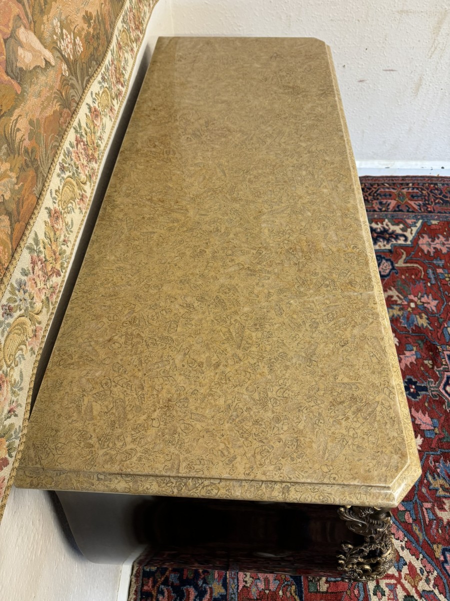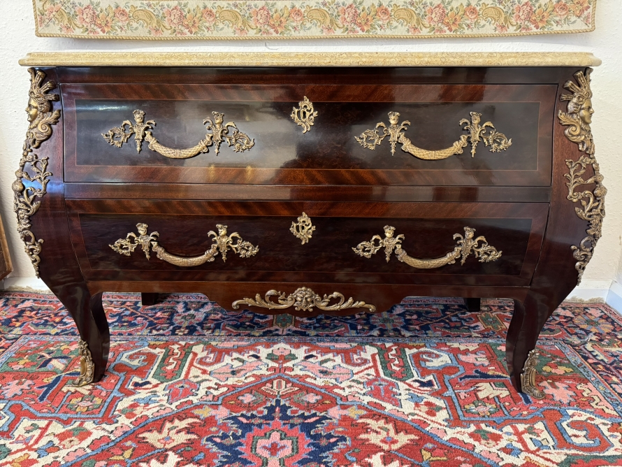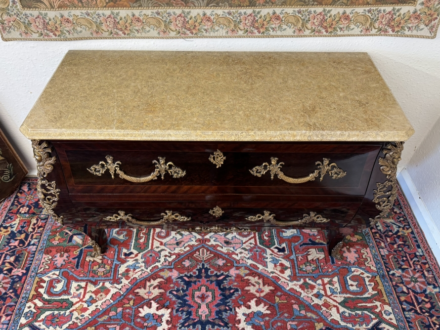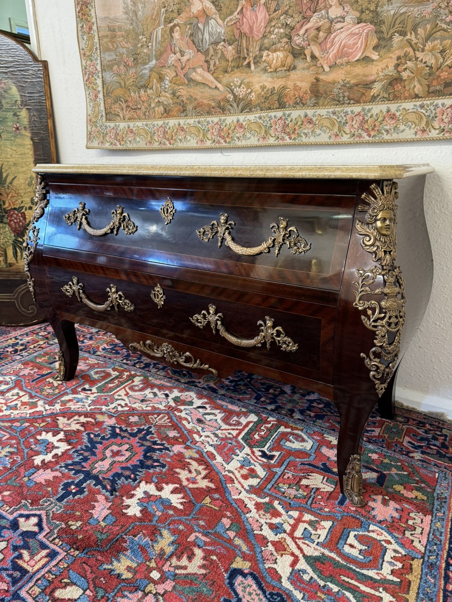 The marble top sits above a pair of lockable shaped drawers, each drawer having a pair of ornate ormolu handles. Shaped sides. Front legs having fabulous sunburst ormolu mounts with ormolu feet.