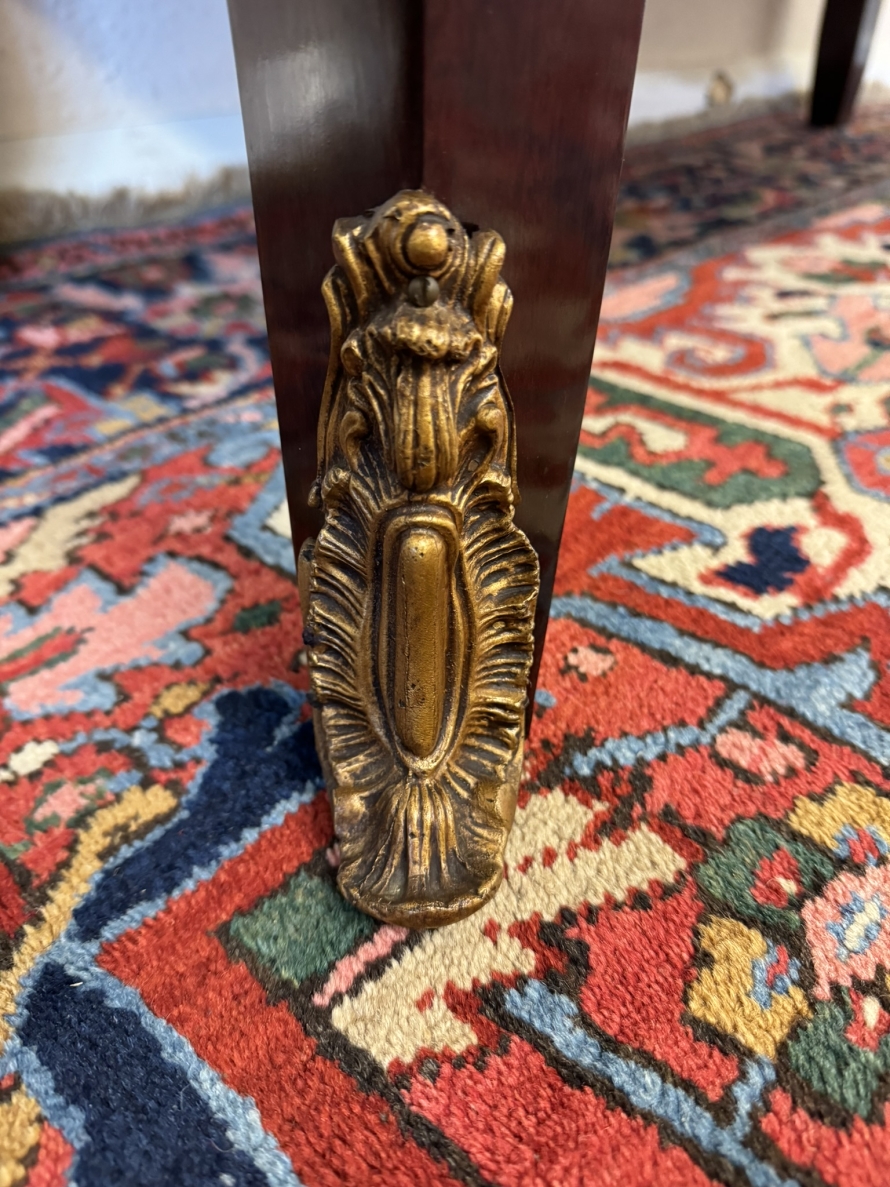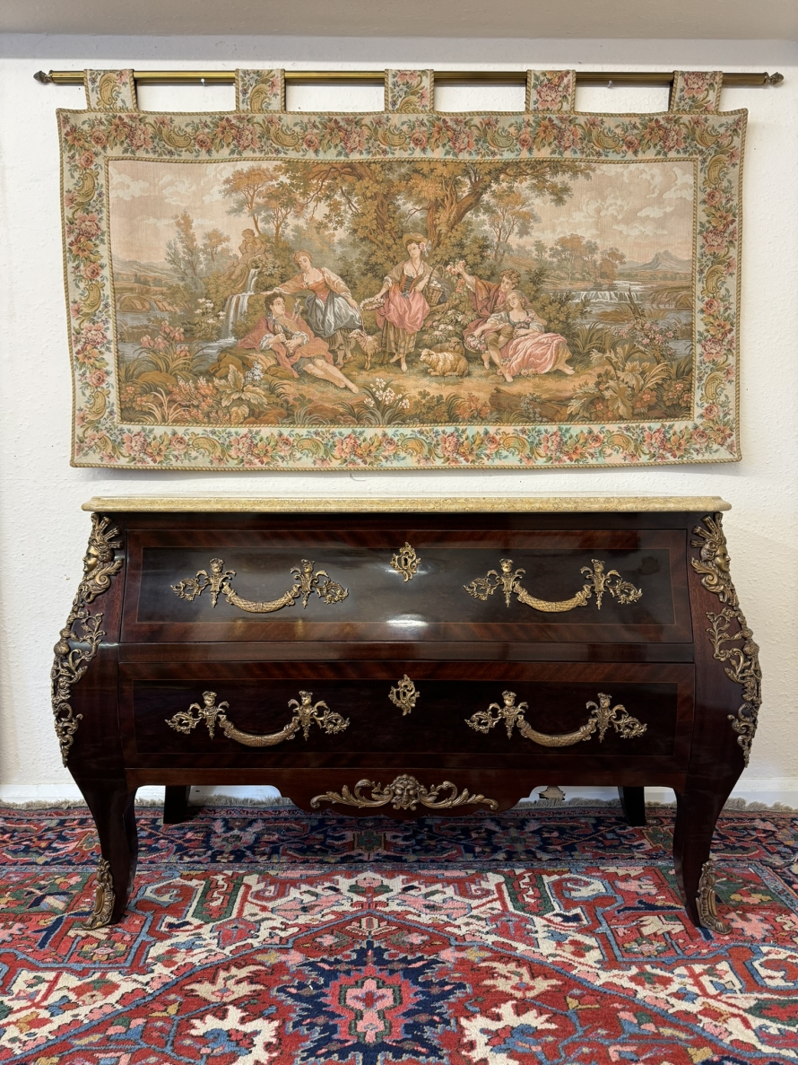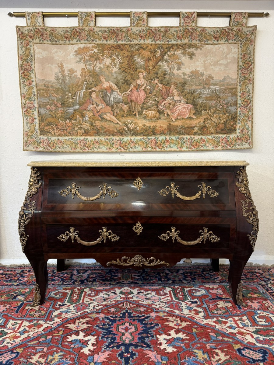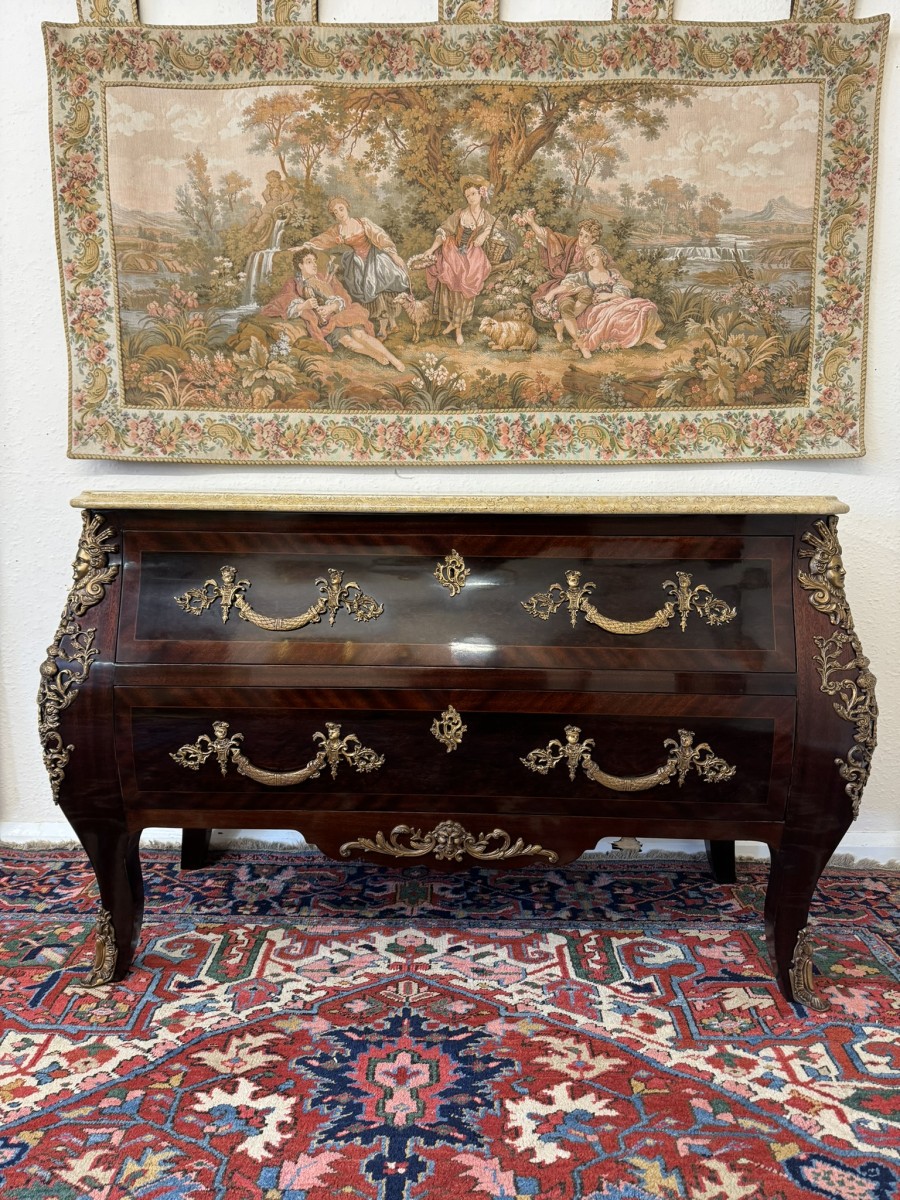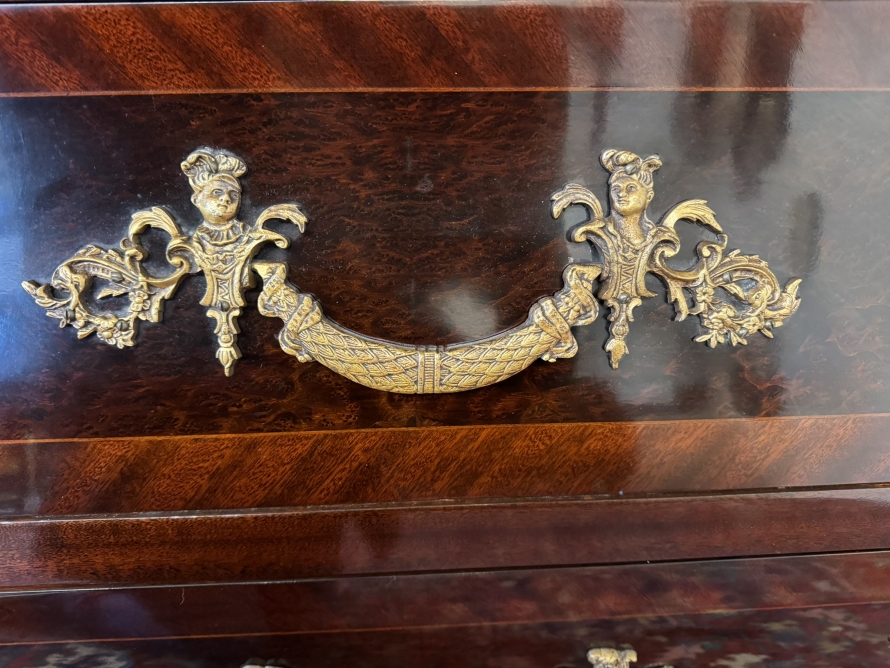 The marble top sits above a pair of lockable shaped drawers, each drawer having a pair of ornate ormolu handles. Shaped sides. Front legs having fabulous sunburst ormolu mounts with ormolu feet.