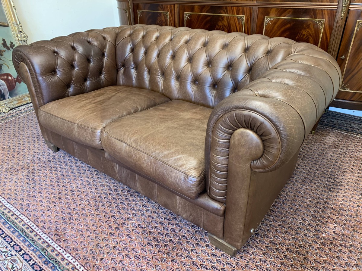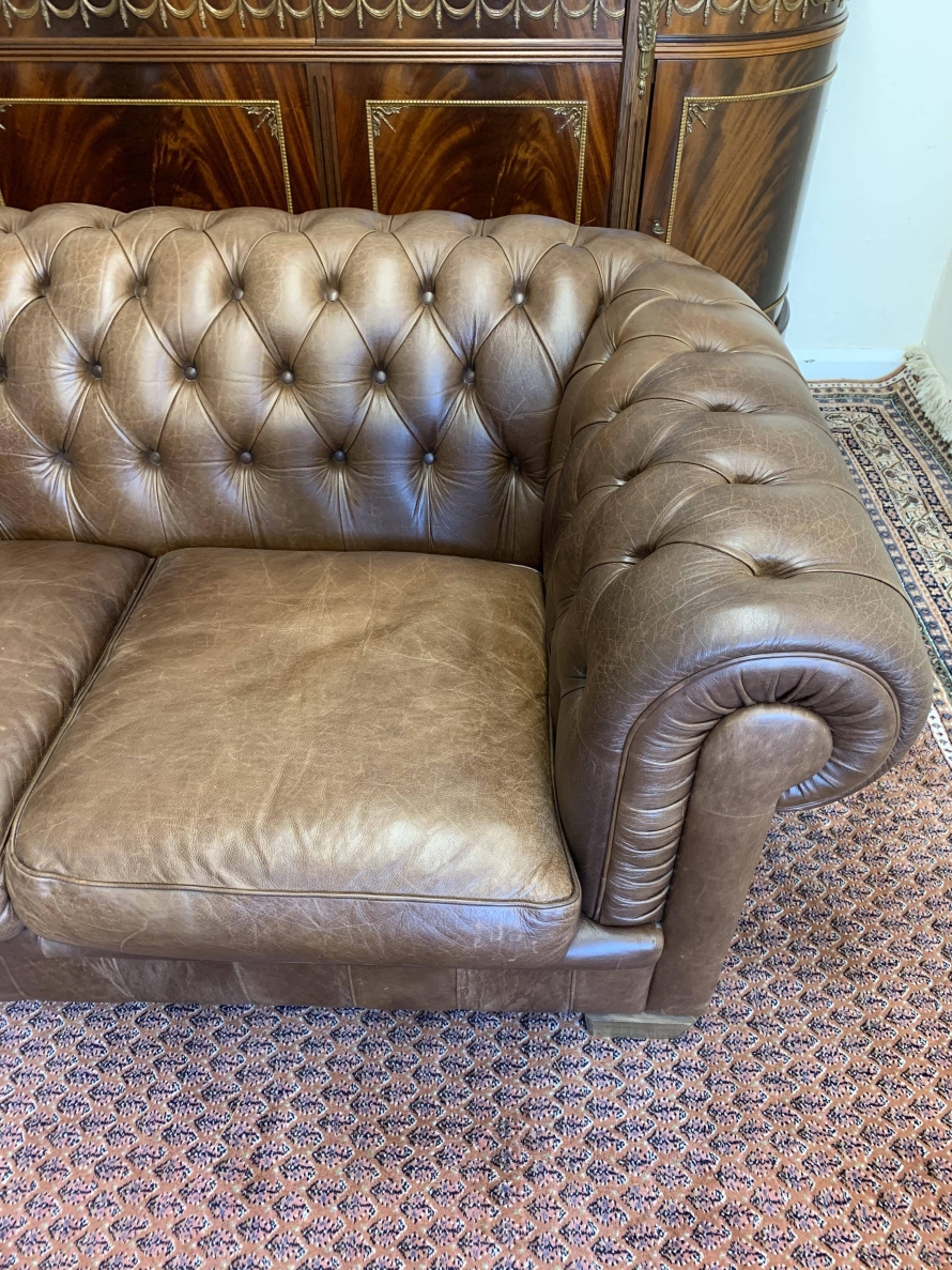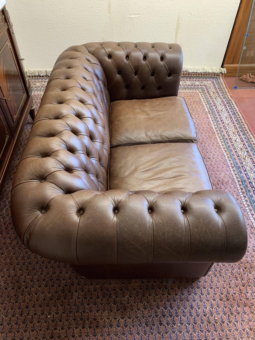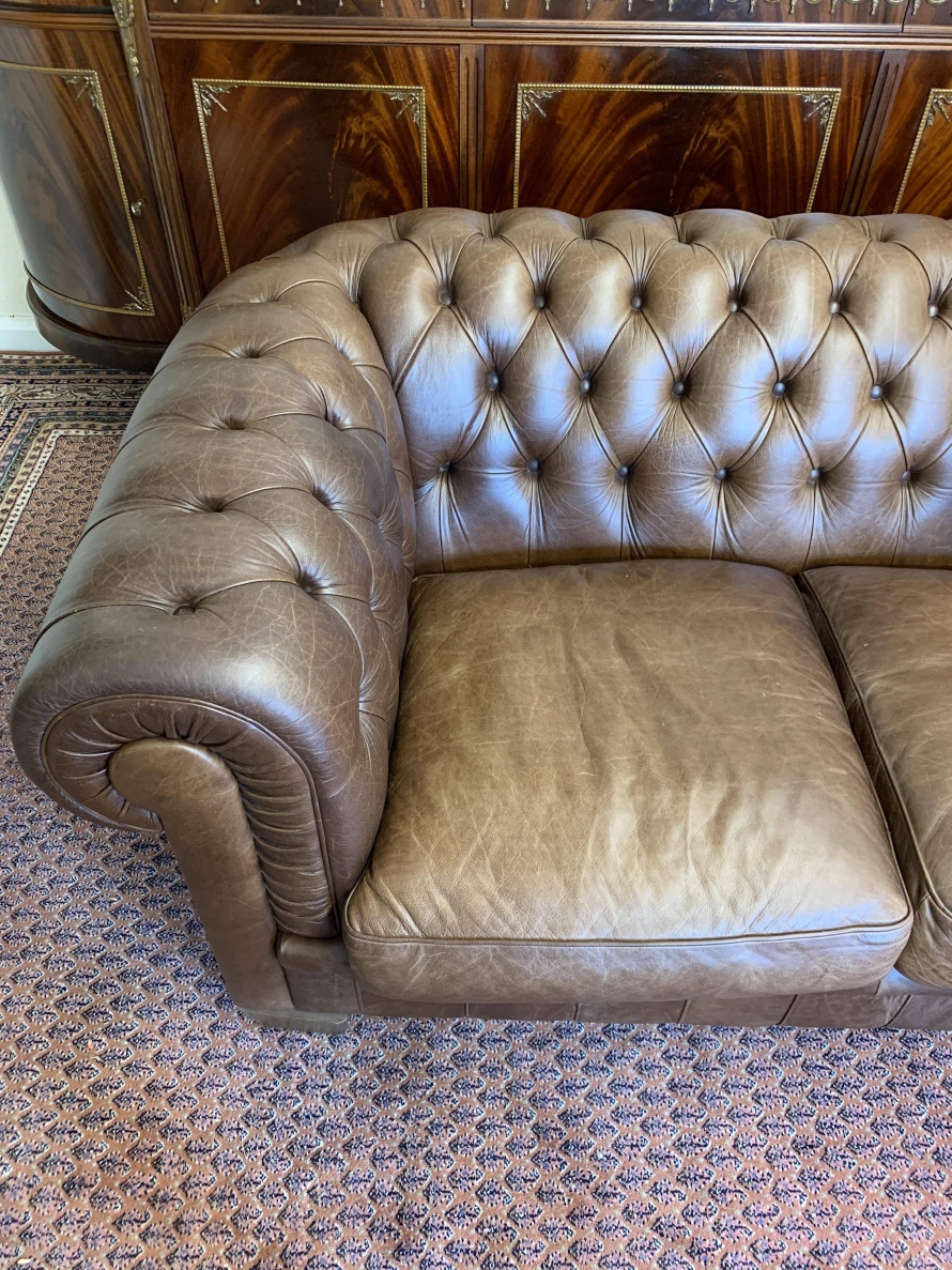 This fine two seater brown leather buttoned Chesterfield settee is in excellent condition. Buttoned back and arms, two removable cushions this top quality leather Chesterfield was retailed by Natuzzi.