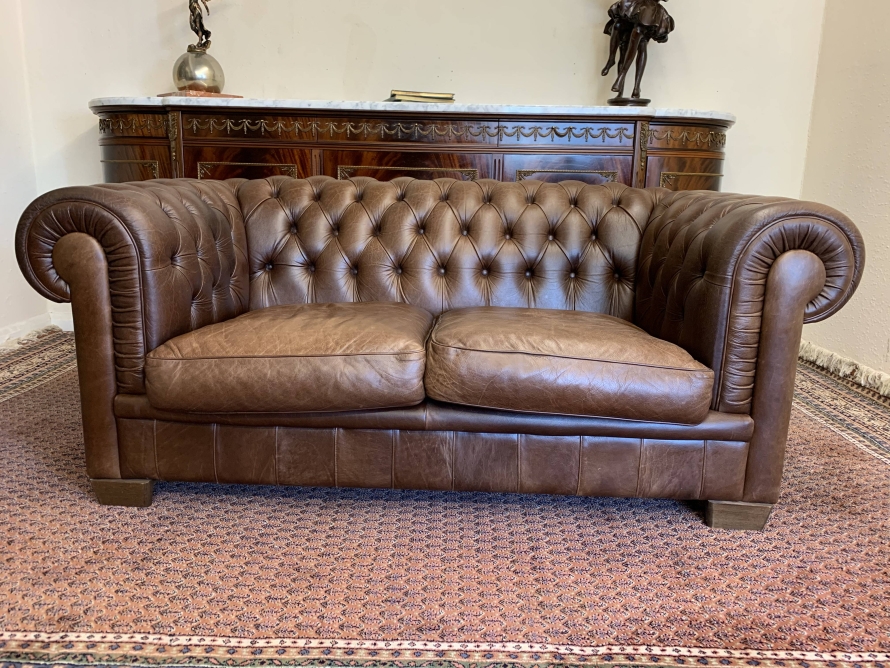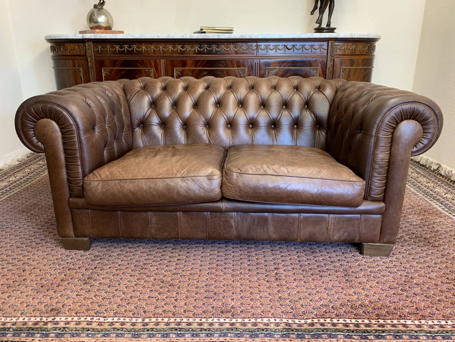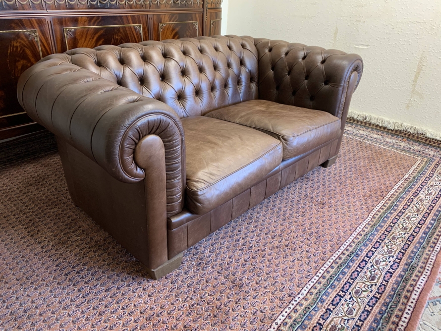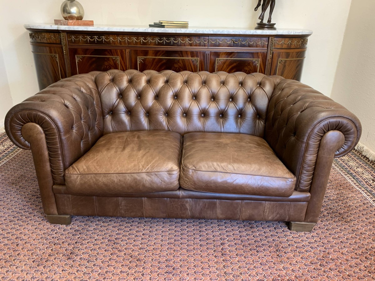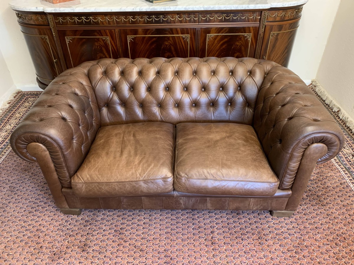 This fine two seater brown leather buttoned Chesterfield settee is in excellent condition. Buttoned back and arms, two removable cushions this top quality leather Chesterfield was retailed by Natuzzi.