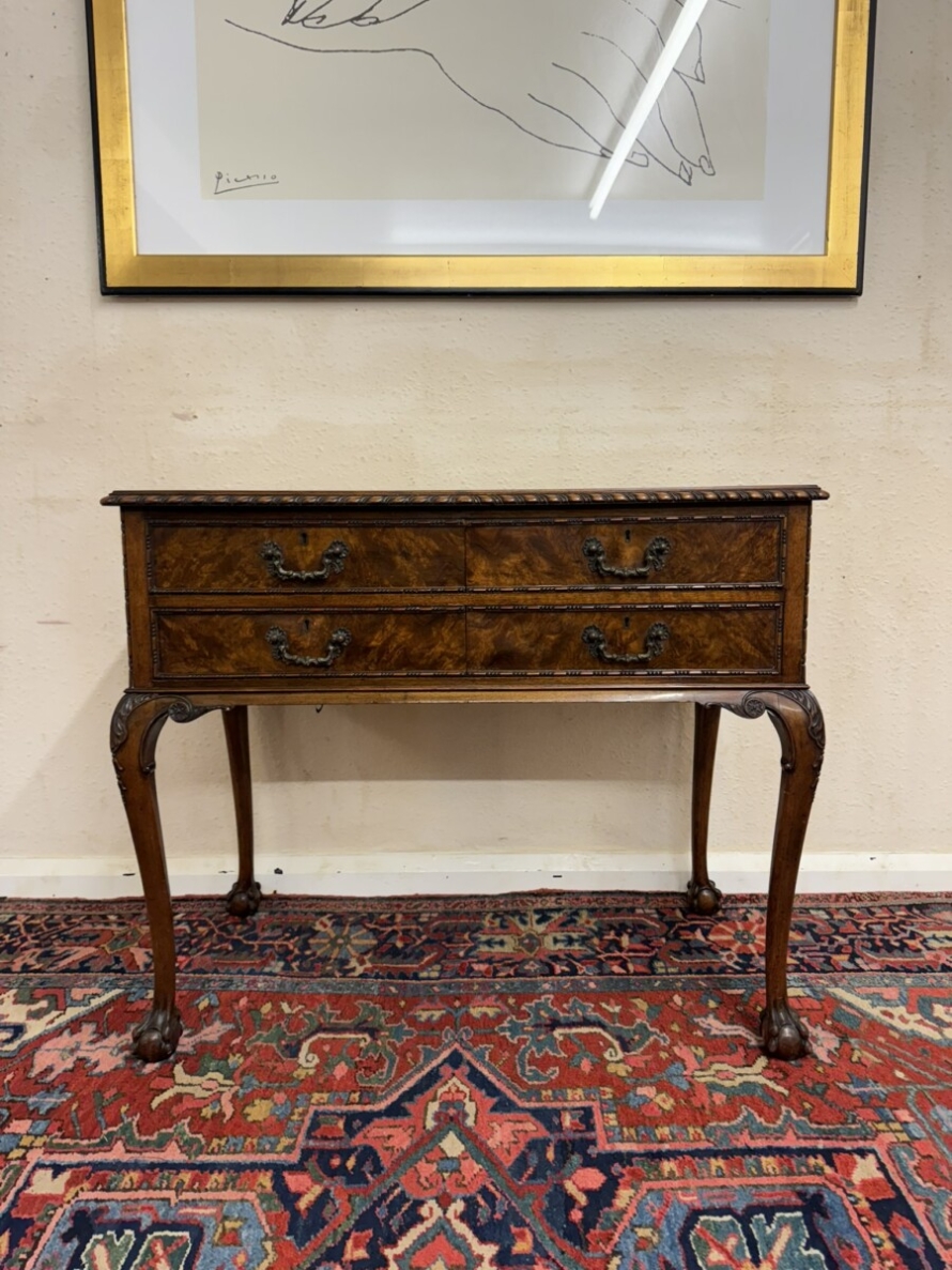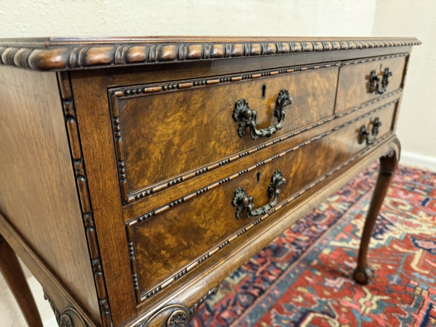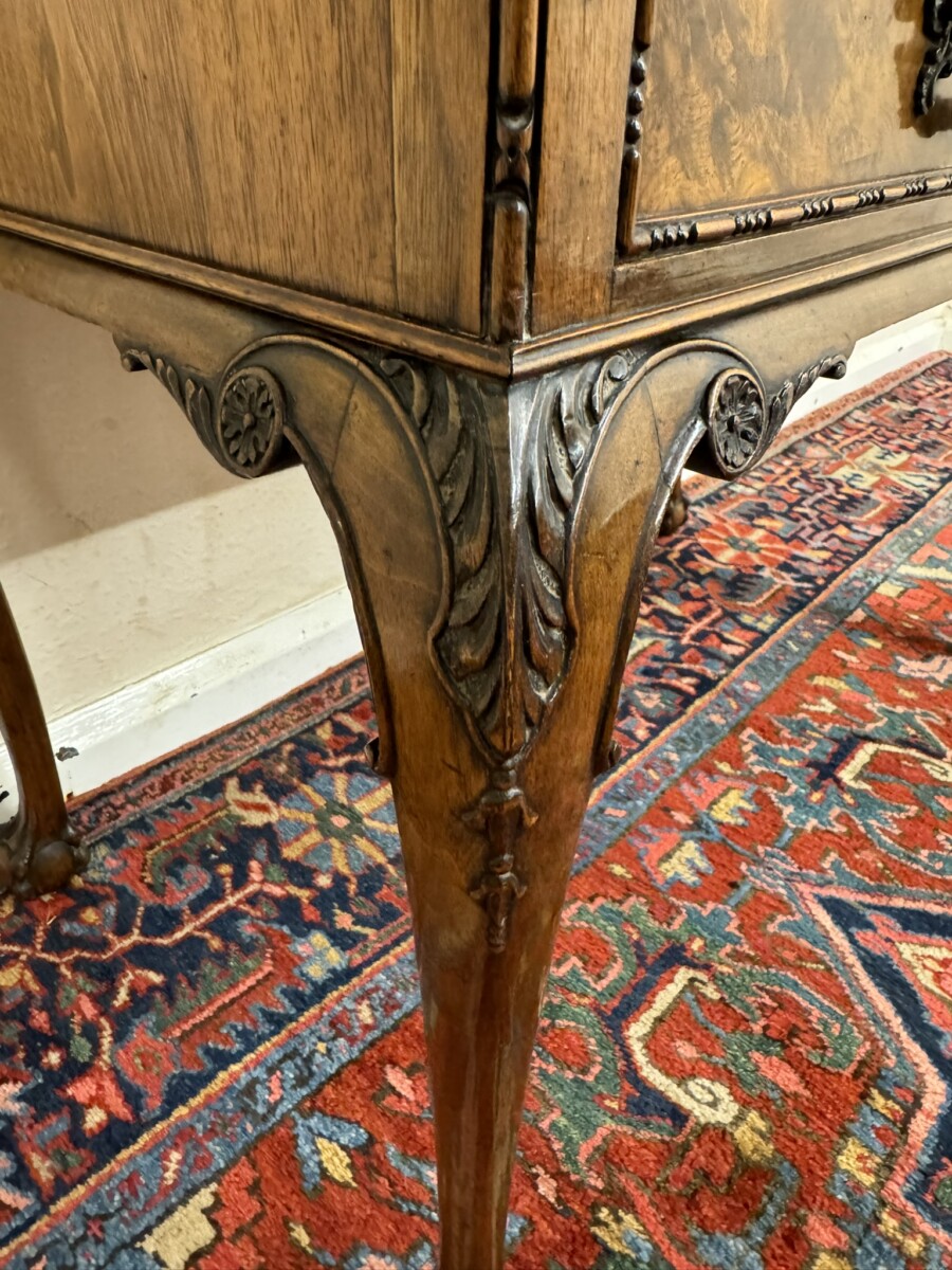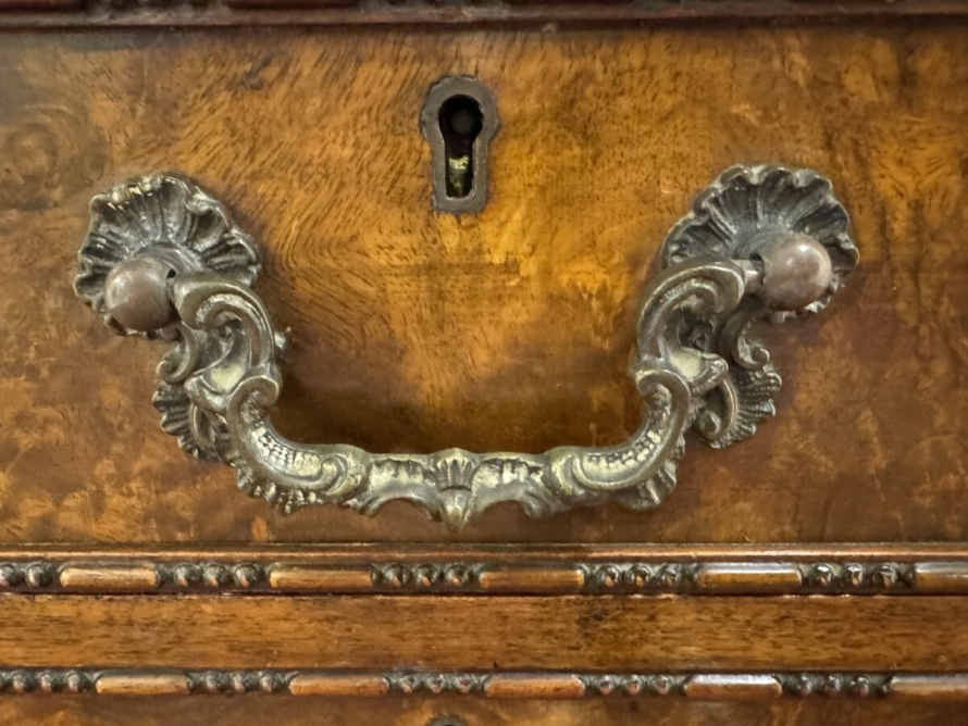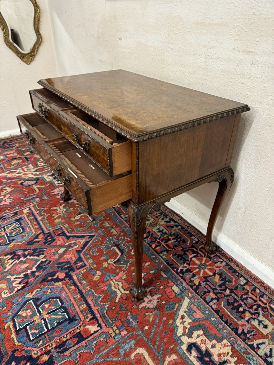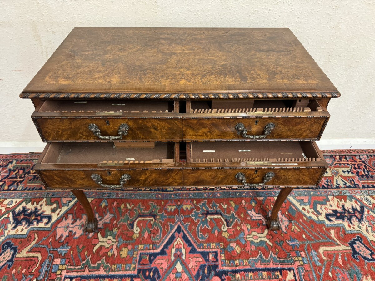 The chest dates circa 1920 and is of the highest quality. The burr walnut patina is striking throughout. The shaped oversailing top has a carved edge, below are four cutlery drawers, each drawer having carved decoration and an ornate brass drop handle. Four elegant cabriole shaped legs have fine carvings to the top and stand on claw and ball feet.