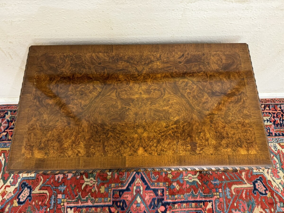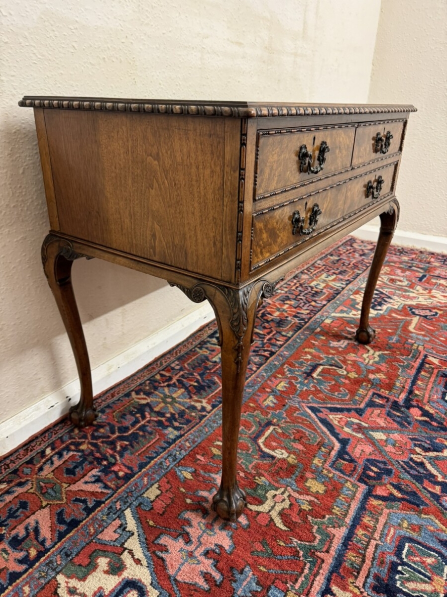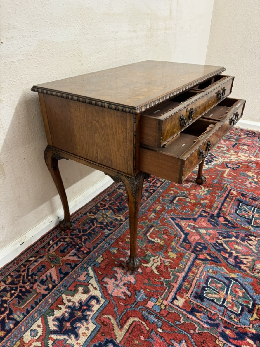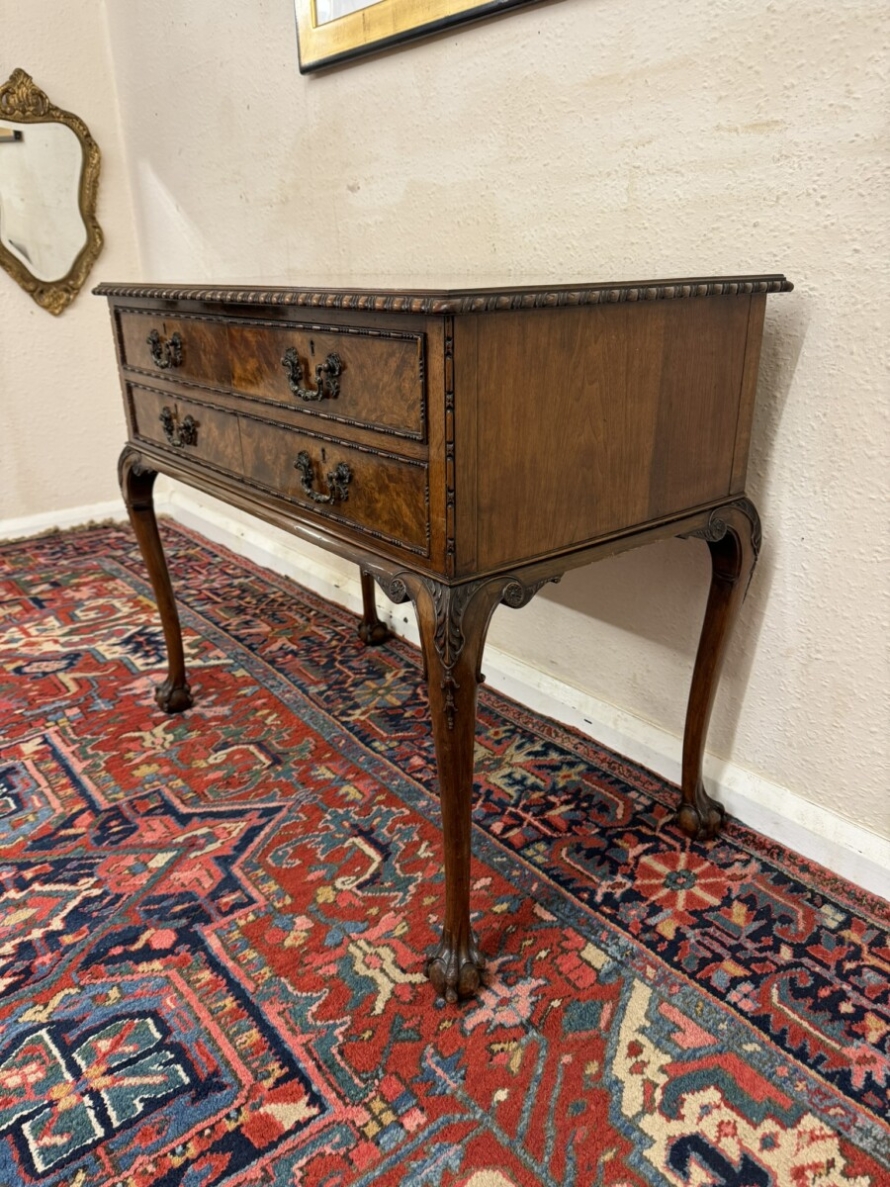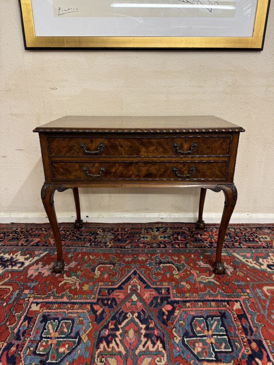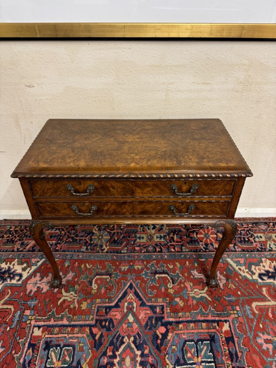 The chest dates circa 1920 and is of the highest quality. The burr walnut patina is striking throughout. The shaped oversailing top has a carved edge, below are four cutlery drawers, each drawer having carved decoration and an ornate brass drop handle. Four elegant cabriole shaped legs have fine carvings to the top and stand on claw and ball feet.