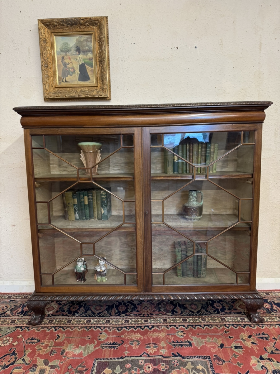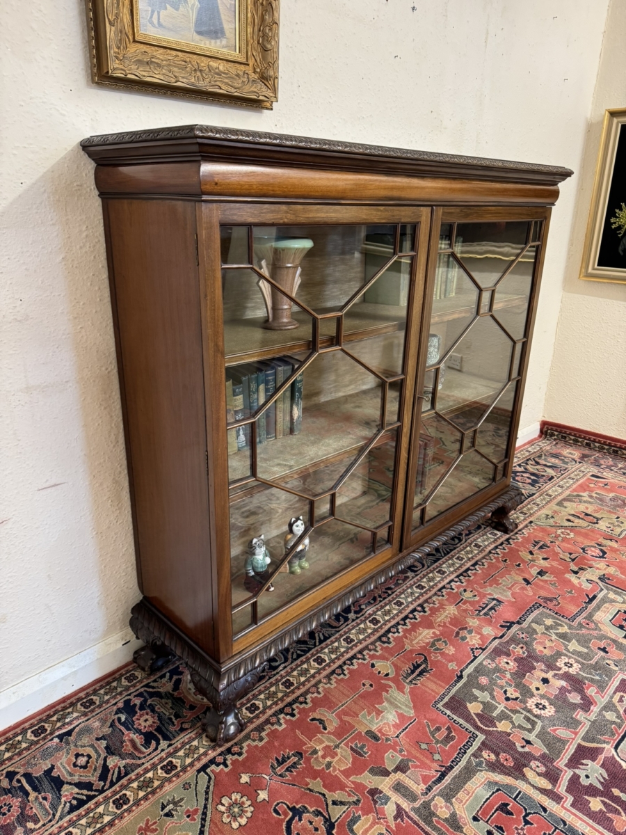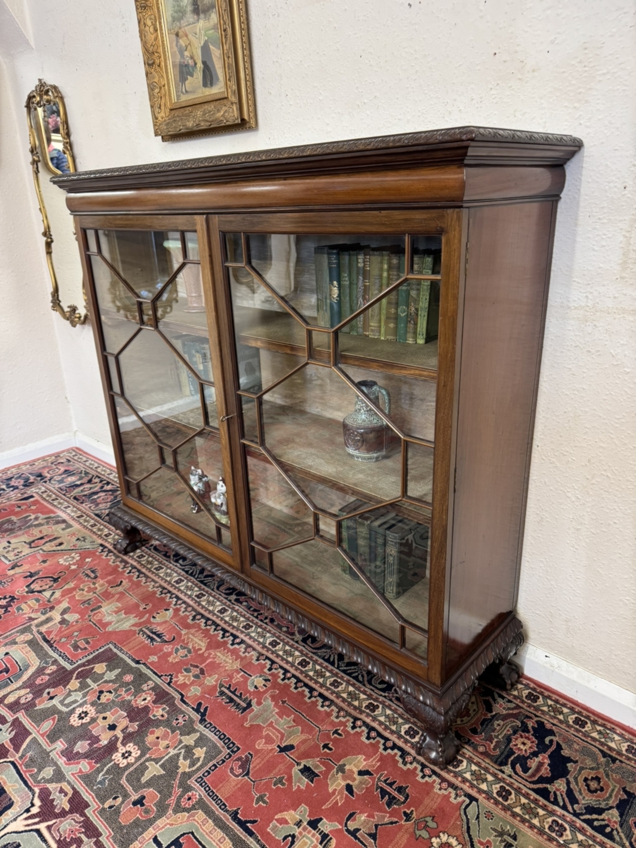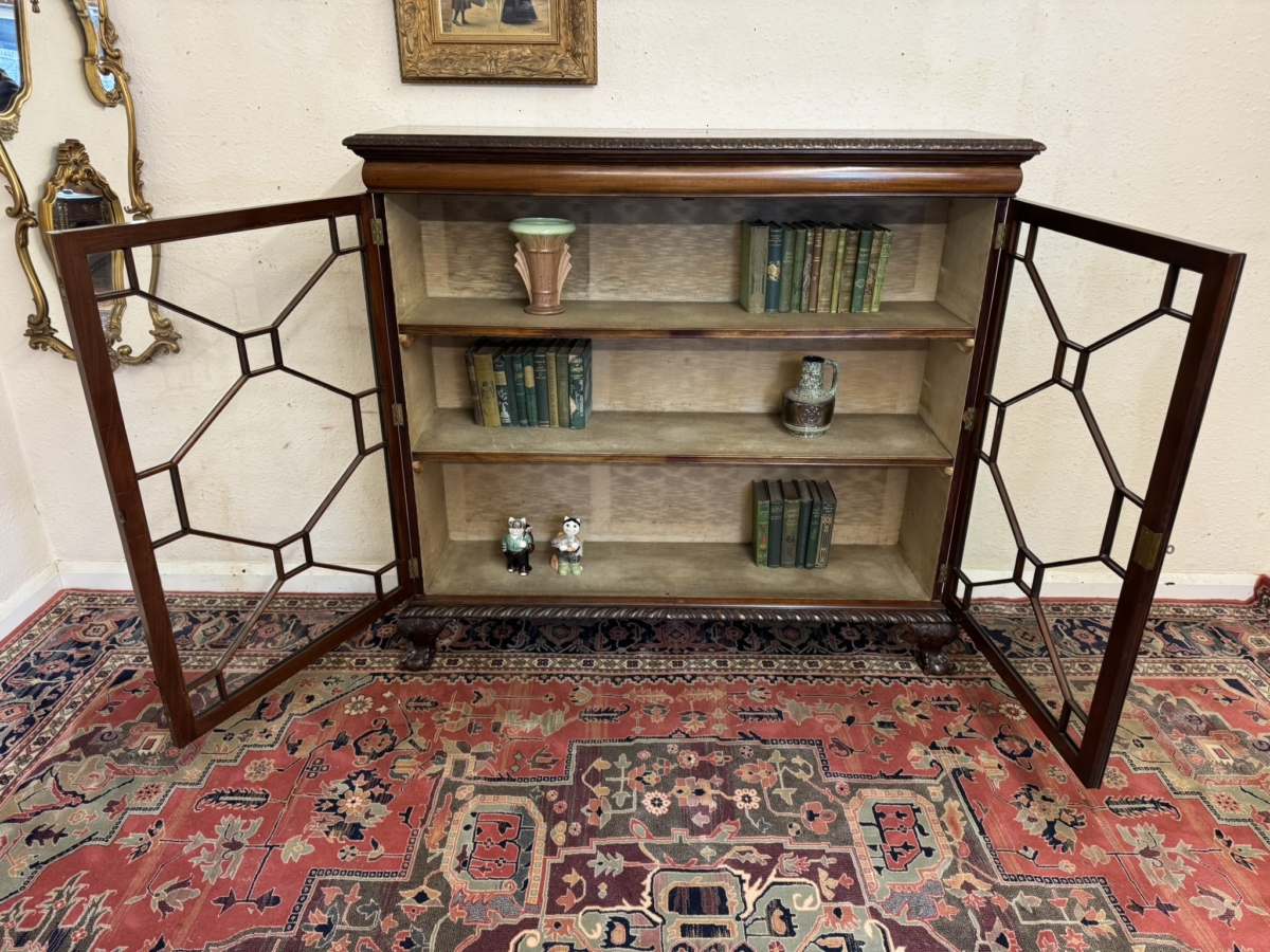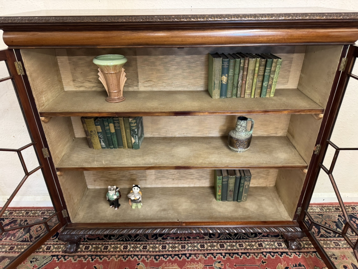 This fine bookcase dates circa 1910 and oozes style and quality. The over sailing top has a carved edge, below are a pair of lockable glazed doors, each of the doors have wood barring decoration. The doors open to reveal two removable shelves ornate carved skirt and stand on four claw and ball feet.