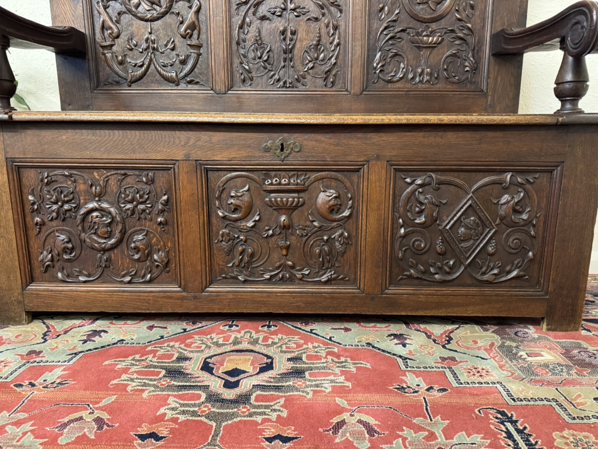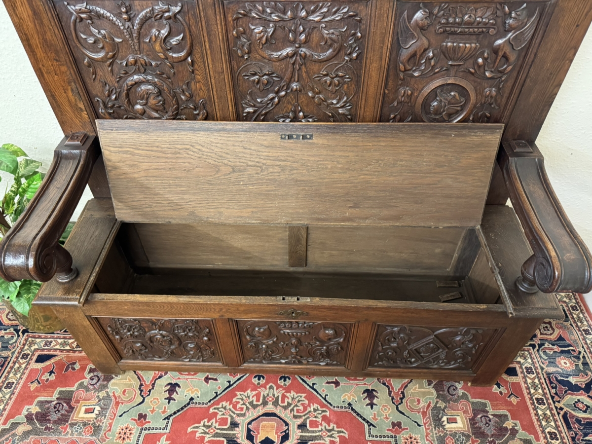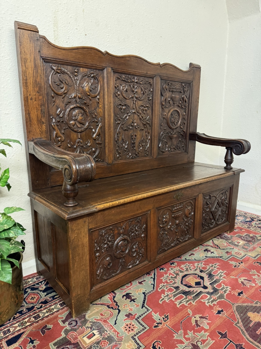This exceptional quality bench dates circa 1870 and is in excellent condition. Shaped top sits above three profusely carved back panels. It has a pair of curved arms, lift up seat and offers ample storage, recessed panelled sides and having three carved panels to the front. This fine bench sits on traditional block feet.