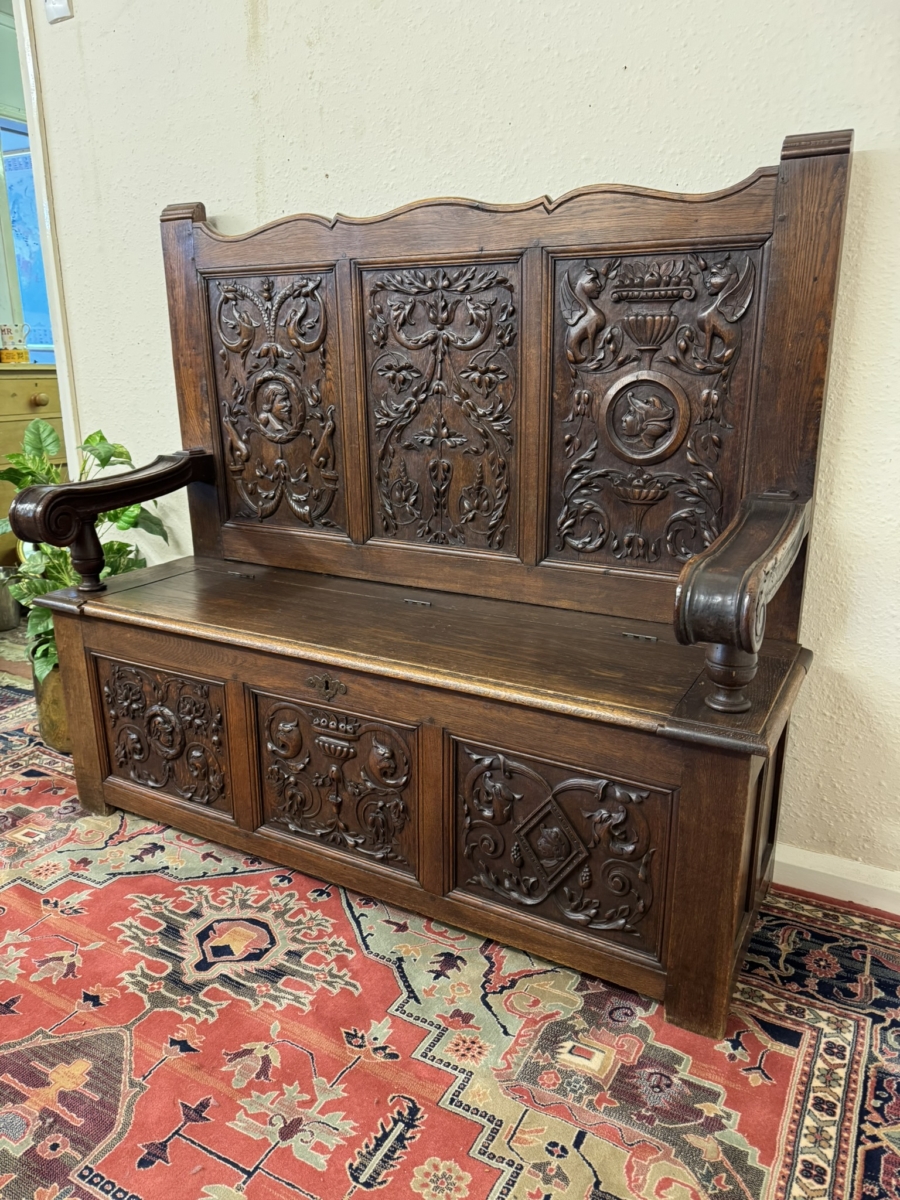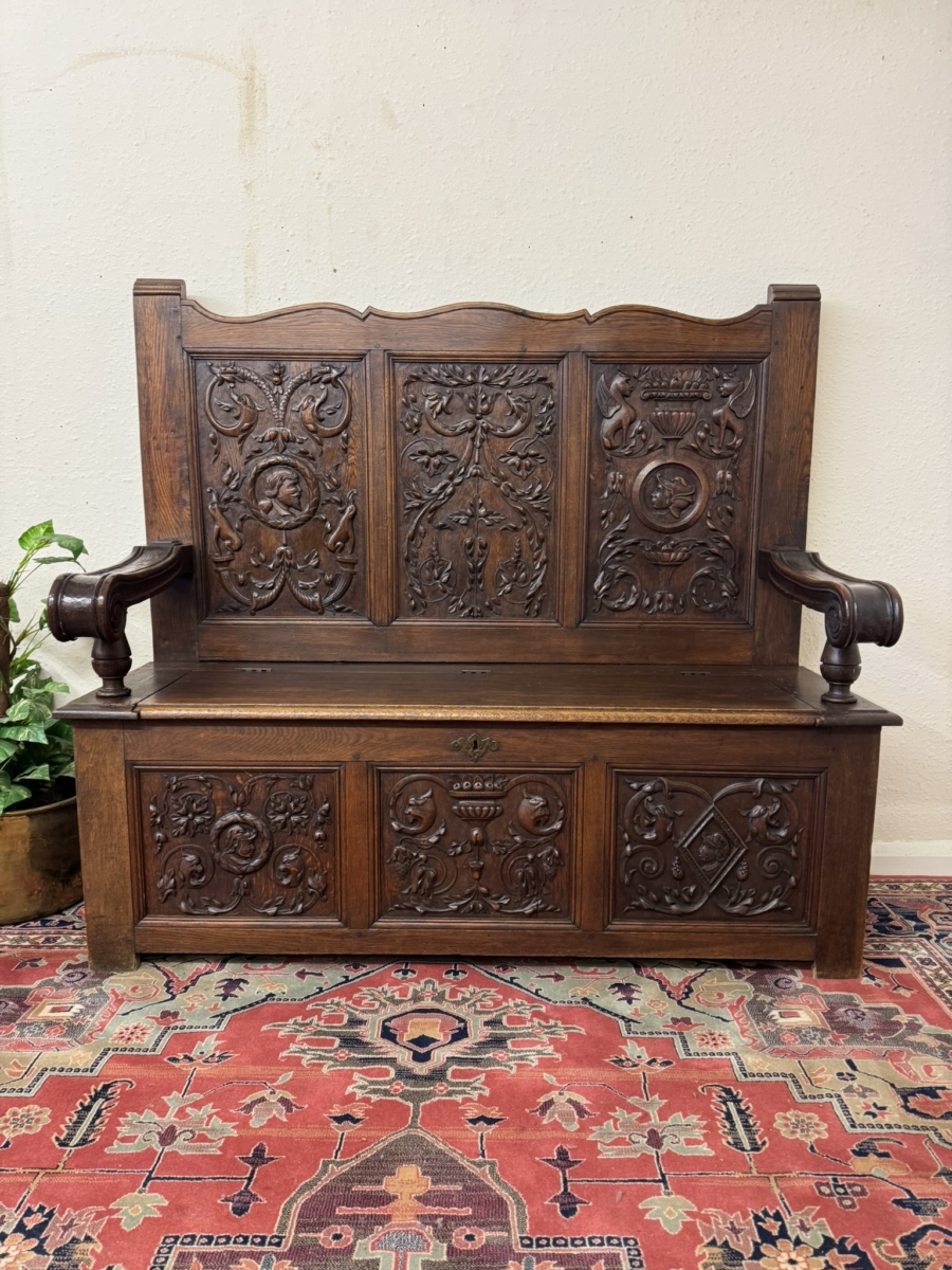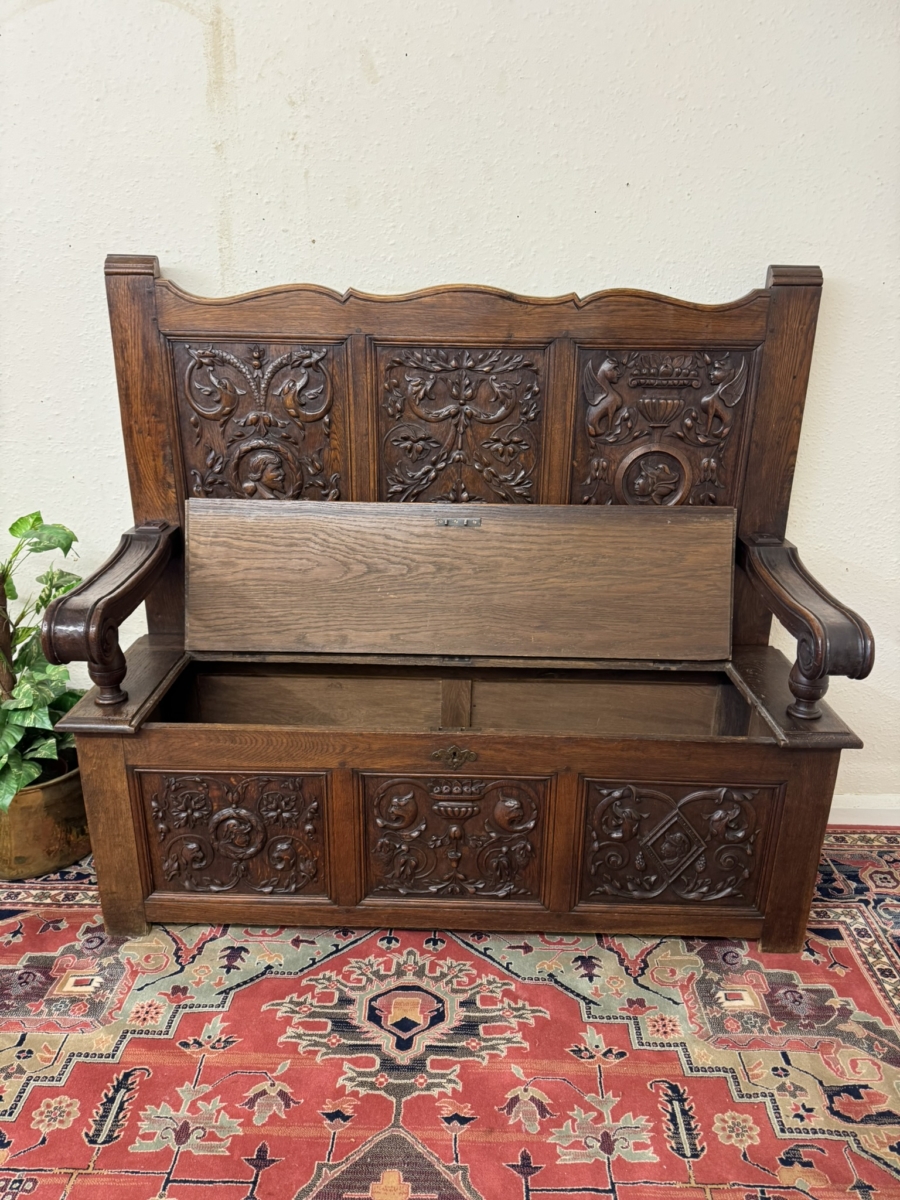 This exceptional quality bench dates circa 1870 and is in excellent condition. Shaped top sits above three profusely carved back panels. It has a pair of curved arms, lift up seat and offers ample storage, recessed panelled sides and having three carved panels to the front. This fine bench sits on traditional block feet.