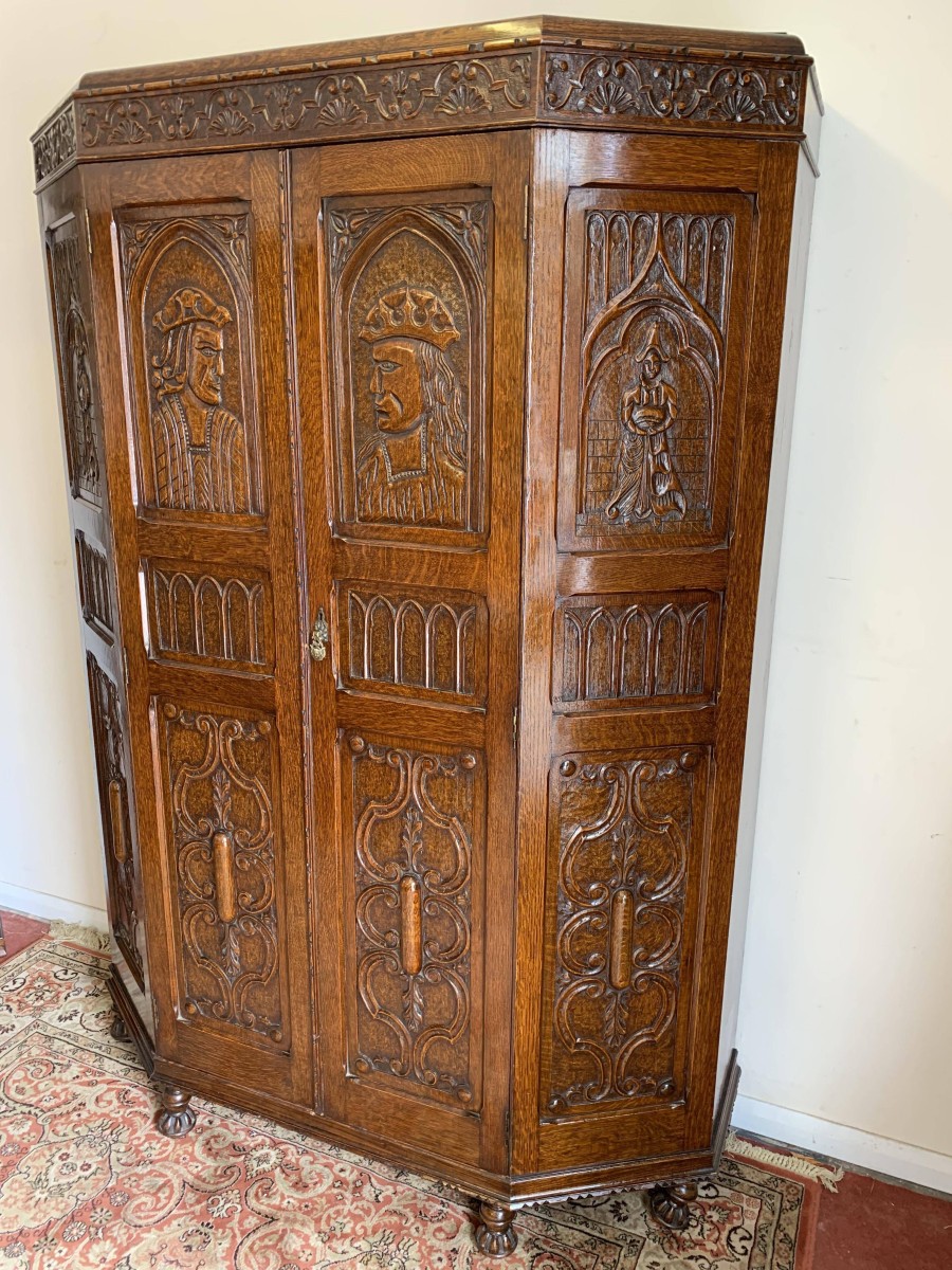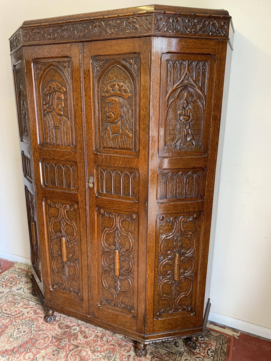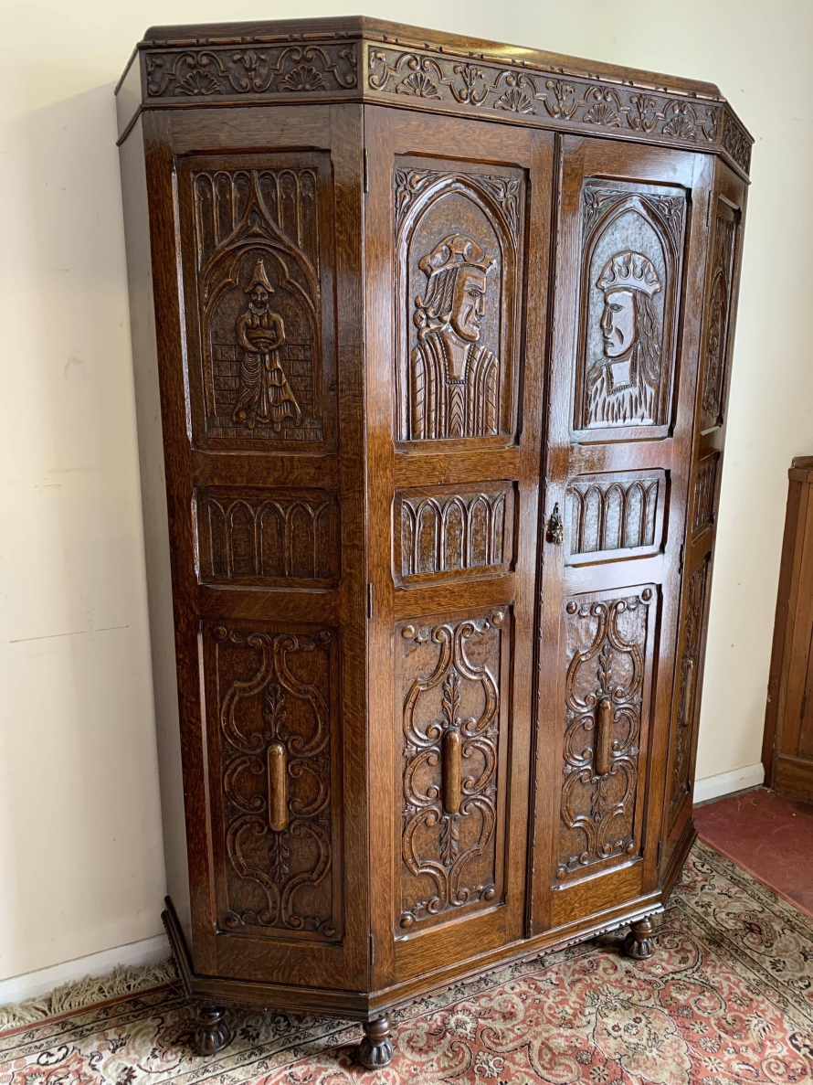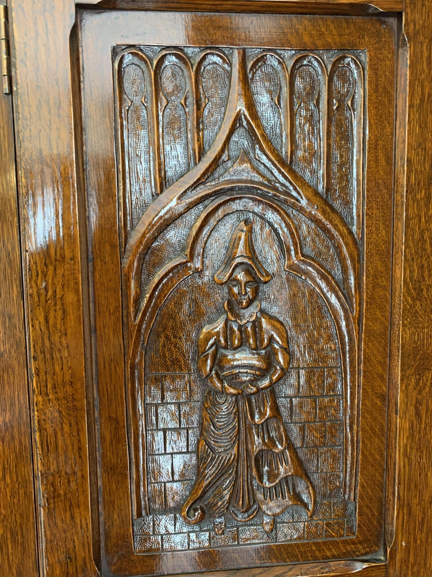 we are delighted to offer this exceptional quality solid oak item of English furniture. The cabinet has a removable heavily carved canted cornice, below are a central pair of doors flanked by a pair of panels. Both the doors and the panels have carved figures to the top, central Gothic arch window carvings with finely carved floral carvings below. The doors open to reveal a brass hanging rail below a wooden shelf, behind the right-hand door is a dressing mirror. This stunning item of furniture star stands on four carved turned feet to the front. Please note this item is made entirely of solid oak.